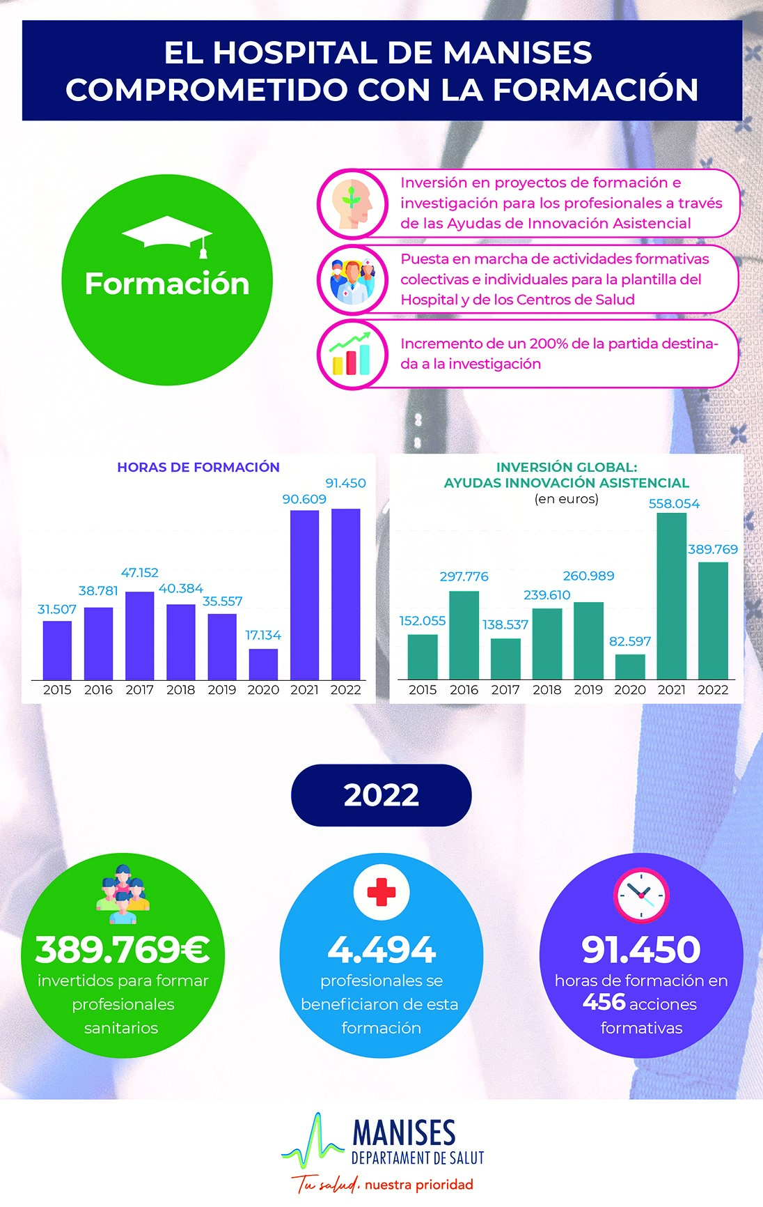 En su primera convocatoria lanzada en 2021, el Departamento de Salud de Manises financió para sus profesionales 322 acciones formativas, entre ellas másteres y estudios de postgrado, estancias formativas, actividades formativas individuales o cursos de formación colectiva interna, entre otras.