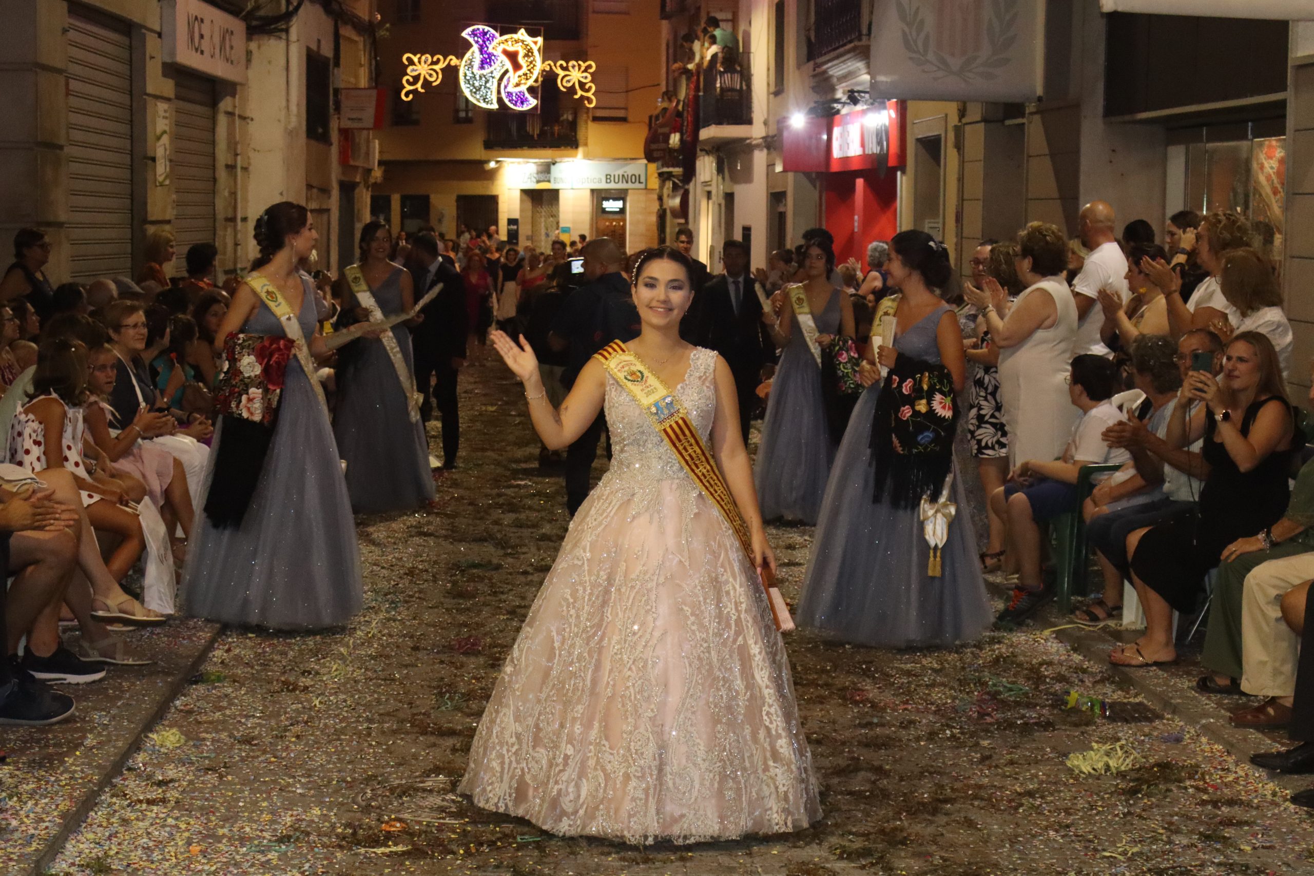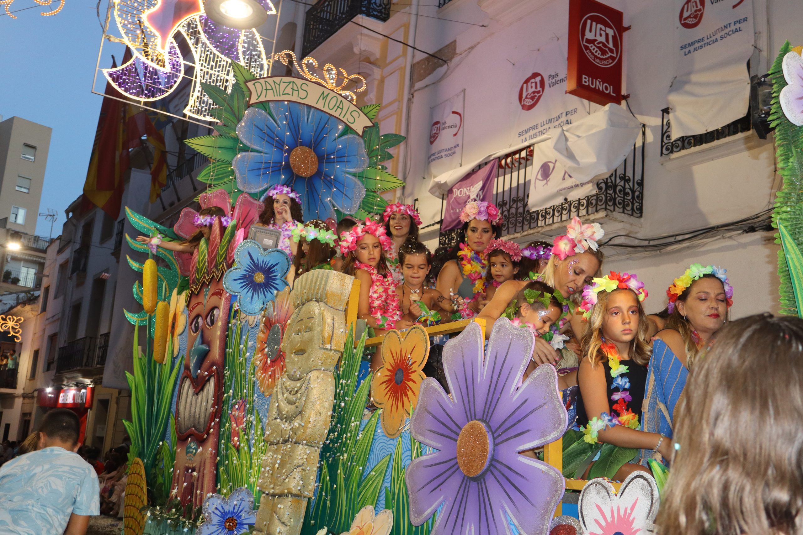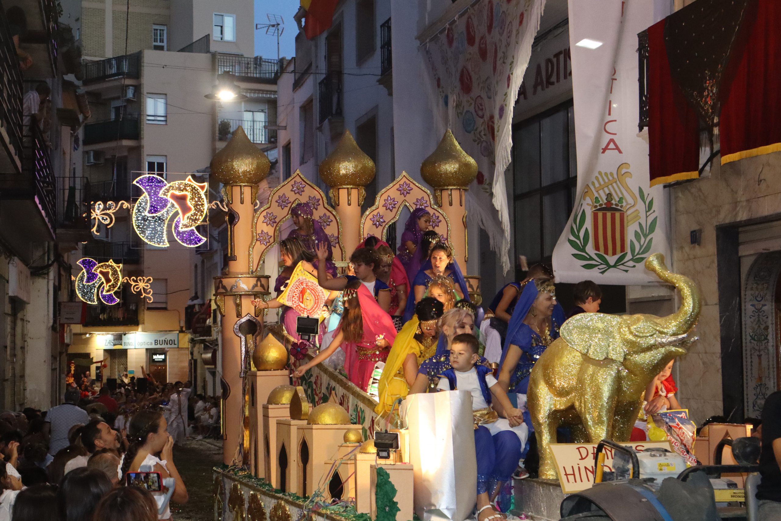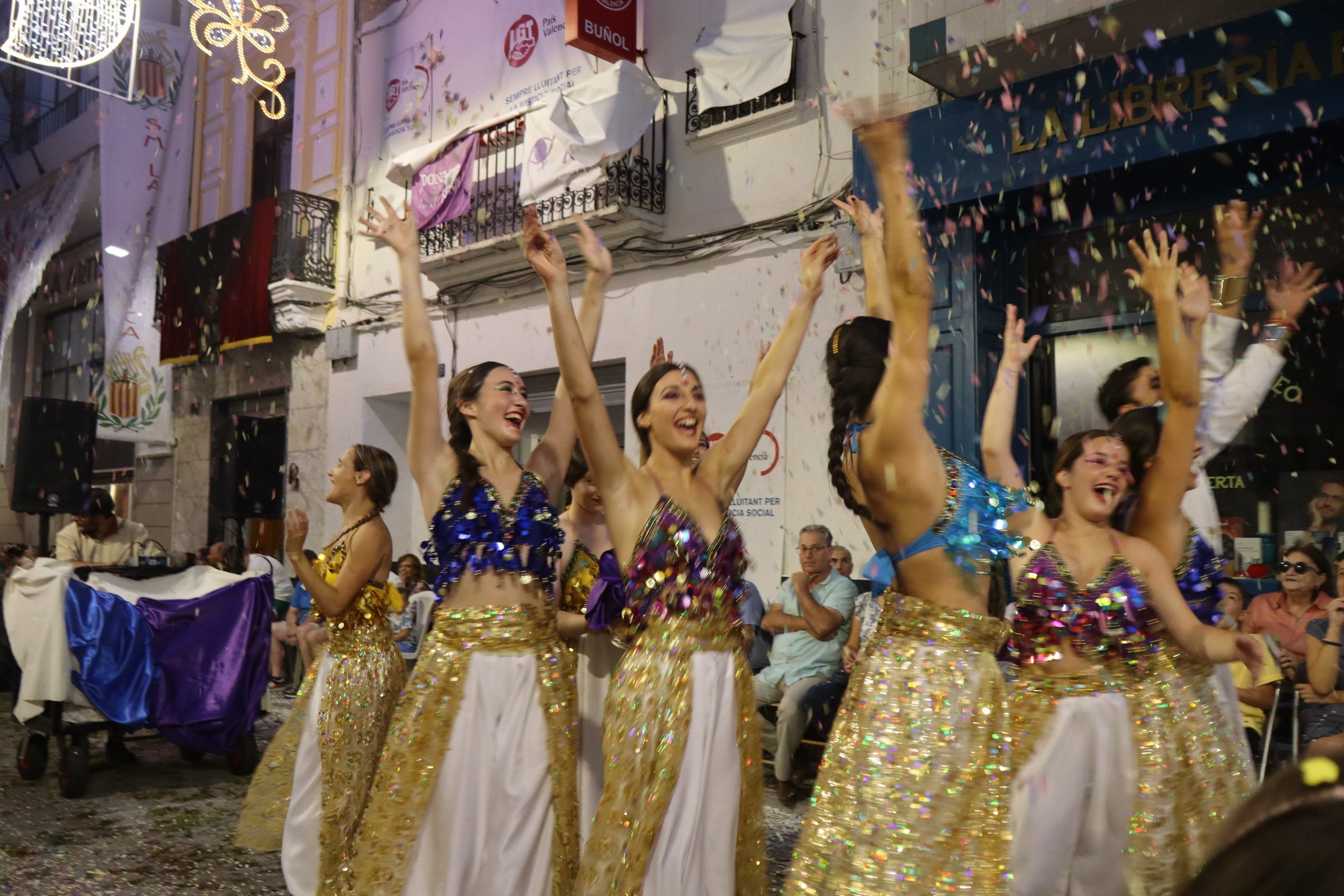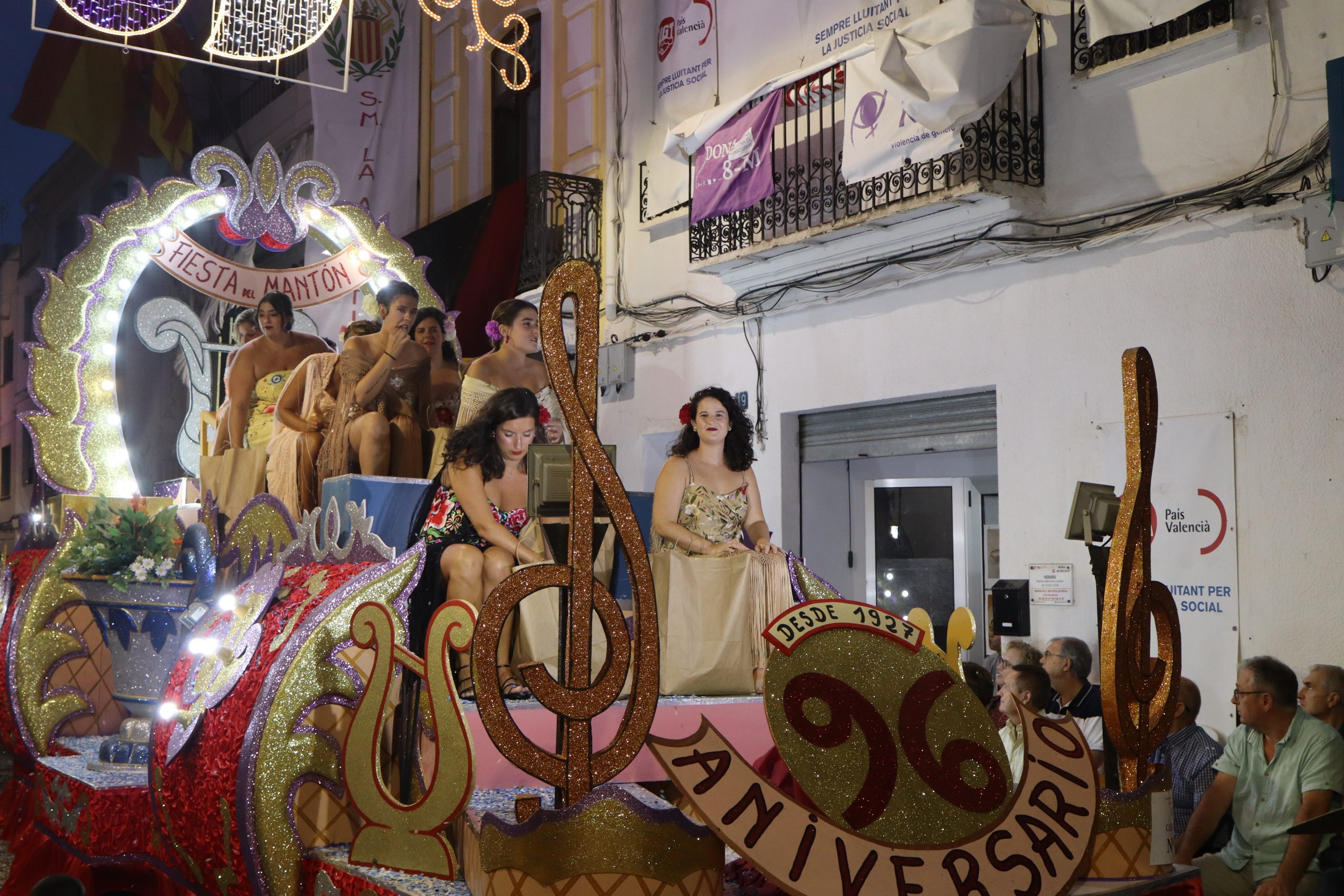 El desfile se cerró con la carroza de las Reinas y Representante del año pasado, mientras que las de este ejercicio –Paula Gisbert, Virginia Miñana Carrascosa y Sira Blanes García– desfilaron a pie por las calles buñolenses, acompañadas de diferentes formaciones musicales. La última, como no, «La Artística» de Buñol, dirigida por Mario Ortuño y que acompañaba a la Reina del «Mantón» y a la Junta Directiva, Presidida por Francisco Blasco.