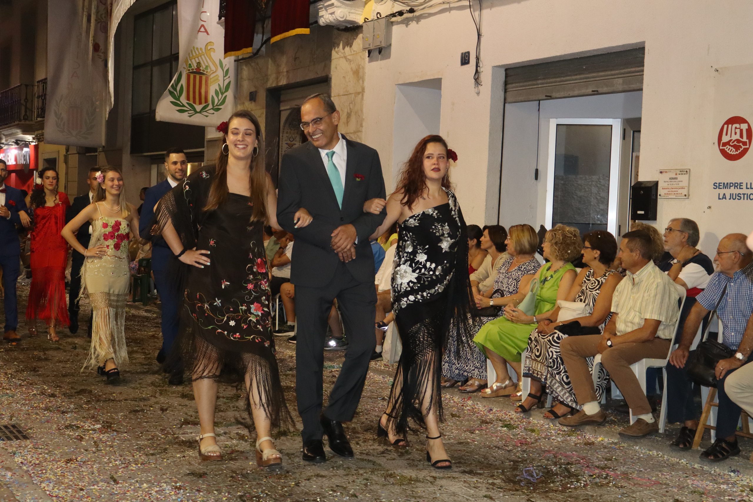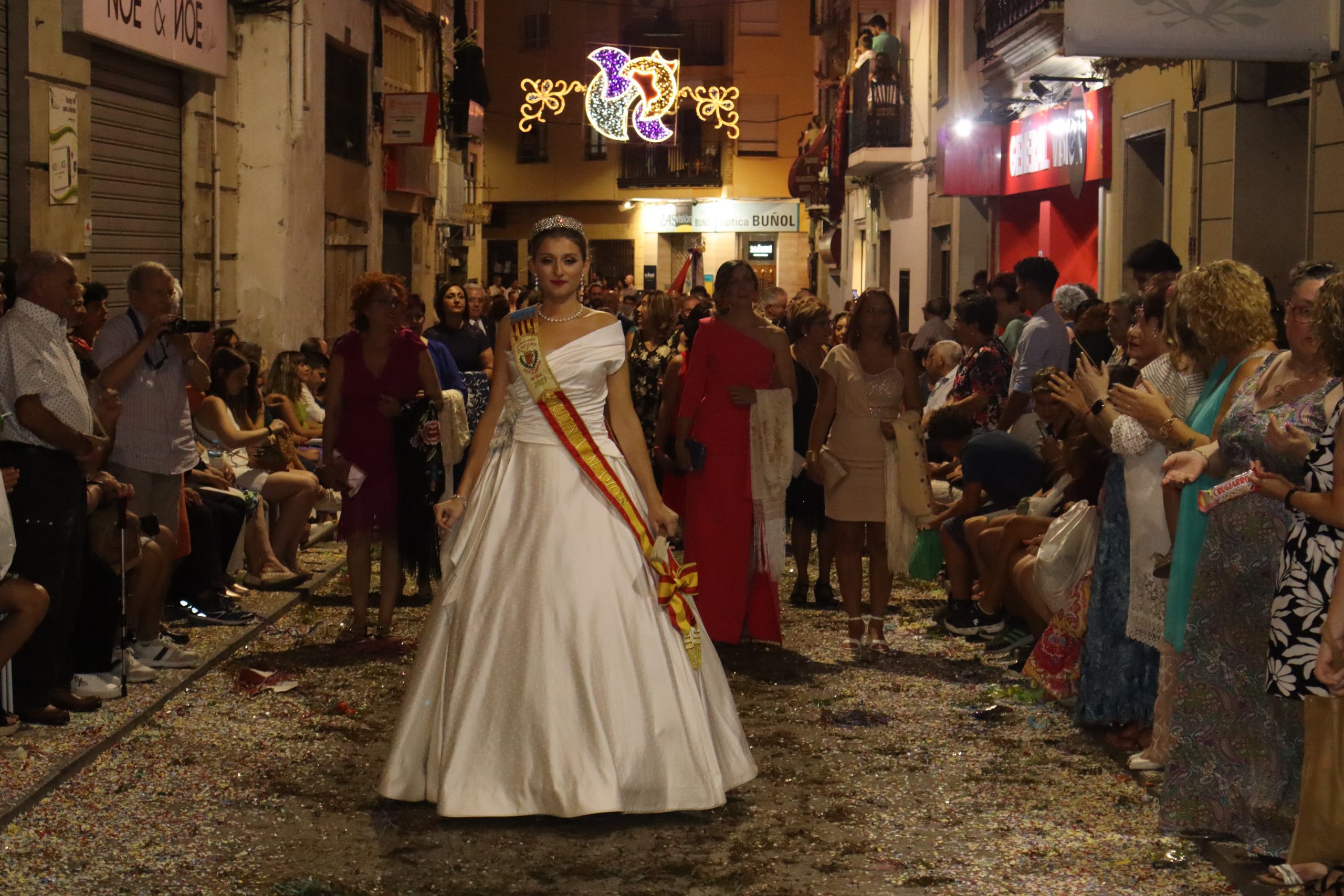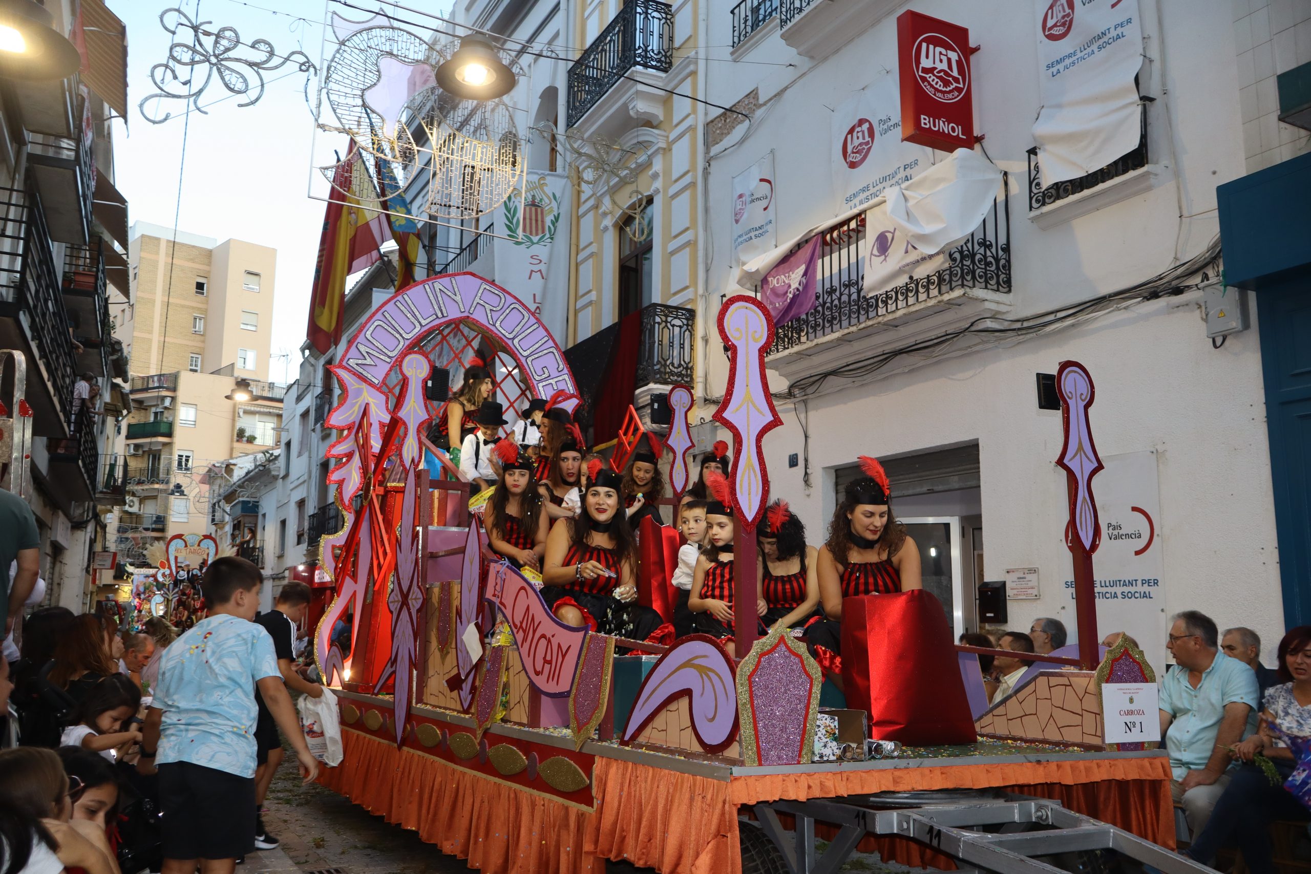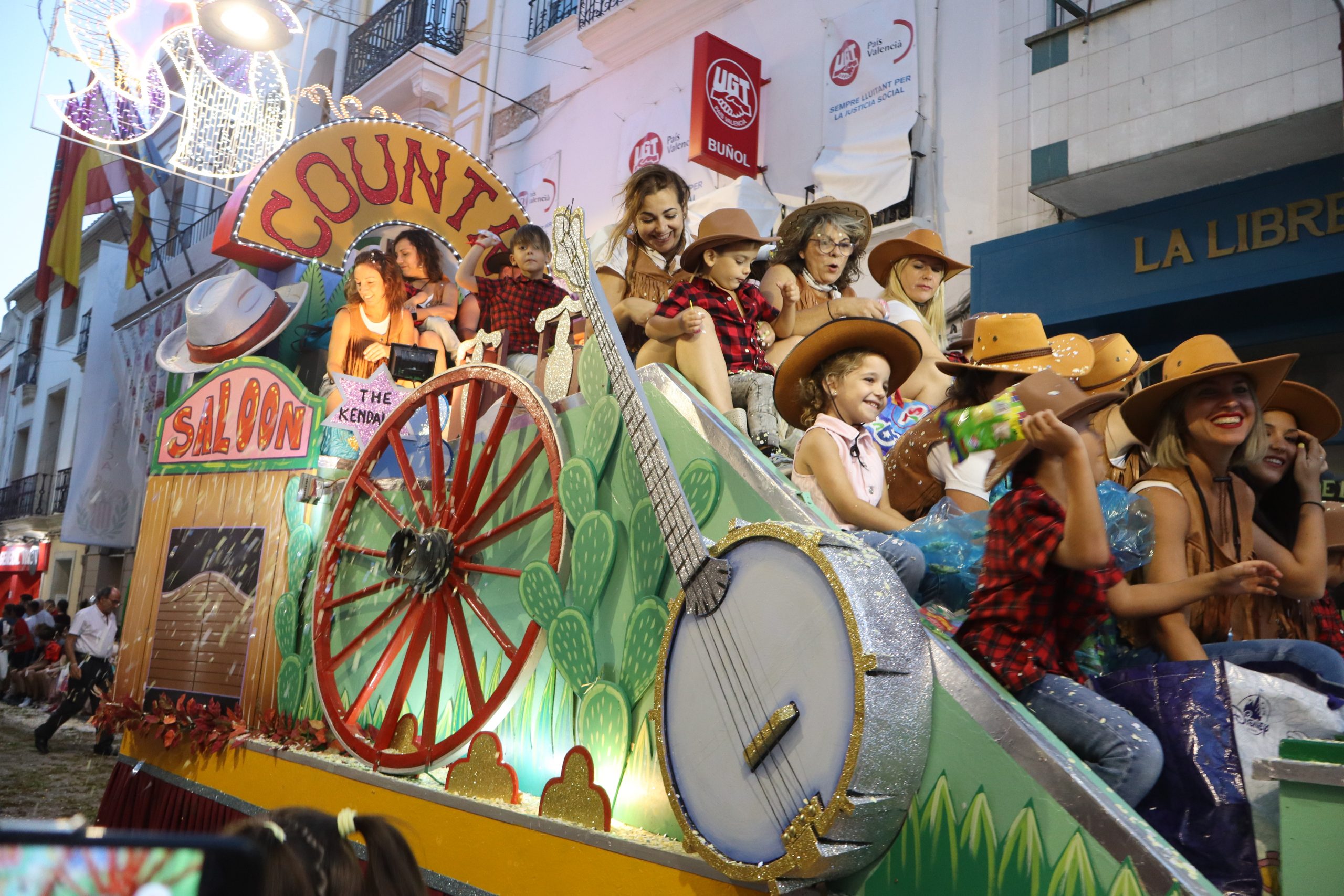 El desfile se cerró con la carroza de las Reinas y Representante del año pasado, mientras que las de este ejercicio –Paula Gisbert, Virginia Miñana Carrascosa y Sira Blanes García– desfilaron a pie por las calles buñolenses, acompañadas de diferentes formaciones musicales. La última, como no, «La Artística» de Buñol, dirigida por Mario Ortuño y que acompañaba a la Reina del «Mantón» y a la Junta Directiva, Presidida por Francisco Blasco.