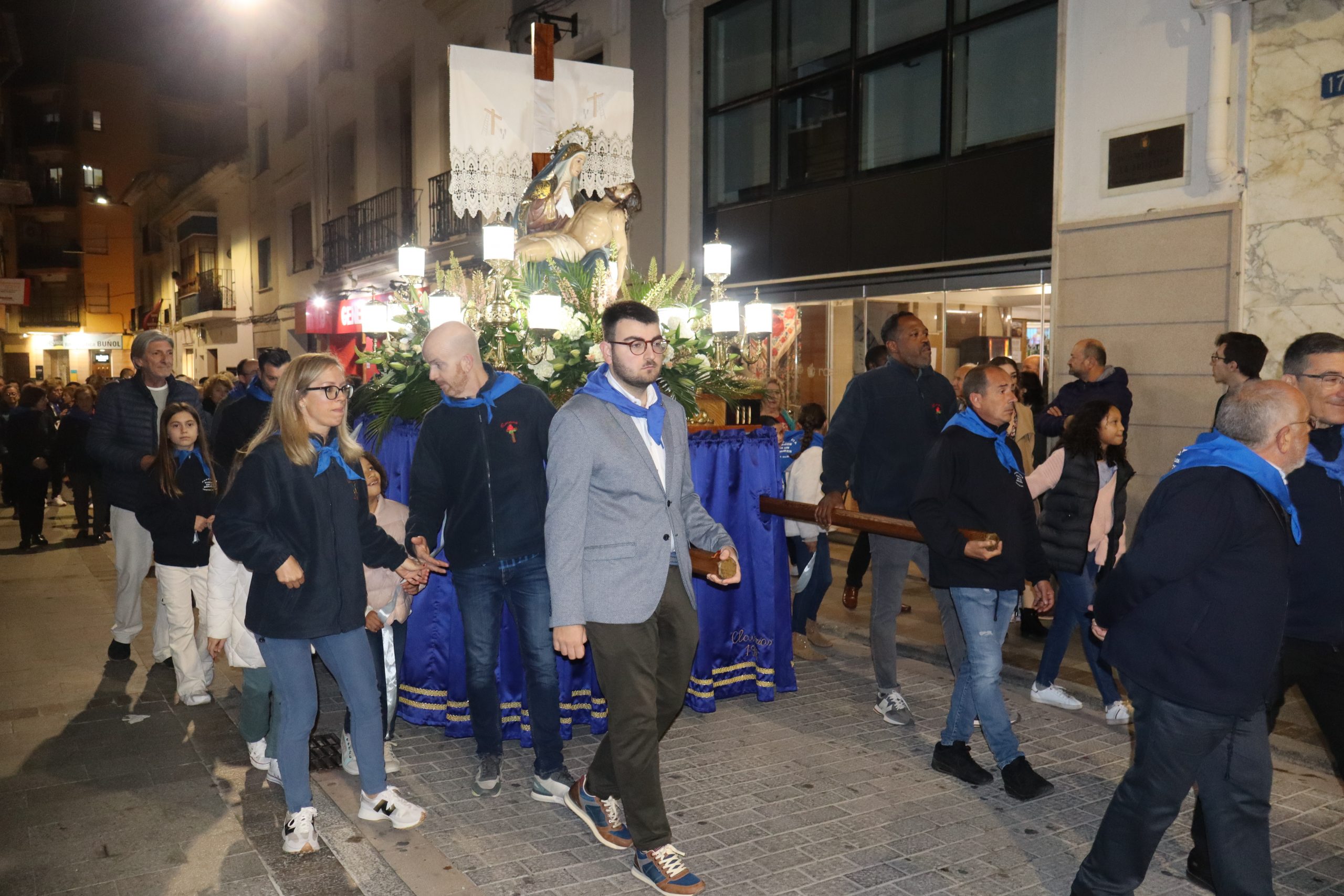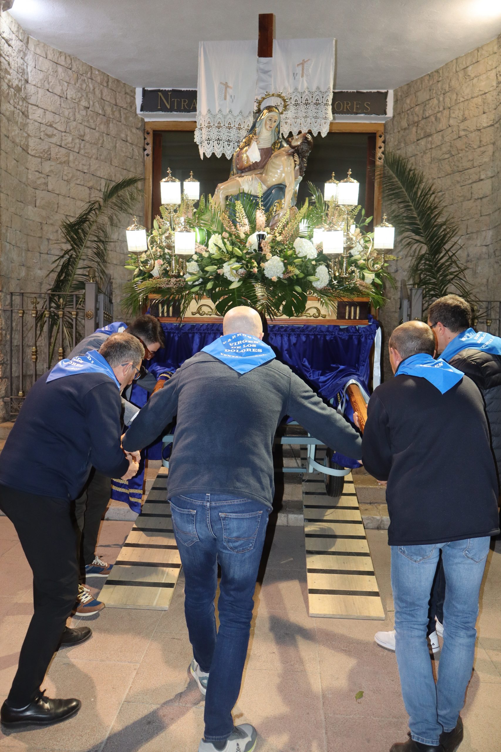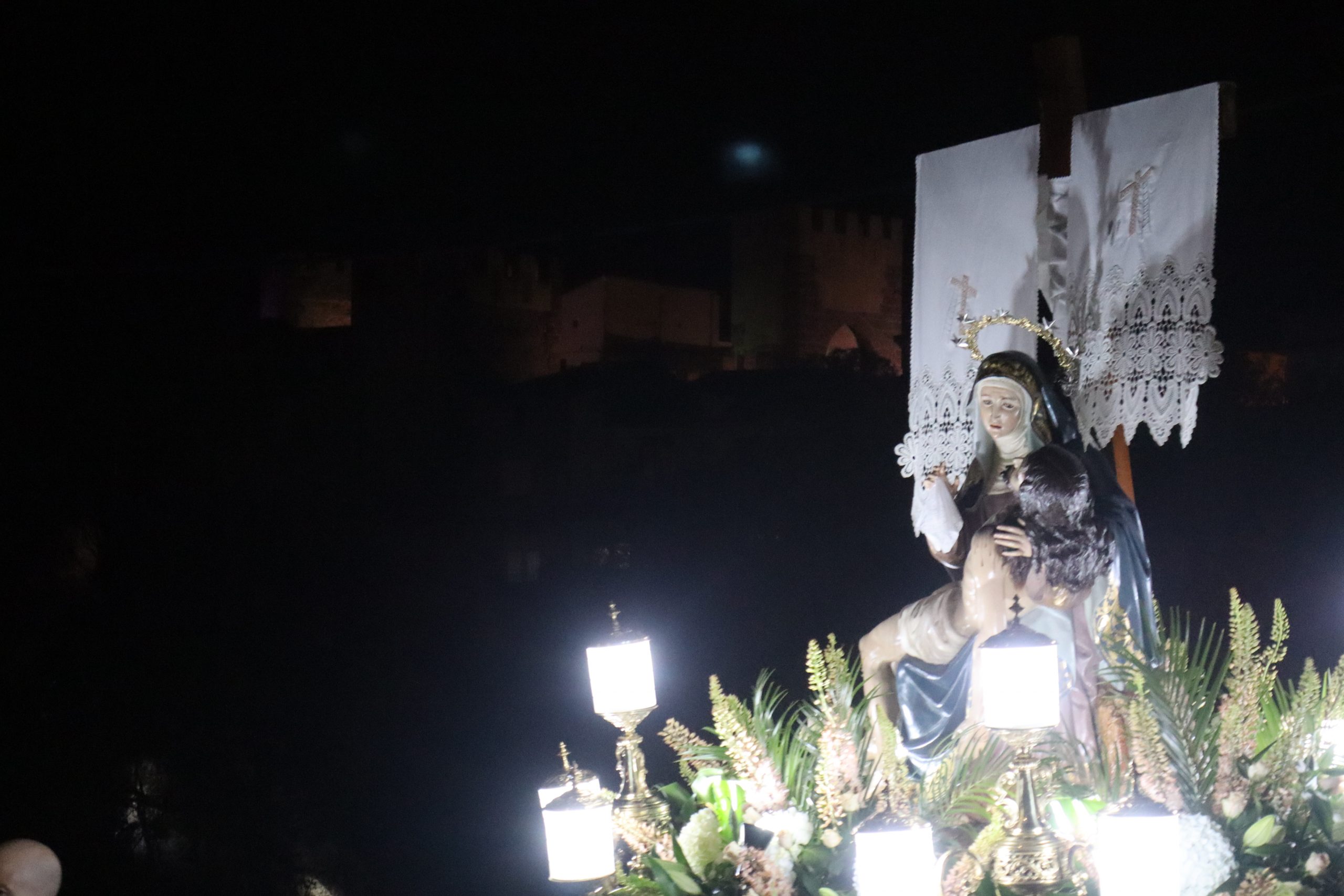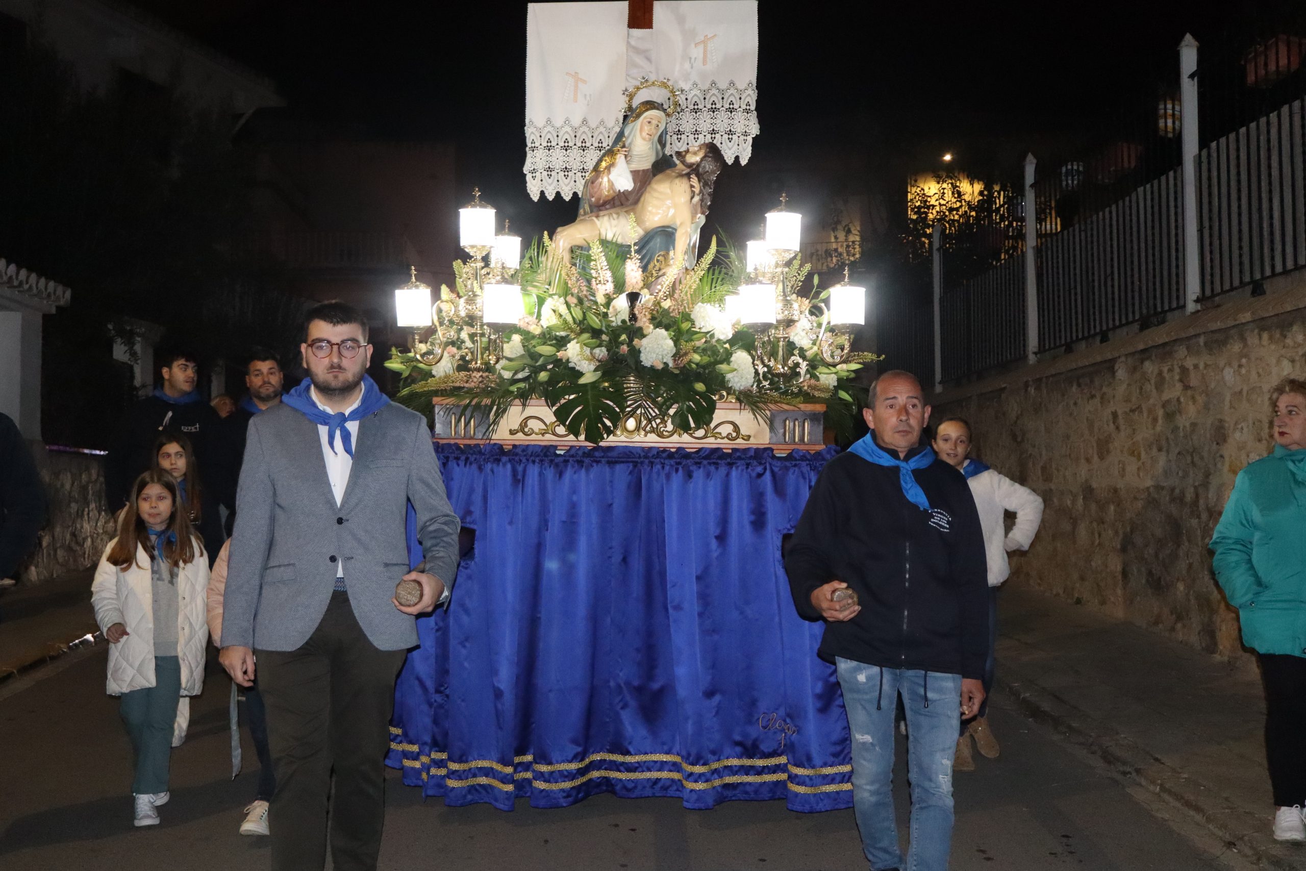 Ya por la tarde, a las ocho, se realizó el traslado en romería de la Virgen Nuestra Señora de los Dolores desde la parroquia que lleva su nombre hasta iglesia de San Pedro Apóstol. Esta romería fue presidida por párroco de localidad Enrique Boronat y los vicarios parroquiales Arturo y Borja, que estuvieron acompañados por la alcaldesa de la localidad, Virginia Sanz y el equipo de gobierno. También participaron las reinas del Mantón, la junta directiva y la banda del Sociedad Musical La Artística. En la procesión participaron además, los clavarios y los cofrades de honor y la junta directiva de la cofradía.