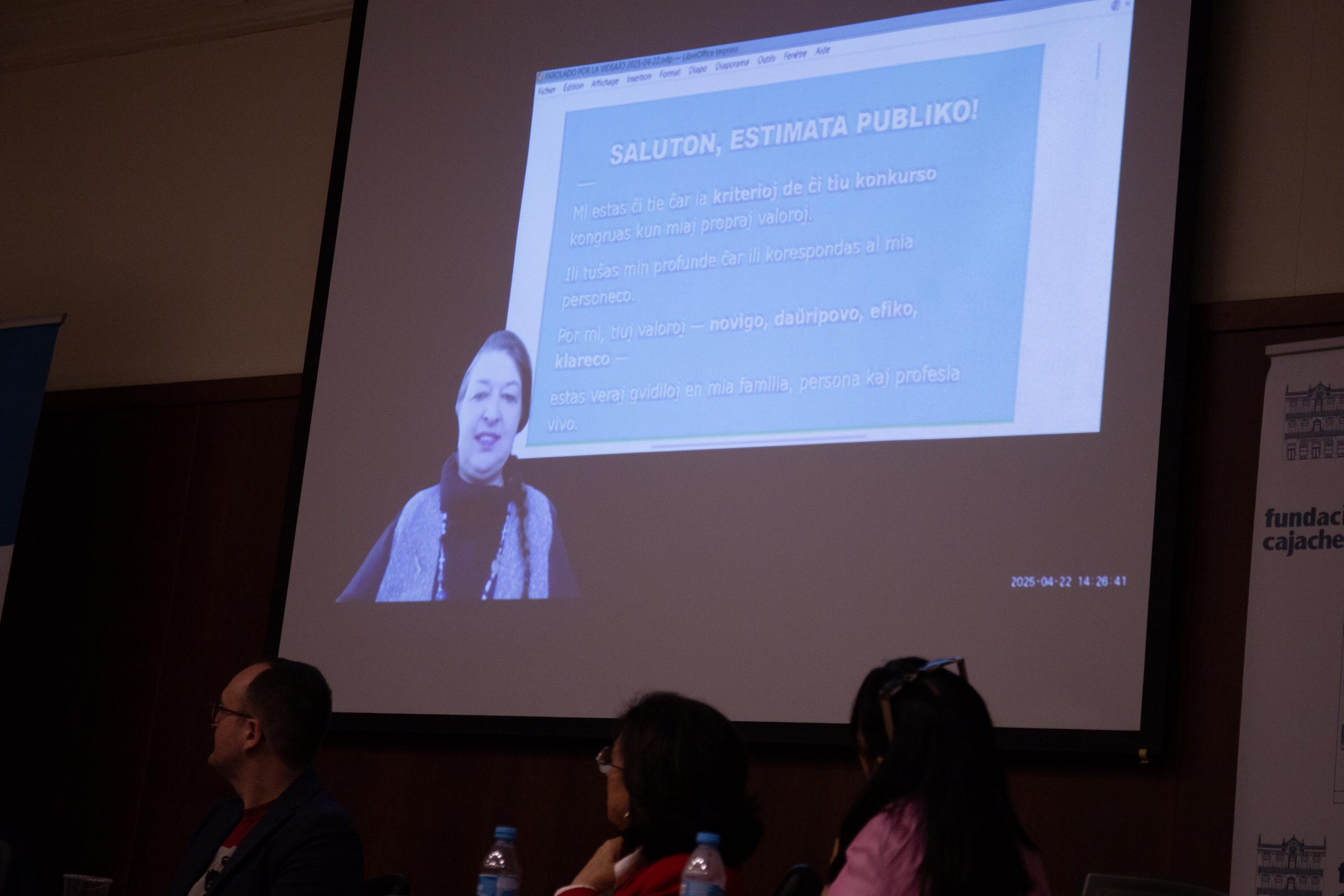 Antes de dar paso a la entrega de premios, el presidente de la agrupación Esperantista de Valencia, Raúl Salinas, también quiso dedicar unas palabras al público asistente para felicitar a los organizadores de la iniciativa y destacar la calidad de los trabajos presentados. “Me emocioné cuando me pidieron colaboración en este concurso porque normalmente para el Esperanto no se dedica dinero y sin embargo nos encontrábamos en esta ocasión con premios interesantes para incentivar la participación. Se han presentado un montón de buenas ideas y muy valiosas para la difusión del Esperanto y para la reflexión, esperamos poder publicarlos pronto para darlos a conocer”, apuntó Salinas, quién también emplazó a los asistentes al próximo 83º Congreso esperantista que se celebrará en Soria el próximo fin de semana.