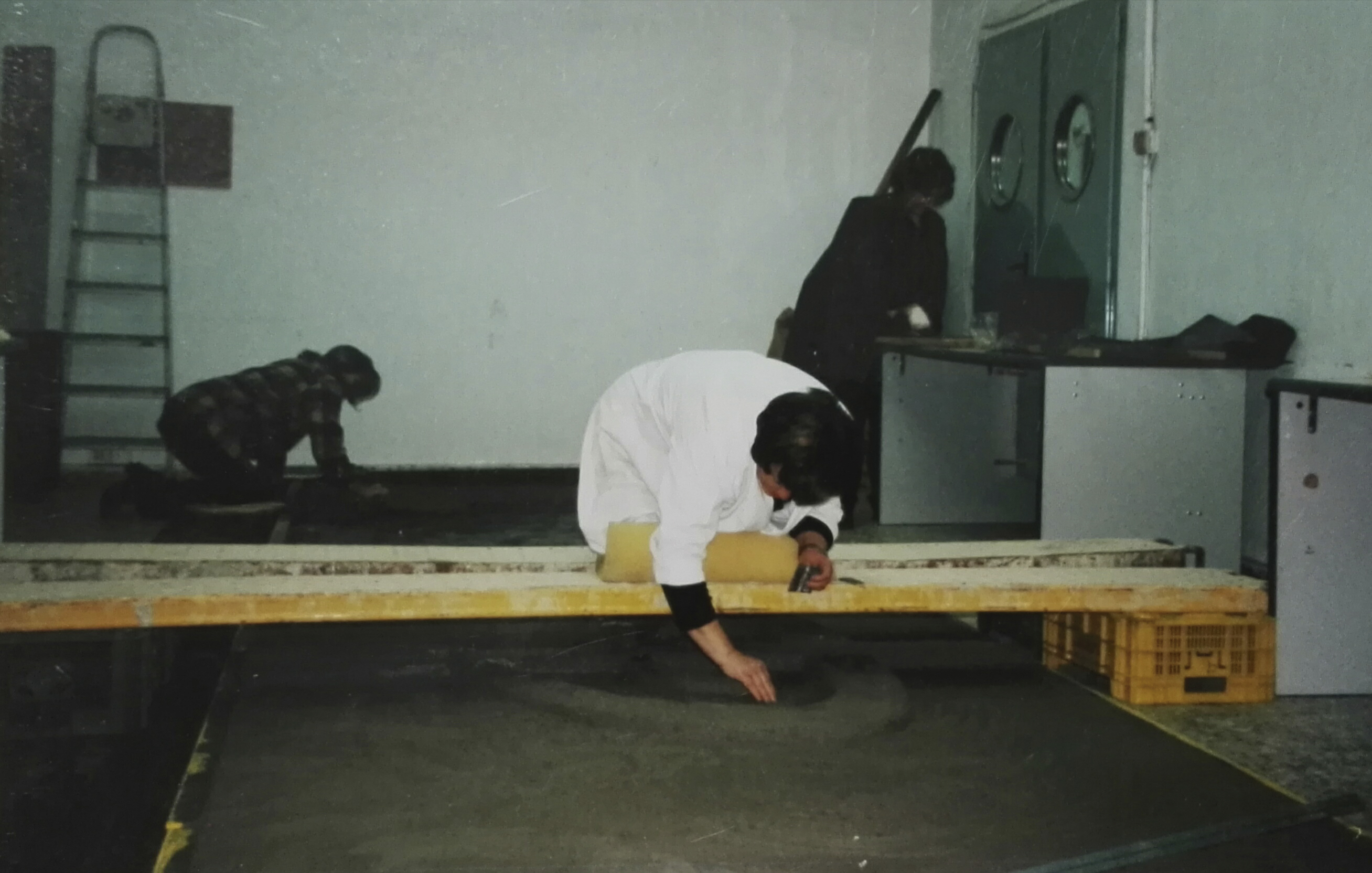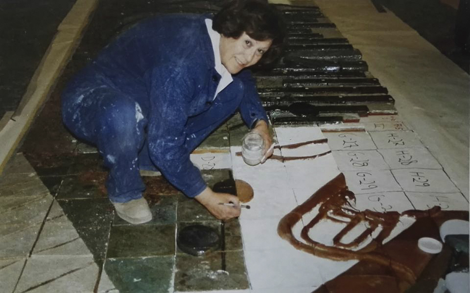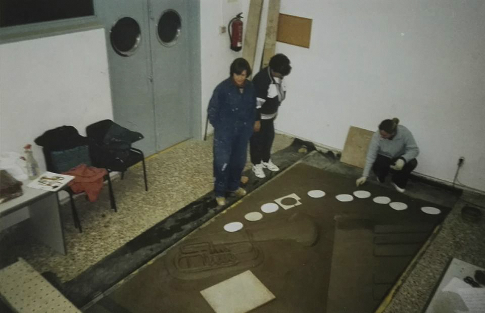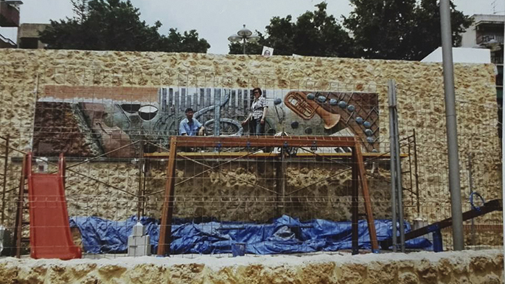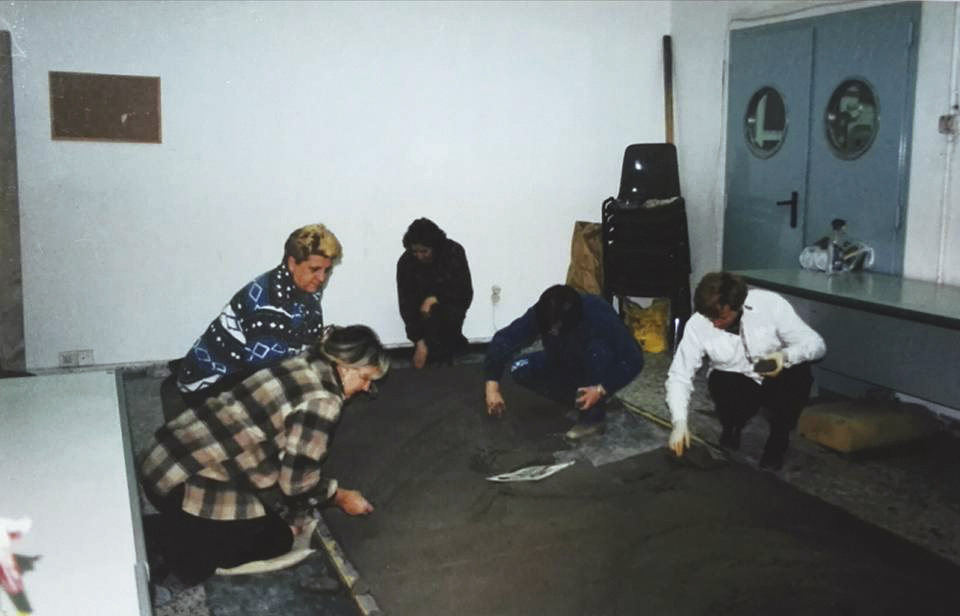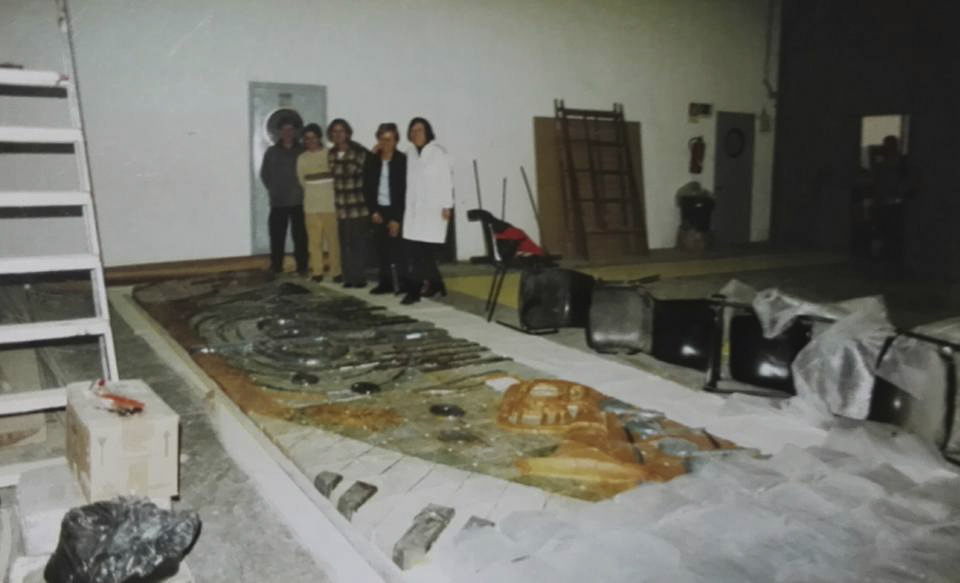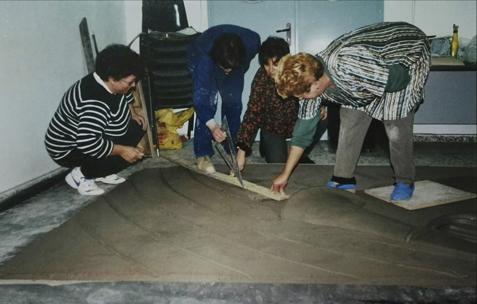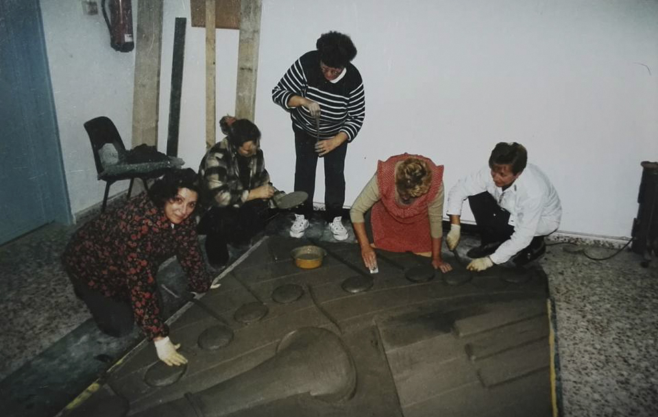Primero hice los cálculos necesarios para trasladar el diseño al tamaño real y nos pusimos a trabajar. Era un reto importante trazar una obra de tamaña envergadura horizontalmente, en el suelo, cuando su posición final iba a ser en vertical. La visión podría resultar muy diferente. El tamaño del mural, algo más de nueve metros en crudo, ocupaba toda la longitud del aula. Trabajamos de rodillas sobre puentes metálicos cruzados sobre la obra, es decir, cabeza abajo. La anchura del local daba para tener unas mesas en paralelo que me permitieron colocar sobre ellas una escalera de siete peldaños y, desde lo alto, comprobar que las figuras representadas “no se caían”, que tenían la verticalidad correcta.