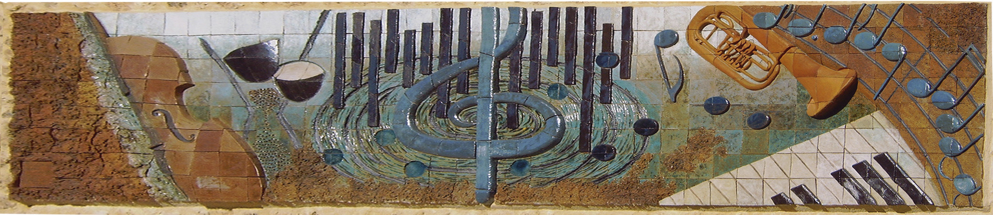 Hace ya quince años que, nada más pasar la Feria, recibí el encargo de realizar un mural que hablase de la música en Buñol y, por lo tanto, de sus bandas. Me pareció un reto muy importante y de mucha envergadura. Hacían falta manos y compromiso, y así se lo dije a las mujeres que quería que trabajaran conmigo, mis alumnas desde el curso 1998/99. Me dijeron que adelante y comencé a pensar en él. Tenía libertad de formato y, de entrada, decidí hacer una franja horizontal equilibrada, eso lo tenía claro.