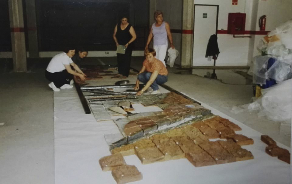 Las cocciones fueron largas y constantes dadas las pequeñas dimensiones del horno del que disponíamos.Las piezas eran muchísimas, bastantes de ellas con mucho grosor y tenían que ser horneadas dos veces por lo menos (algunas, varias veces más). Una vez acabado, para facilitar su colocación, hice un plano a tamaño natural con todas las piezas marcadas, adjudicándoles una letra para su posición horizontal y un número para la vertical y con esos datos se etiquetaron cada una de ellas. Habíamos llegado a tiempo. Un albañil extraordinario, Vicente Ramón Iranzo, se encargó de colocarlo. Vuelvo a felicitarlo desde aquí por realizar el trabajo con extrema delicadeza. Supo entender la obra y darle el punto final.