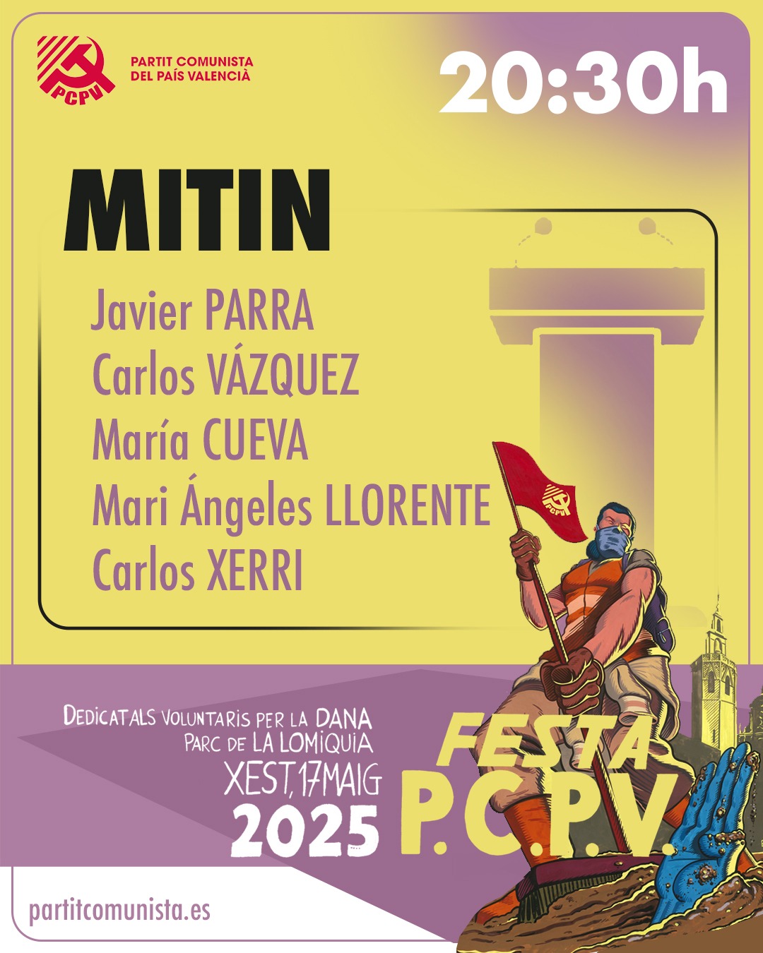 Redacción.- Este sábado 17 de mayo, el Partit Comunista del País Valencià (PCPV) celebrará su Fiesta Anual 2025 en el Parque de la Lomiquia de Cheste, en una jornada que combinará reflexión política, actos culturales y actividades lúdicas. Este año, el partido ha elegido Cheste como sede del evento en reconocimiento a la fuerte afectación que sufrió el municipio durante la DANA del pasado 29 de octubre.