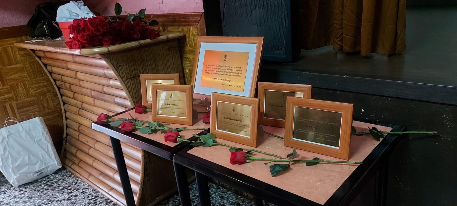 Una vez nombrados, los presidentes fueron los encargados de entregar las placas conmemorativas con nombramiento a título póstumo a los compañeros fallecidos del partido, D. Luis Sáez Sáez, D. José Barberá Pèrez y José Enrique Sáez Galdón, en reconocimiento a su meritoria labor y dedicación. El acto concluyó con la colocación de una placa en la Sociedad Obrera la Fundamental “en homenaje a todas las personas que vivieron, lucharon y murieron, por la libertad y la igualdad con sus ideales socialistas para que su recuerdo permanezca vivo entre nosotros”.