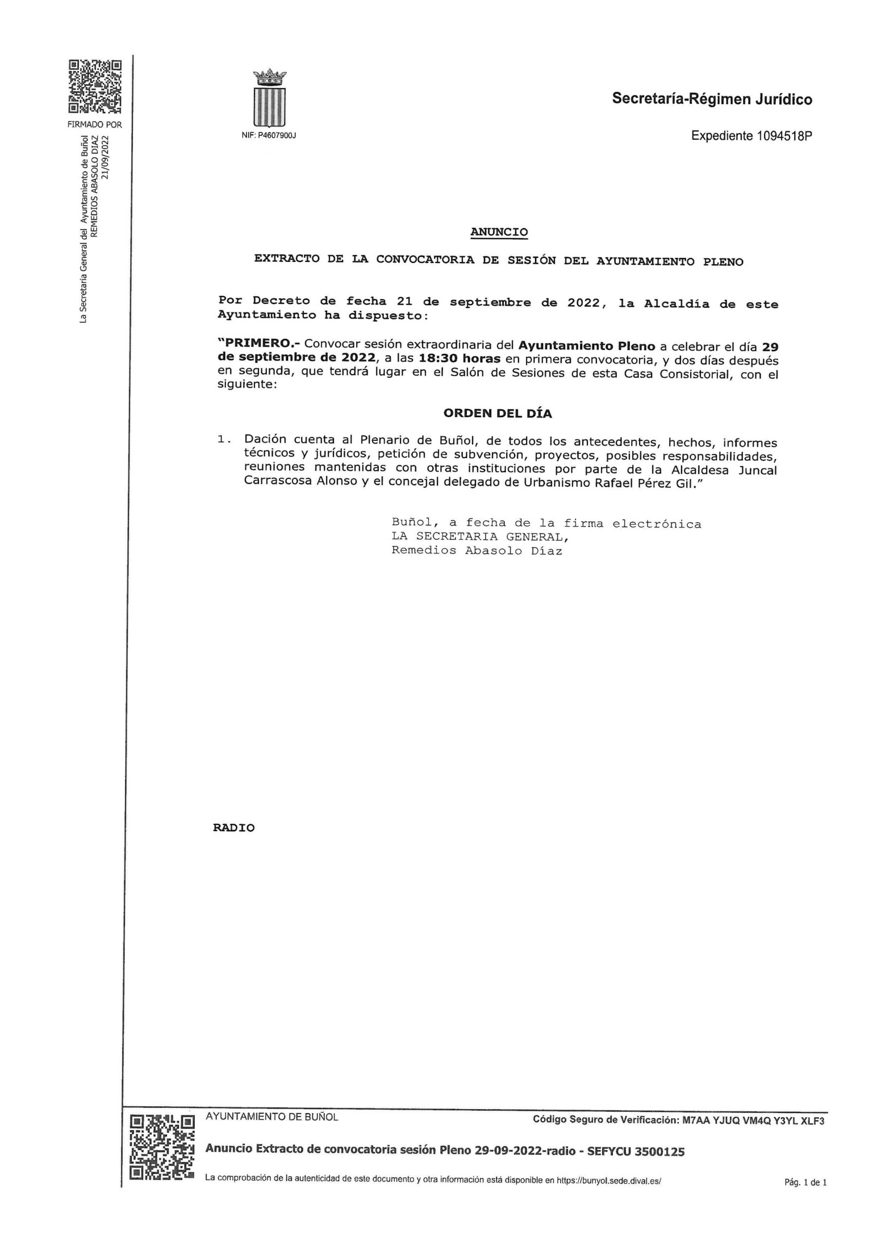 Tres días más tarde, el jueves 29 de septiembre, también a partir de las 1830 en el salón de plenos del Ayuntamiento de Buñol, se celebrará un pleno extraordinario en el que el único punto del orden del día se dedicará al derrumbe del muro que sostenía la calle Moratín: «Dación cuenta al Plenario de Buñol, de todos los antecedentes, hechos, informes técnicos y jurídicos, petición de subvención, proyectos, posibles responsabilidades, reuniones mantenidas con otras instituciones por parte de la Alcaldesa Juncal Carrascosa Alonso y el concejal delegado de Urbanismo Rafael Pérez Gil.»