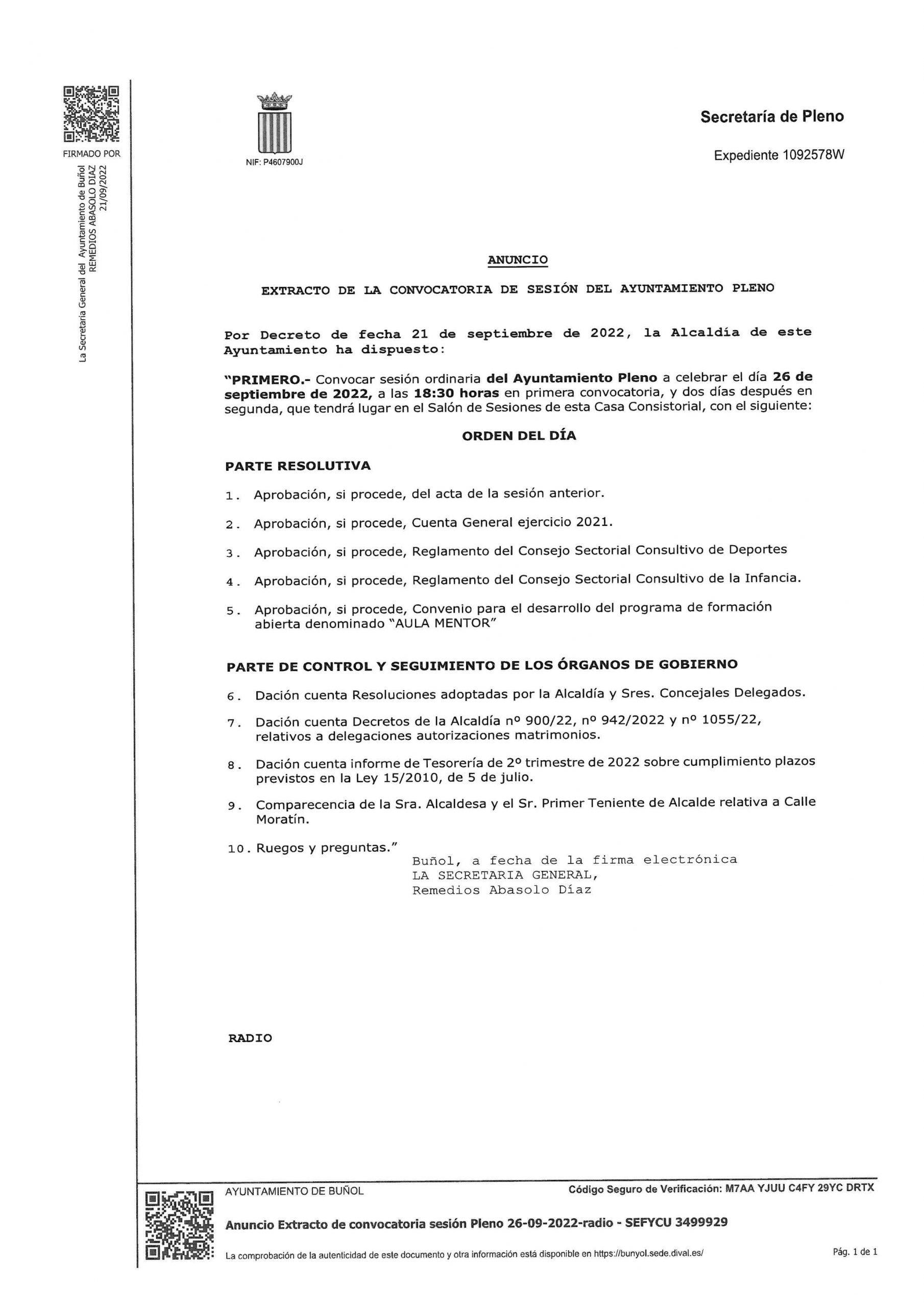 Este lunes 26 de septiembre se celebra un pleno ordinario a partir de las 18.30 en el salón de plenos del Ayuntamiento de Buñol que incluirá una primera «Parte resolutiva» y una segunda «Parte de control y seguimiento de los órganos de gobierno». En esta segunda parte destaca el punto 9, en el que comparecerán Juncal Carrascosa y Rafael Pérez para hablar sobre el tema del derrumbe de la calle Moratín. Posteriormente se dará paso a «Ruegos y preguntas».