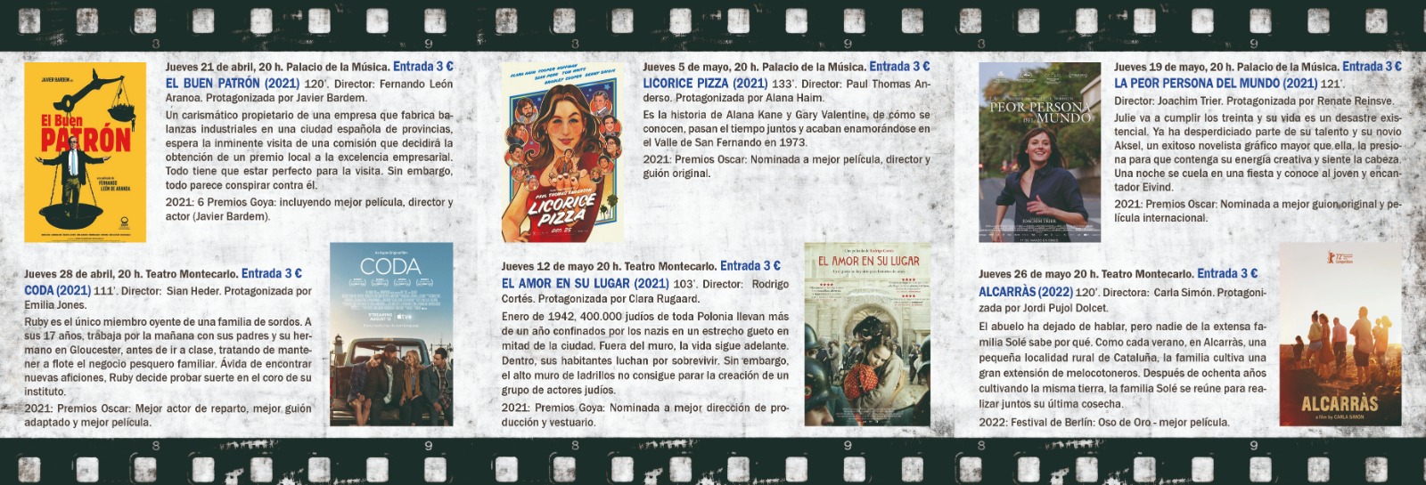 Todos los jueves desde hoy 21 de abril hasta el 26 de mayo, en los dos teatros de la localidad de forma alterna, a las 20h y a un precio de 3€, vecinos, visitantes y cinéfilos encontrarán una excelente oferta cinematográfica actual