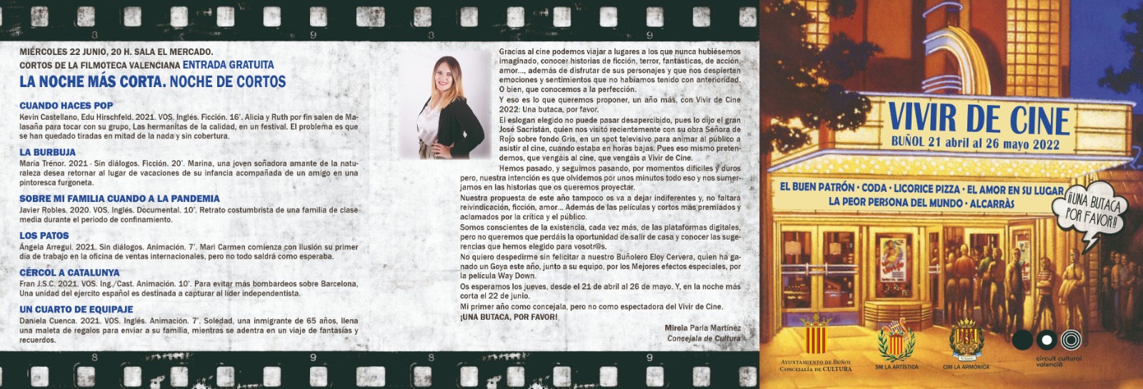 Por último, la edil de Cultura de Buñol sigue recordando que también este año se hará la Noche más corta, coincidiendo con la noche más larga del año como es el 22 de junio. A las 20h en la Sala El Mercado, se verán seis cortos de la Filmoteca Valenciana. La entrada es gratuita. Se proyectará: “Cuando haces pop”, “La burbuja”, “Sobre mi familia cuando a la pandemia”, “Los patos”, “Cércol a Catalunya” y “Un cuarto de equipaje”.