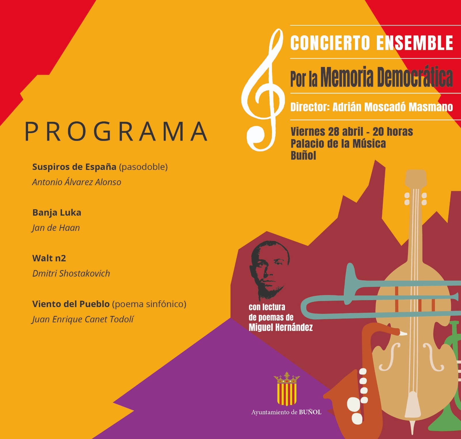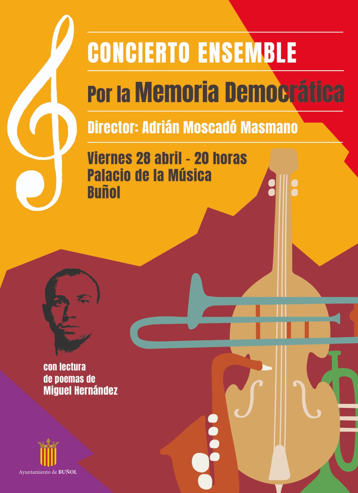 Redacción.- Este viernes el Palacio de la Música de Buñol albergará un magistral concierto a cargo del Ensemble por la Memoria Democrática. Estarán dirigidos por el buñolense Adrián Moscardó Masmano y contará con lecturas de poemas de Miguel Hernández.