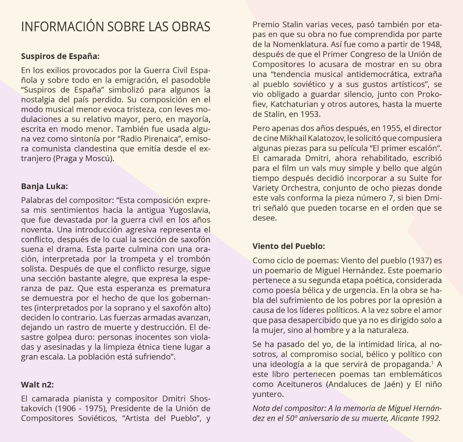Podrán escucharse las siguientes obras: Suspiros de España (pasodoble) de Antonio Álvarez Alonso; Banja Luka de Jan de Haan; Walt n2 de Dmitri Shostakovich; y Viento del Pueblo (poema sinfónico) de Juan Enrique Canet Todolí. Este acto está organizado por el Ayuntamiento de Buñol.