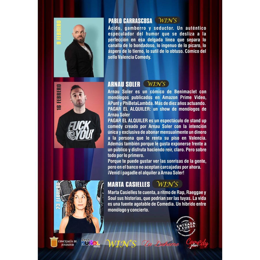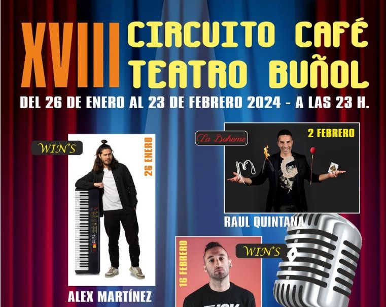 Actuarán en este circuito Álex Martínez, Raúl Quintana, Pablo Carrascosa, Arnau Soler y Marta Casielles. El Circuito Café Teatro está organizado por la Concejalía de Juventud del Ayuntamiento de Buñol y cuenta con la colaboración de los bares y pubs, Win’s y La Bohème. Cada viernes por la noche recibirán a los profesionales del humor y de la magia que deleitarán a todos los buñolenses y visitantes con excepcionales espectáculos.