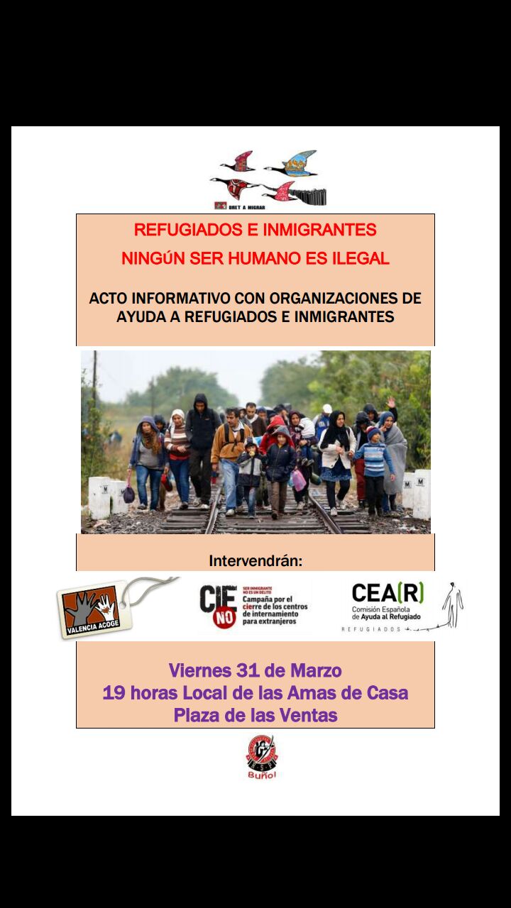 La Red de Solidaridad Popular de Buñol organizó el pasado viernes en el local de las Amas de Casa de Buñol una mesa debate sobre la situación de los refugiados en Europa. En esta mesa redonda participaron miembros del movimiento CIE No (Centros de Internamiento de Extranjeros), un representante de la asociación Valencia Acoge, el coordinador Jaume Durà y la trabajadora Gema Siscar y también acudirán representantes de la entidad CEAR, P.V. (Comisión Española de Ayuda al Refugiado).