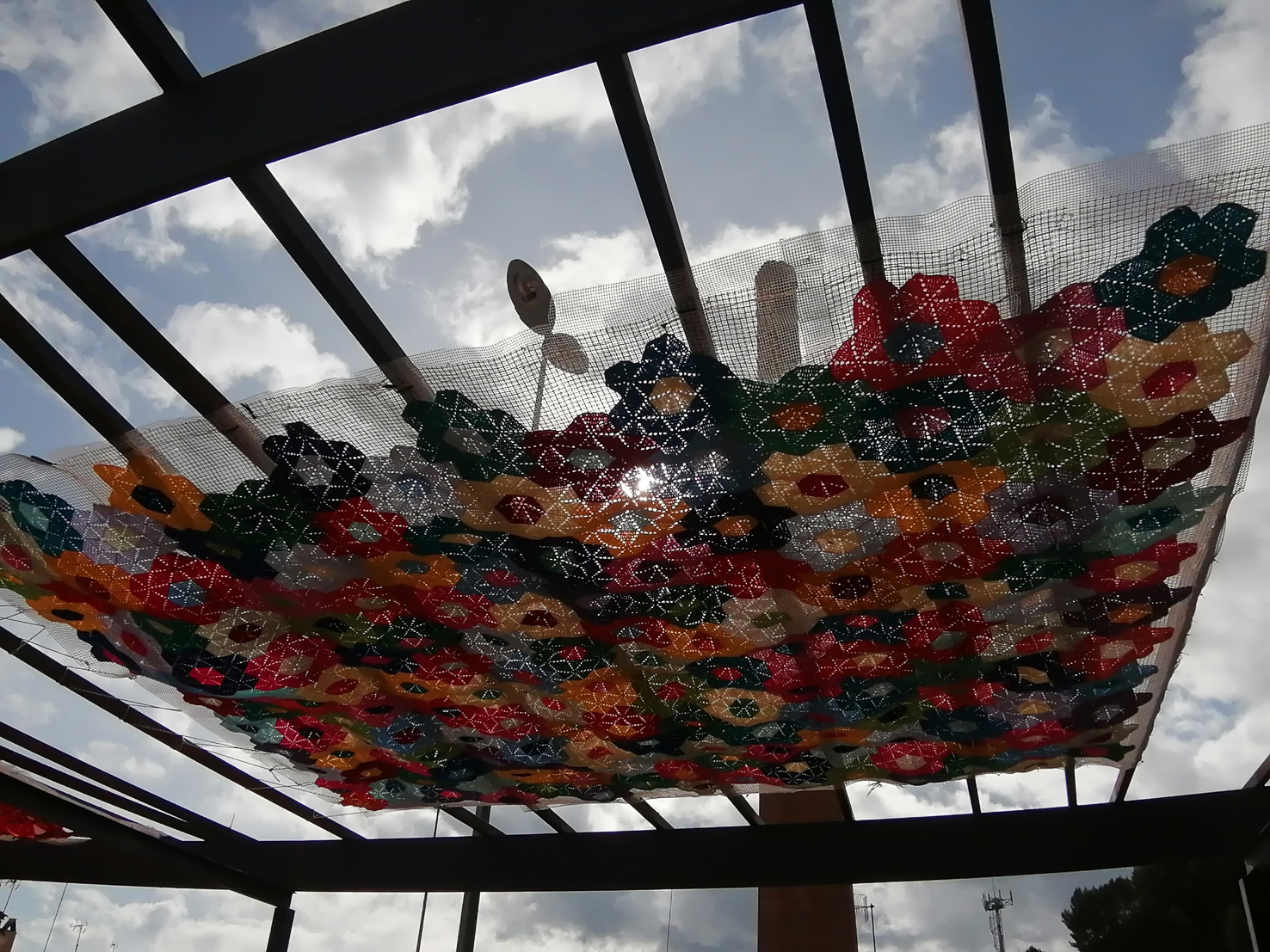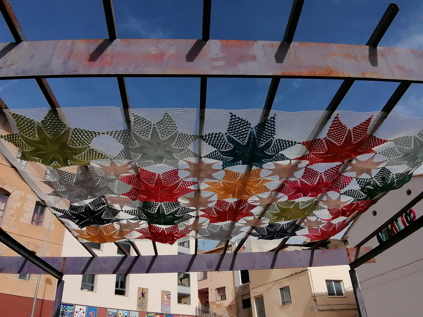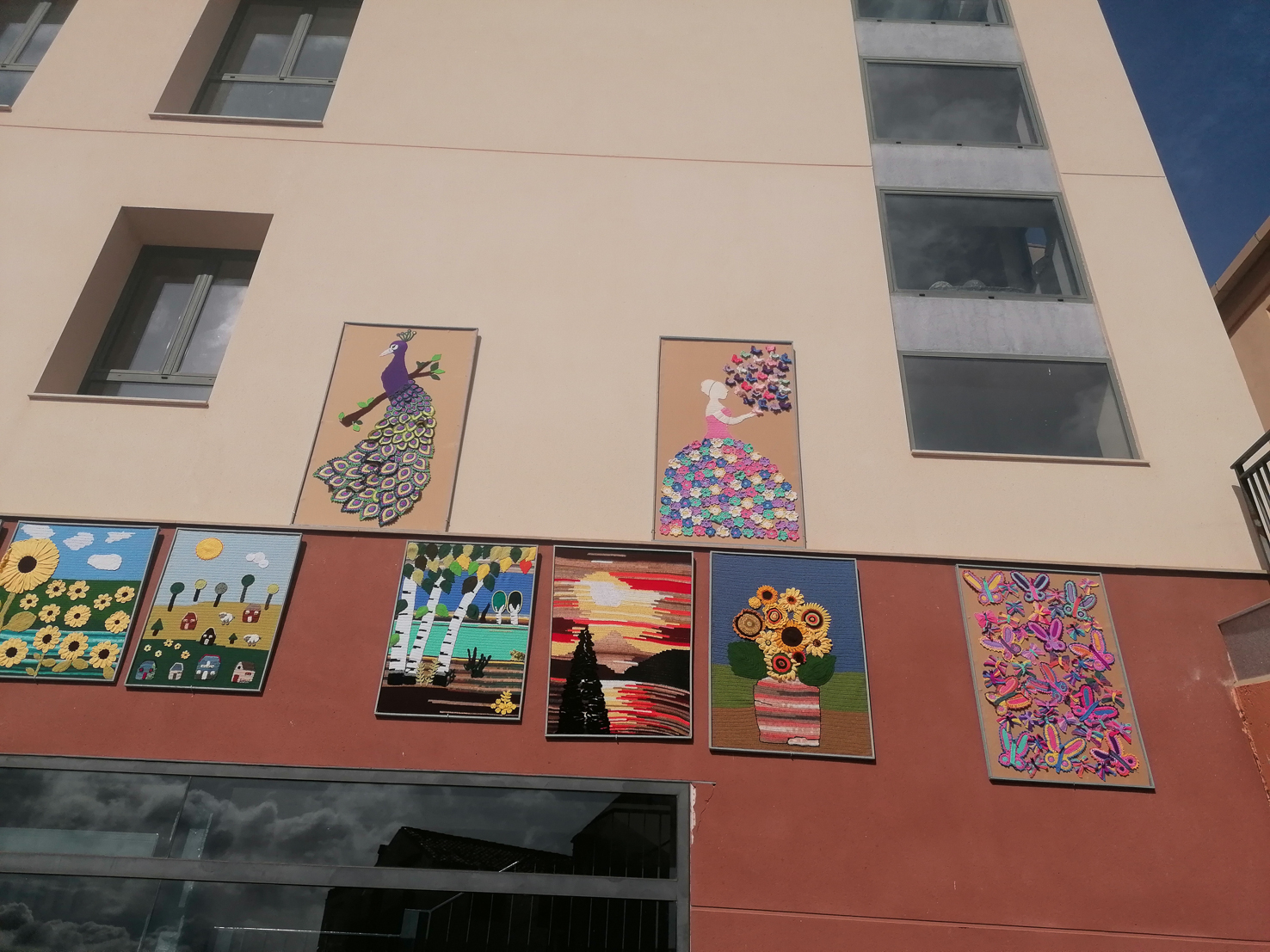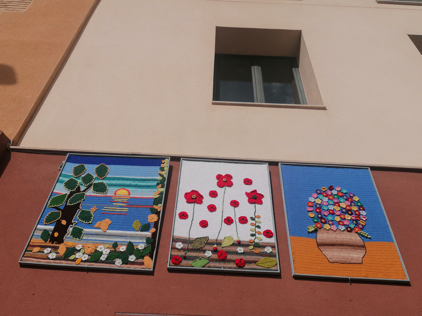 El domingo la Asociación Ganchillo Solidario mostró su intervención realizada en toda la plaza del Molino Galán. Se trata de una inmejorable obra de ganchillo que decora toda la fachada del Molino Galán con cuadros famosos elaborados de ganchillo. Además, también la plaza, los bancos y la pérgola han sido decorados con motivos de ganchillo.
