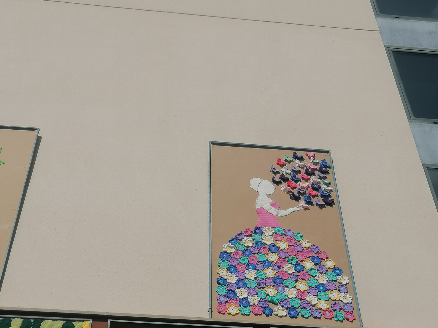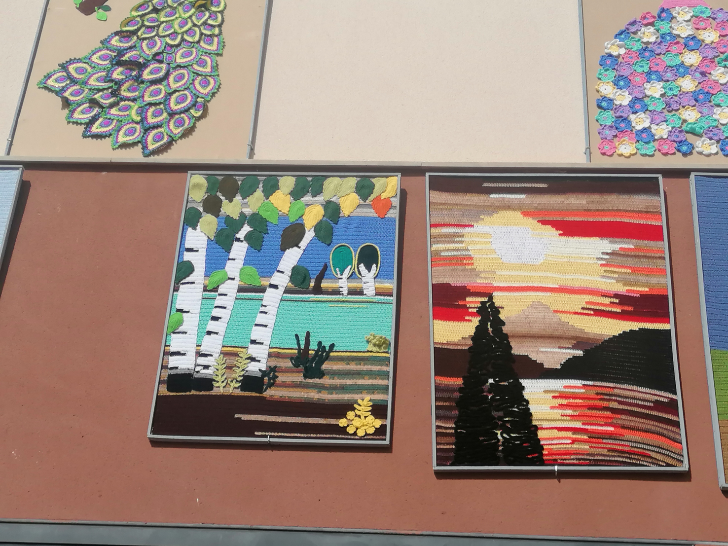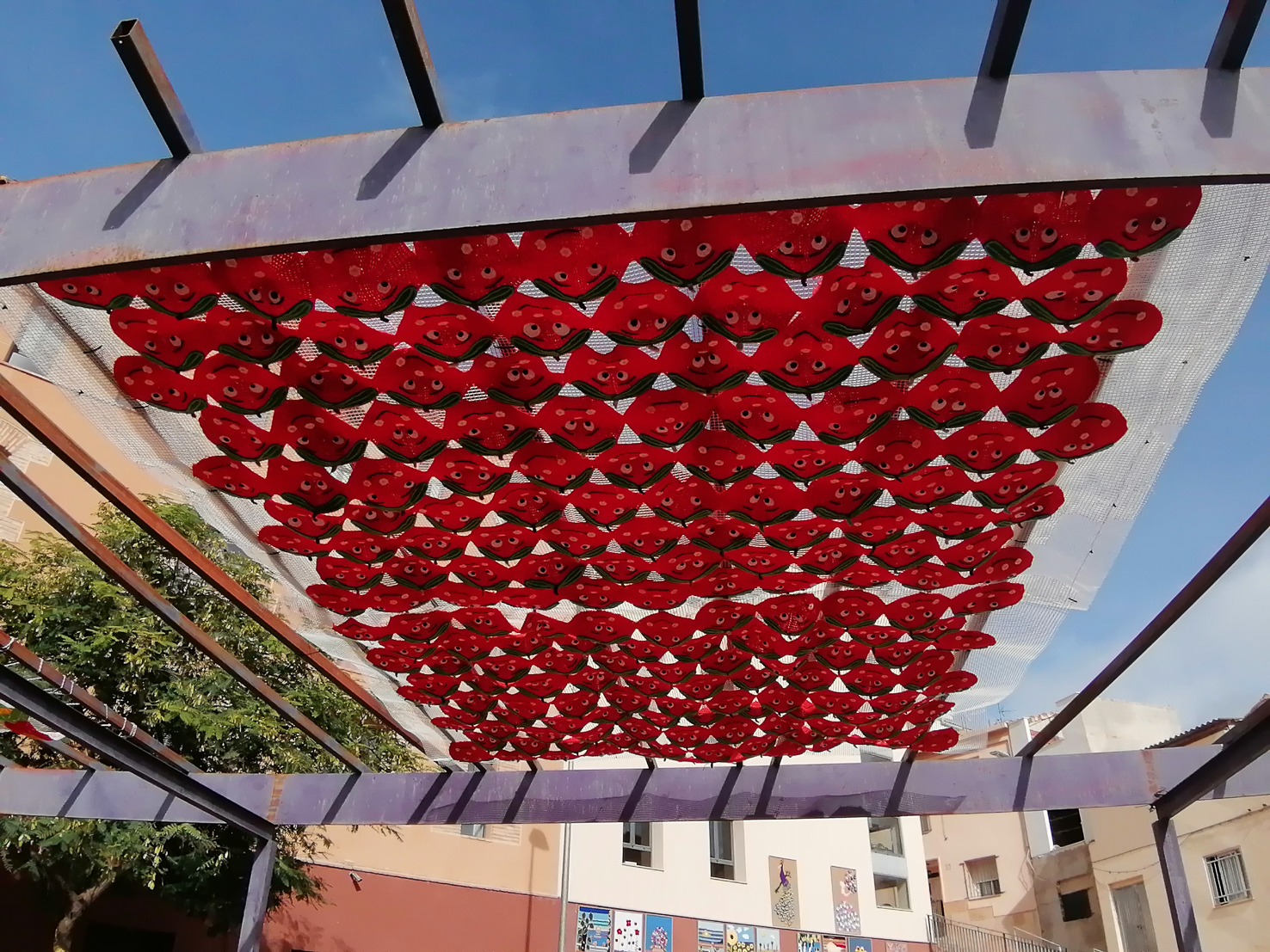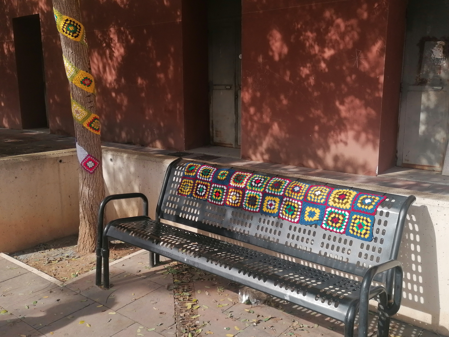 El domingo la Asociación Ganchillo Solidario mostró su intervención realizada en toda la plaza del Molino Galán. Se trata de una inmejorable obra de ganchillo que decora toda la fachada del Molino Galán con cuadros famosos elaborados de ganchillo. Además, también la plaza, los bancos y la pérgola han sido decorados con motivos de ganchillo.
