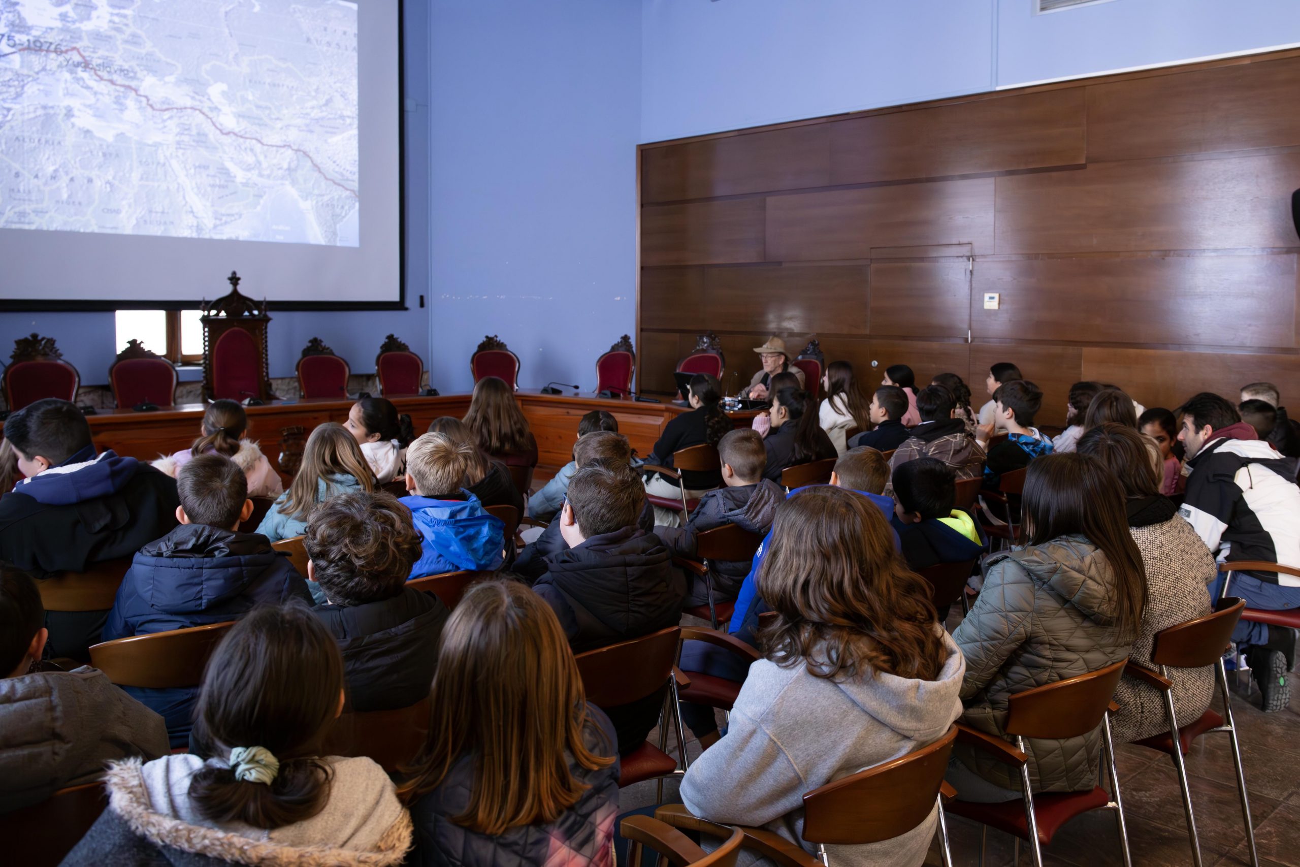 El jueves, 6 de febrero, el salón de plenos acogió las dos conferencias a cargo de Lodé. Por la mañana, el alumnado de 5º de Primaria de los CEIP Francisco Giner de los Ríos y Vicente Blasco Ibáñez conoció de primera mano las aventuras del investigador en su vuelta al mundo en bicicleta, hazaña que llevó a cabo con 22 años, en la que estudió la capacidad de adaptación de las plantas en el medio árido.