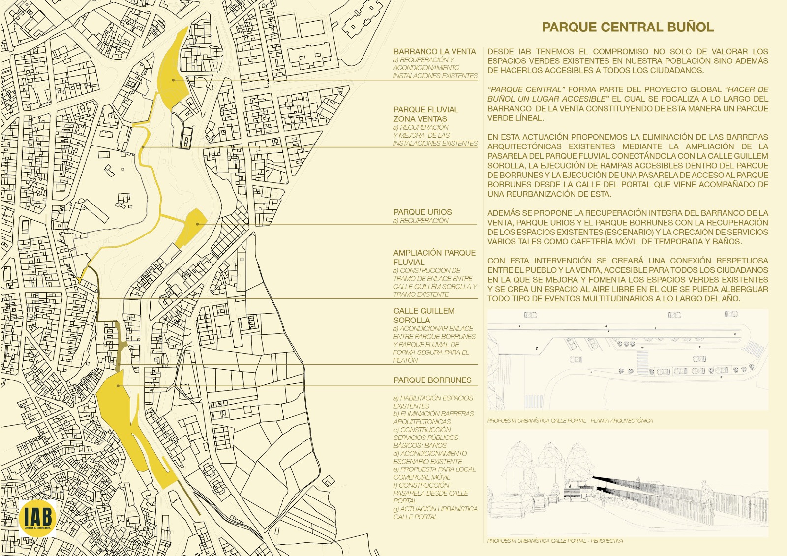 Para lograr esto, Izquierda Alternativa propone «varias actuaciones a lo largo de los próximos 4 años en lugares clave como: la cuesta Navarro y el antiguo camino del albergue municipal; la construcción de una rampa que elimine la barrera arquitectónica entre la Plaza del Molino Galán y el Parque Fluvial; también el acceso al Parque de Borrunes desde la Calle El Portal y la conexión entre el Parque Fluvial, zona Parque de Urios, Guillem Sorolla y el Parque de Borrunes«.