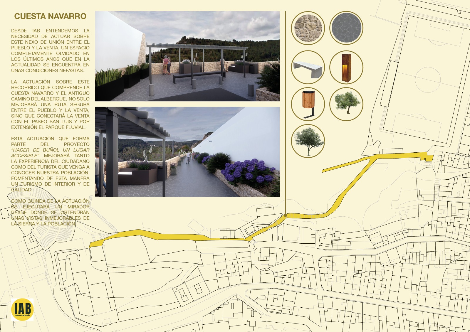 Desde IAB destacan que «tenemos el compromiso de actuar, mejorar y potenciar estos espacios creando un recorrido que pueda ser utilizado tanto por los habitantes de la población, así como por las personas que vengan a conocer nuestro pueblo. Se trata de un paseo de 4 kilómetros que asegura la movilidad de toda la población sin barreras arquitectónicas y compatibilizándolo con la preservación del medio ambiente urbano y el patrimonio histórico-artístico de la localidad«.