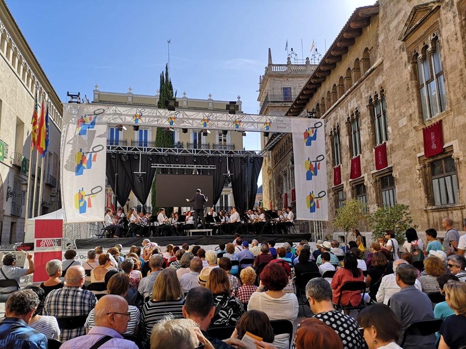 El domingo por la mañana, la Banda Sinfónica actuó en la Plaza de Manises de Valencia. Aquí, ofreció una excelente imagen ante público y autoridades. Además, fueron recibidos por el Presidente de la Diputación de Valencia, Toni Gaspar.