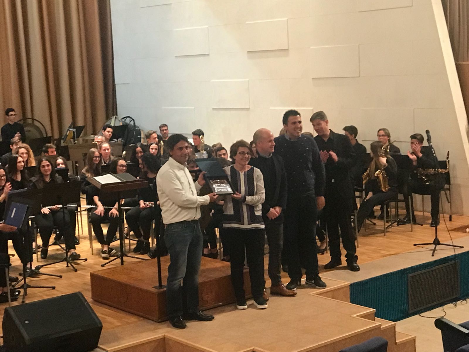 Antes de concluir la primera parte, el director del Conservatorio de Buñol, Bernat Fabra, hizo subir al escenario a la edil de educación del consistorio de Silla, Raquel Sánchez, y al concejal de Conservatorio, Comercio y Turismo de Buñol, Manuel Sierra, para hacer entrega de una placa conmemorativa de la visita al director del conservatorio visitante, Francisco Abellán, que tras la recepción, pronunció unas palabras de agradecimiento.