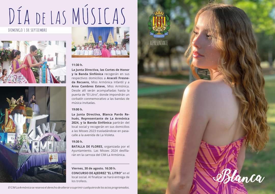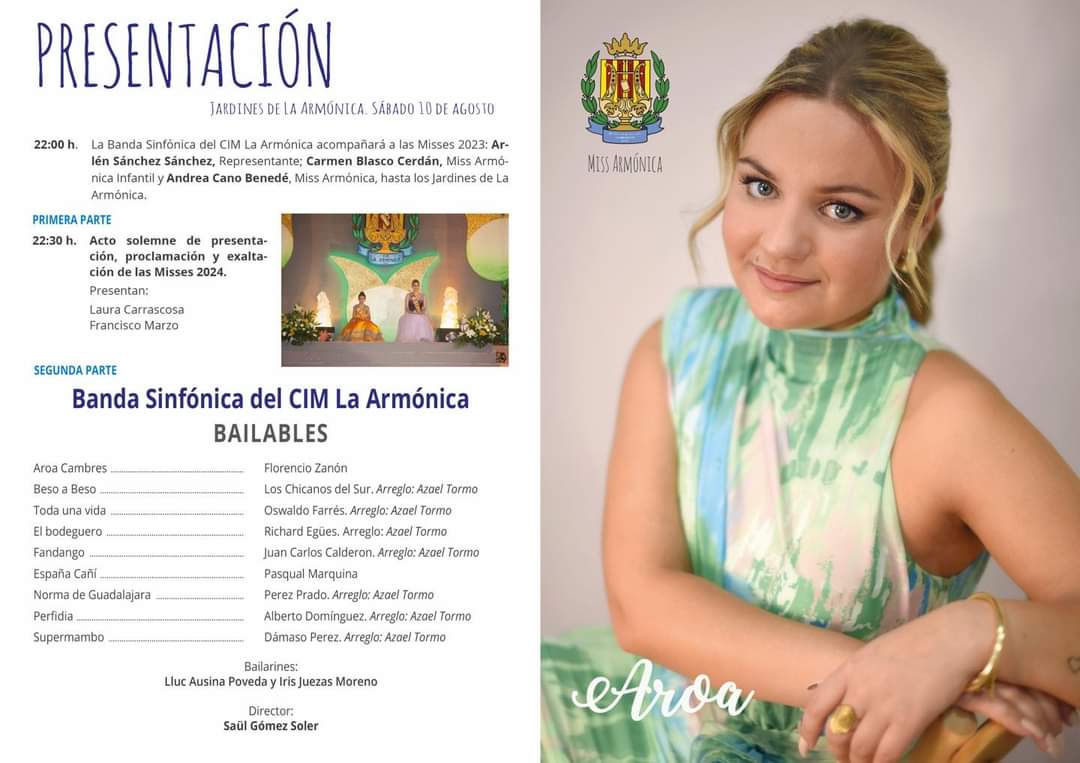 El acto, que será presentado por Laura Carrascosa y Francisco Marzo, servirá para despedir a Andrea Cano Benedé, a Carmen Blasco Cerdán y a Arlén Sánchez Sánchez, que media hora antes desfilarán desde las puertas del Palacio de la Música hasta «Viachén». Más tarde, serán presentadas Aroa Cambres ESteve, como Miss Armónica 2024, la niña Araceli Fresneda Recuero, como Miss Armónica Infantil y a Blanca Pardo Rehués como Representante de la sociedad en la Corte de Honor del Rey de las Fiestas.