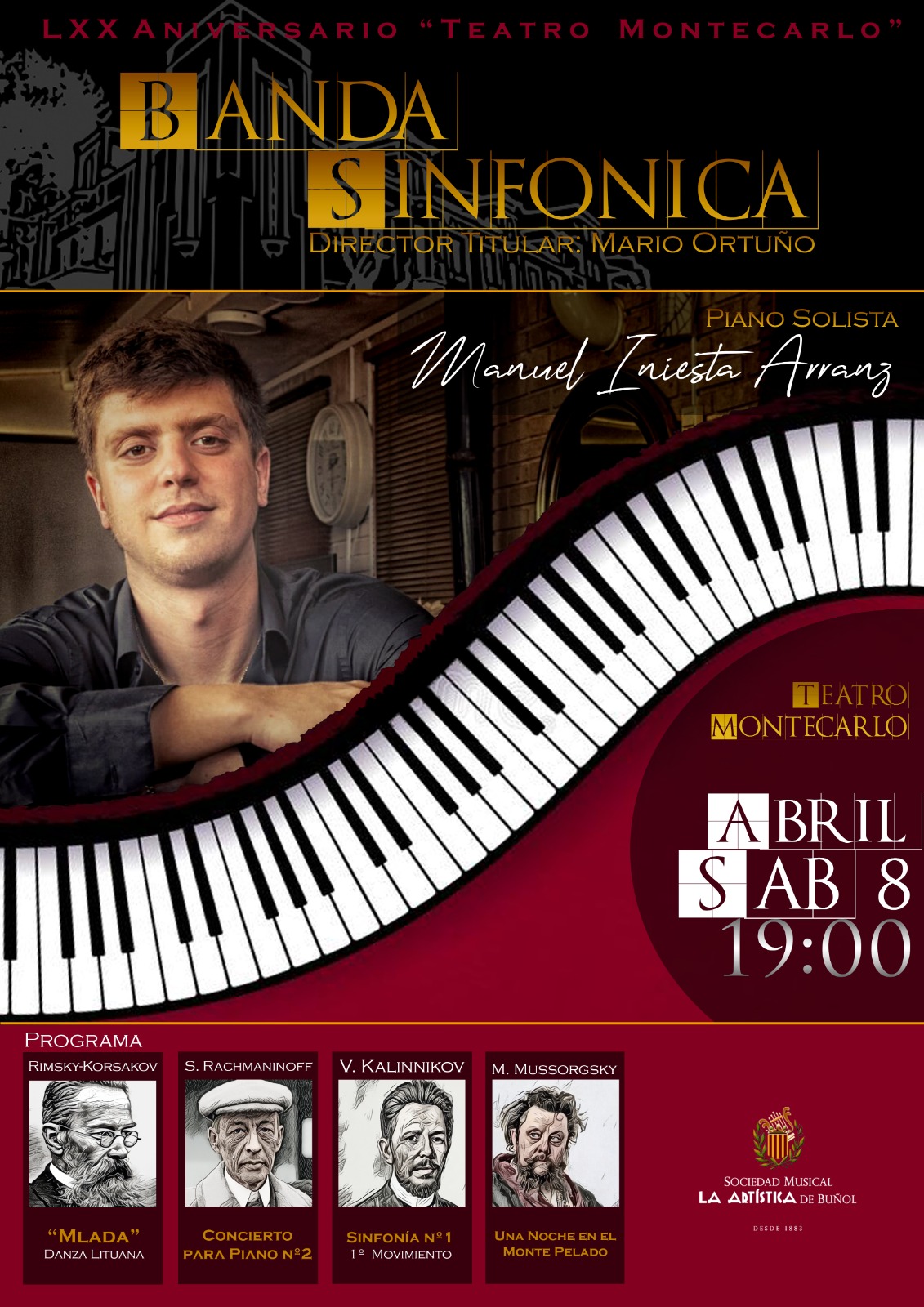 El sábado 8 de abril es el día escogido para el Concierto que la Banda Sinfónica ofrecerá con motivo del Aniversario de Montecarlo. A partir de las 19 horas, los músicos “feos” ocuparán de nuevo el escenario para ofrecer un espectacular programa compuesto por obras de Kalinnikov, Mussorgsky o Rimsky-Korsakov. De entre las piezas escogidas para la ocasión por el director de La Artística, Mario Ortuño Gelardo, destaca el “Concierto para piano nº2” de Sergei Rachmaninov, que contará con Manuel Iniesta Arranz como solista. Este joven pianista, ha actuado como solista en algunos de los escenarios más prestigiosos de la Comunidad Valenciana, como el Aula Magistral del Palau de Les Arts Reina Sofía, el Palau de la Música de Valencia o el Ateneo Mercantil de Valencia. Ha colaborado en diversas ocasiones con la Banda Municipal de Valencia, así como con la Orquesta y Banda Sinfónica de la Sociedad Musical La Artística de Buñol. Además, es miembro del Quinteto Montero, con el que en 2019 se alzó ganador del Concurso de Jóvenes Intérpretes de Música de Cámara de Montserrat. Actualmente está cursando el Máster de Interpretación Solista en el Centro Katarina Gurska en Madrid.