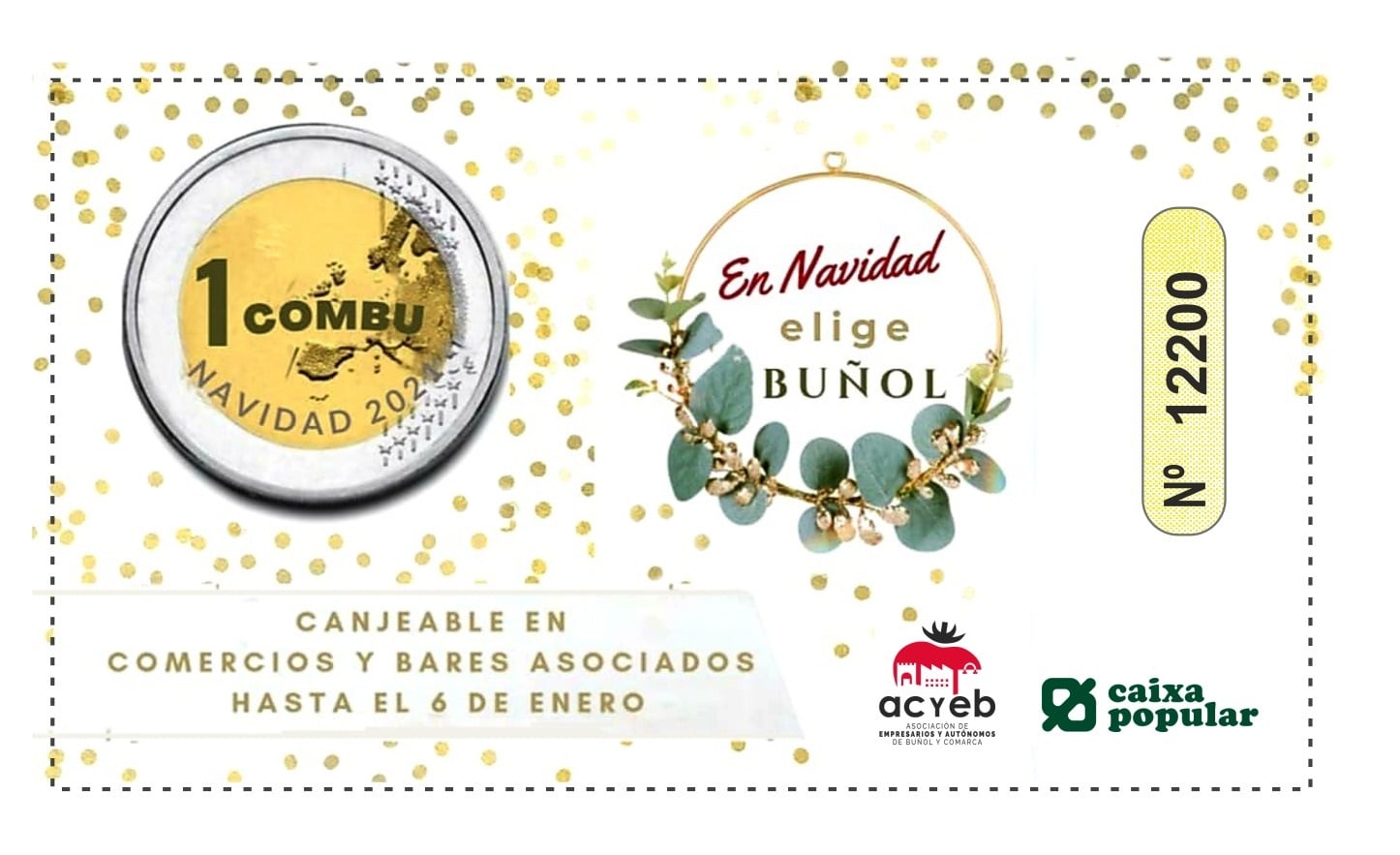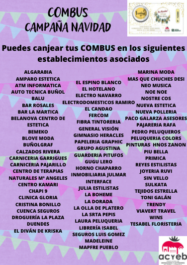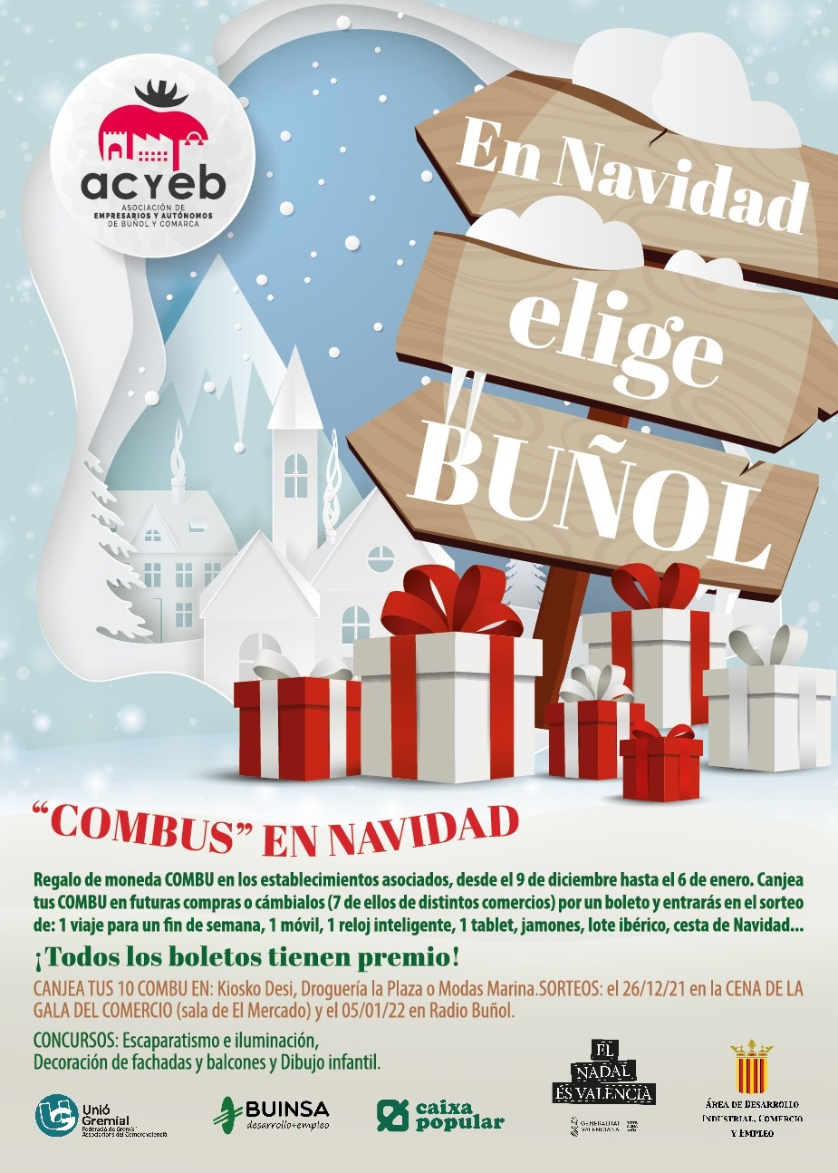La Asociación de empresarios y autónomos de Buñol y comarca ha preparado una campaña única, cargada de regalos, para todos los clientes que confían y apuestan por el comercio local. Hasta el 6 de enero todos los comercios asociados regalarán a sus clientes más fieles la ya conocida por todos, la moneda COMBU. Esta vez se le ha añadido un plus a esta moneda. El cliente puede canjearla por futuras compras o canjear 10 COMBUS por un boleto, y participar en dos sorteos de premios muy atractivos. Todos los boletos tienen premio. Los clientes tienen dos opciones para el canje de estos combus. Los pueden canjear en sus futuras compras en los comercios asociados, como se viene haciendo hasta ahora, o canjear 10 combus (7 de ellos de distintos comercios) por un boleto para dos sorteos.