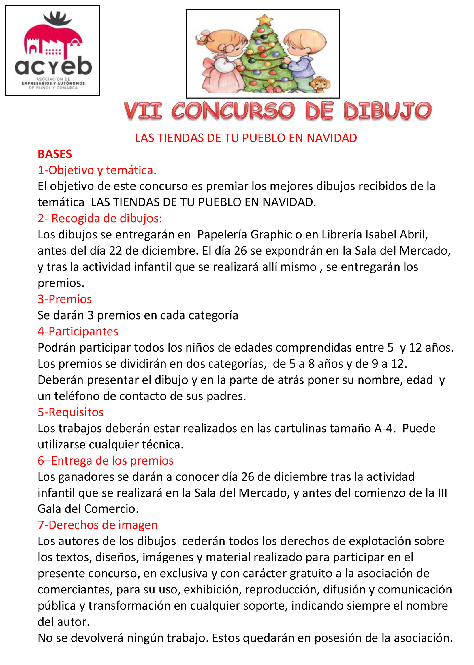 Un año más han puesto en marcha el VII CONCURSO DE DIBUJO INFANTIL “Las tiendas de tu pueblo en Navidad”. Animan a la participación de todos los niños de la localidad de entre 5 y 12 años. Los premios se dividirán en dos categorías, de 5 a 8 años y de 9 a 12 años. Deberán presentar el dibujo y en la parte de atrás poner su nombre, edad y un teléfono de contacto de sus padres. Los trabajos deberán presentarse en cartulina tamaño A-4 con cualquier técnica antes del 22 de diciembre en Papelería Graphic o Librería Isabel Abril. El dibujo deber reflejar las tiendas de Buñol
