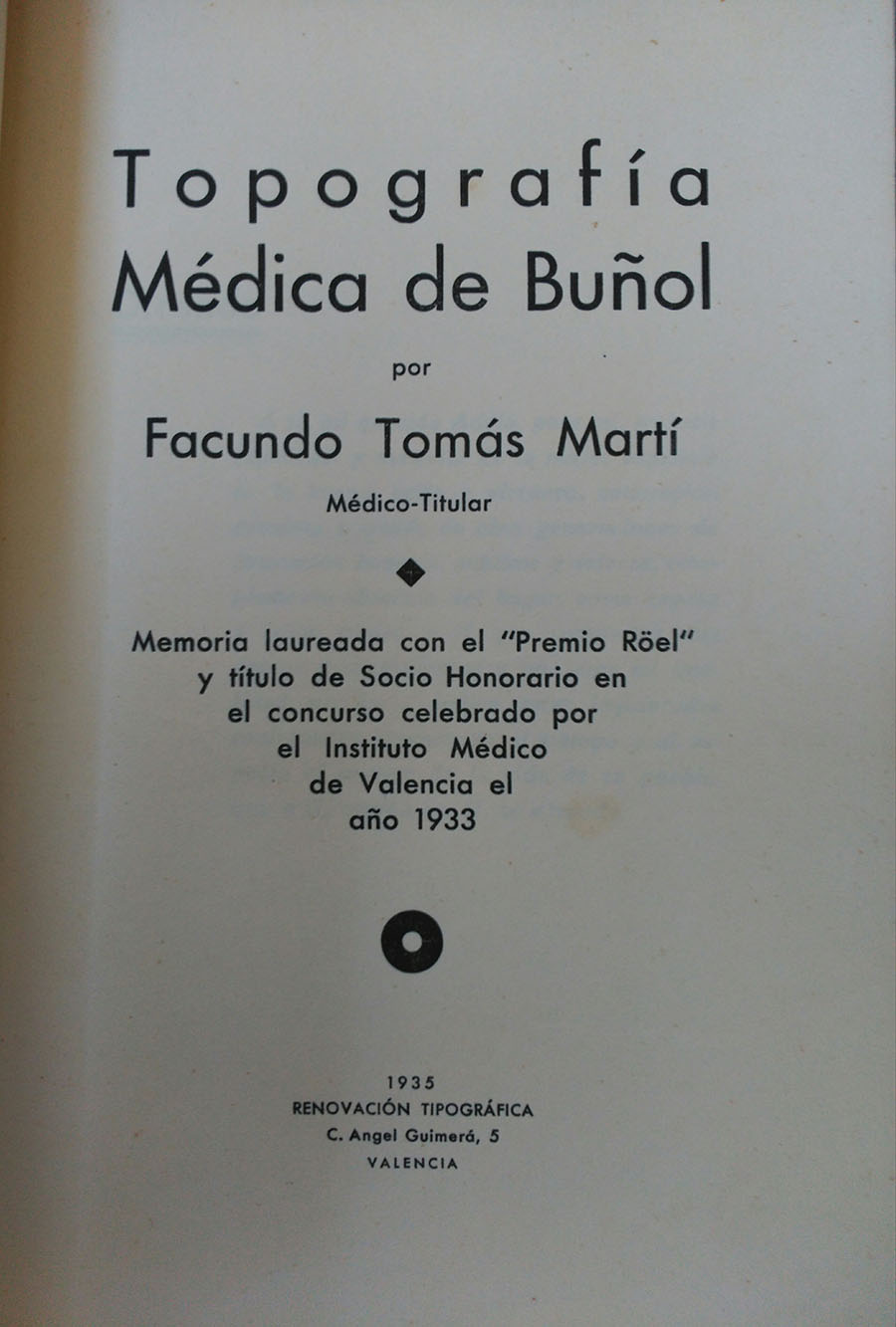 La Biblioteca de Buñol ha adquirido la primera edición de la Topografía médica de Buñol (Valencia, 1935) de Facundo Tomás Martí, obra de la que hasta ahora la Biblioteca conservaba sólo la edición de 1983.