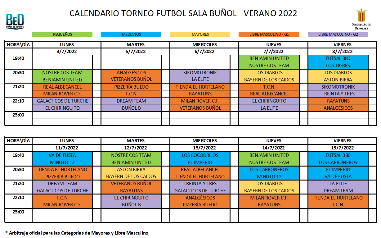 Redacción.- La Concejalía de Deportes del Ayuntamiento de Buñol informa que ya está formada la comisión de fútbol sala para el Campeonato de Verano. Hoy se retoman los partidos a las 20:30h desde el polideportivo de la piscina, con 3 partidos de libres masculino.