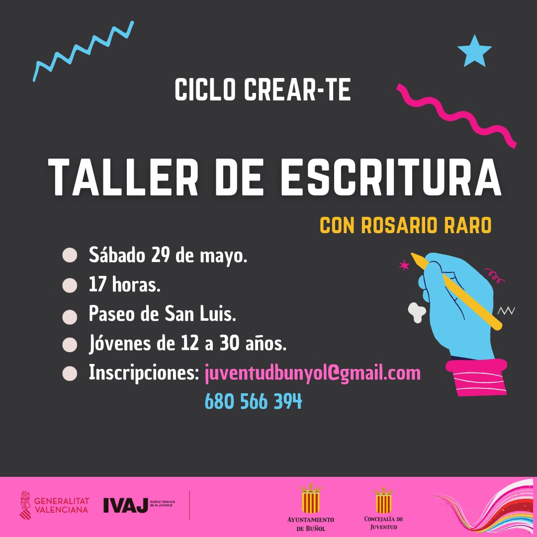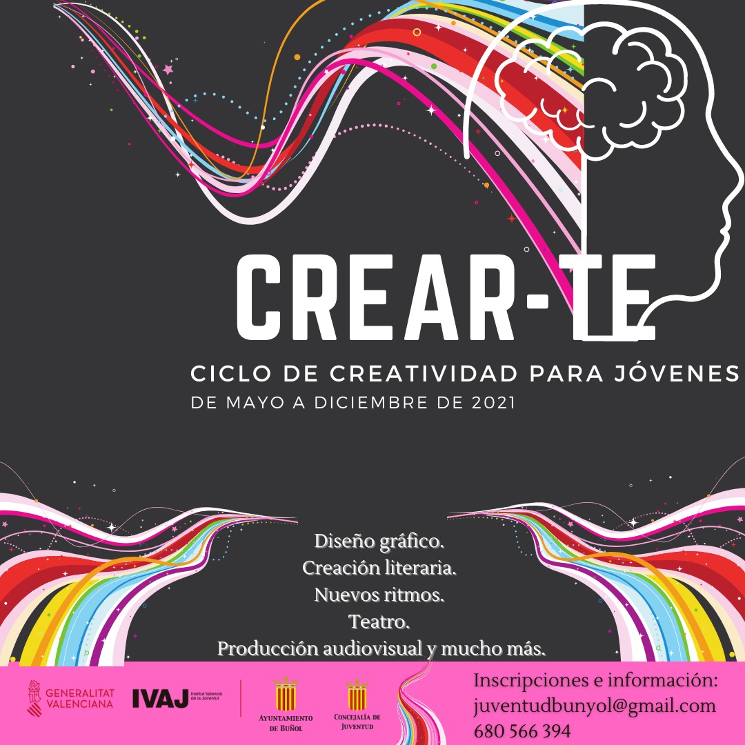 Redacción.- La Concejalía de Juventud del Ayuntamiento de Buñol organiza CREAR-TE (ciclo de creatividad para jóvenes) de mayo a diciembre. Colabora el IVAJ y la Generalitat Valenciana. Todos los interesados deben inscribirse en juventudbunyol@gmail.com o llamar al 680 566 394.
