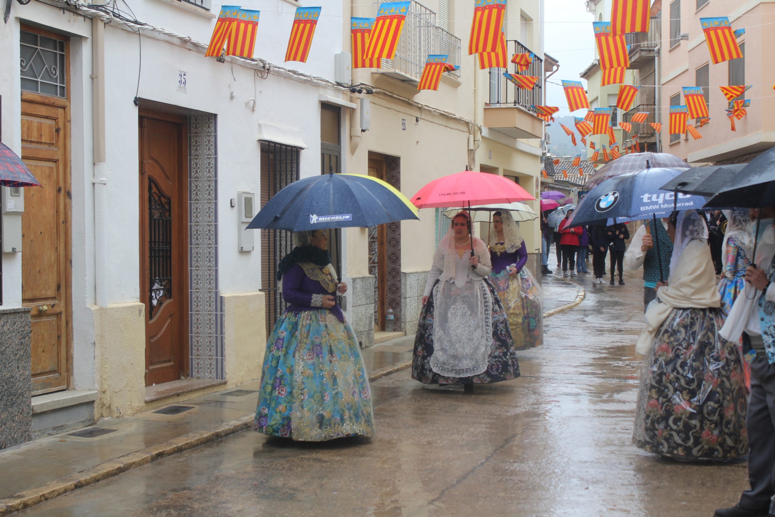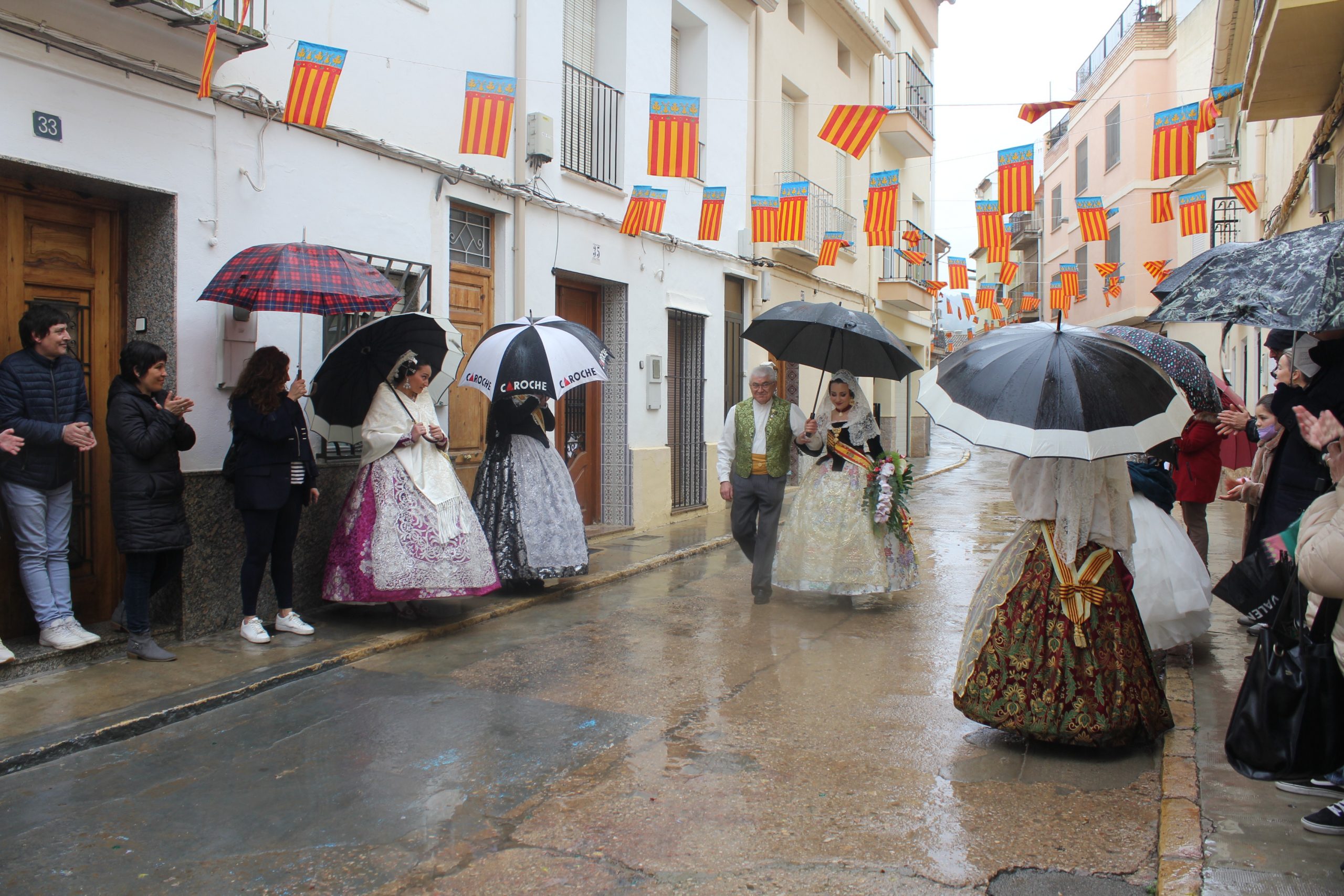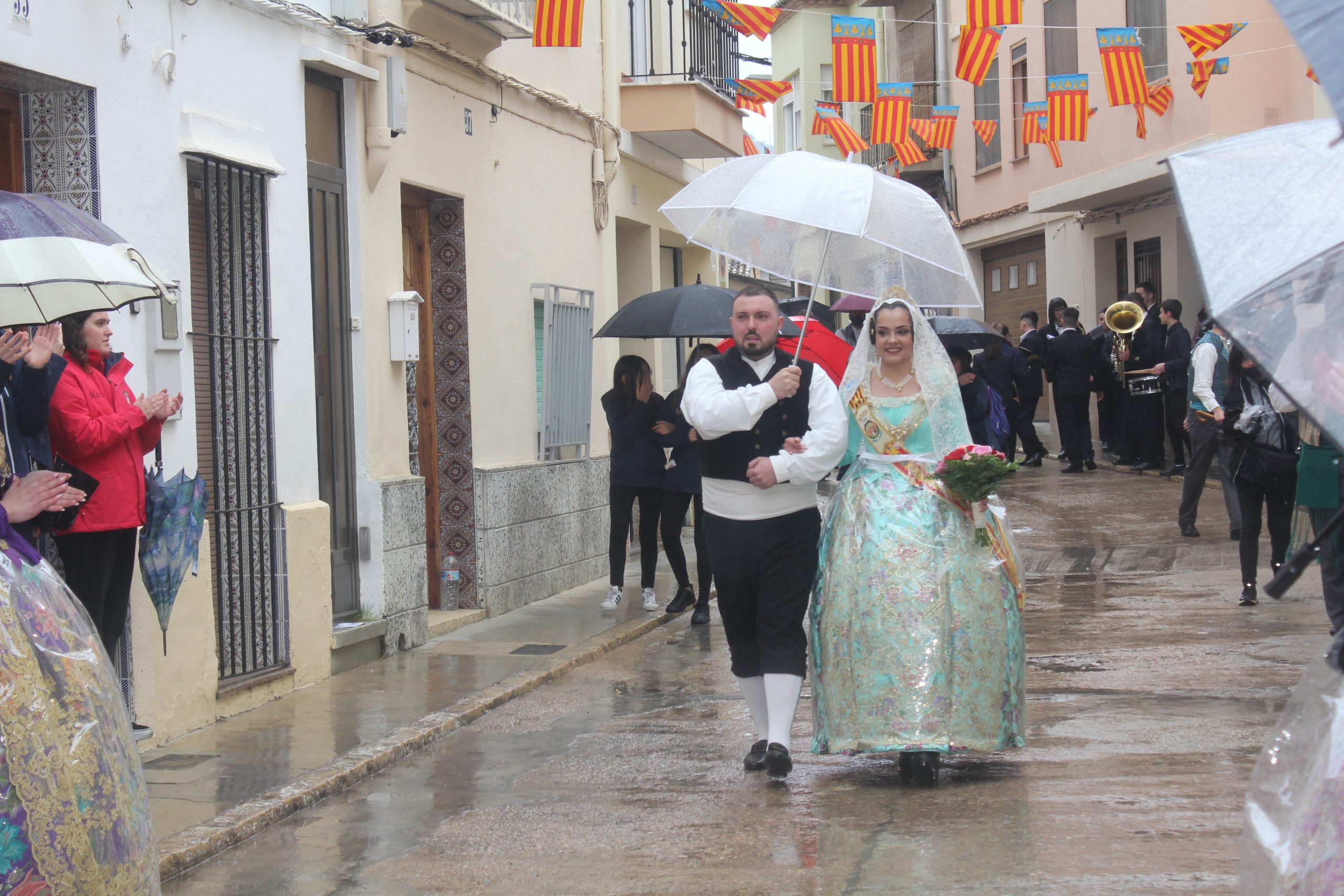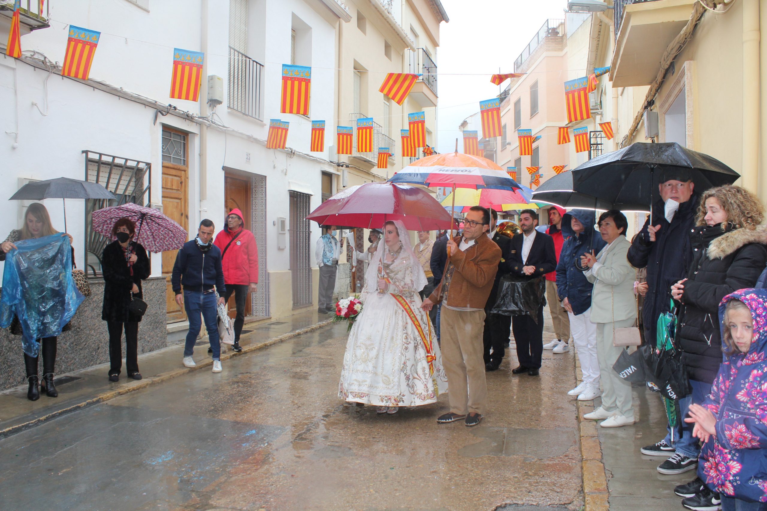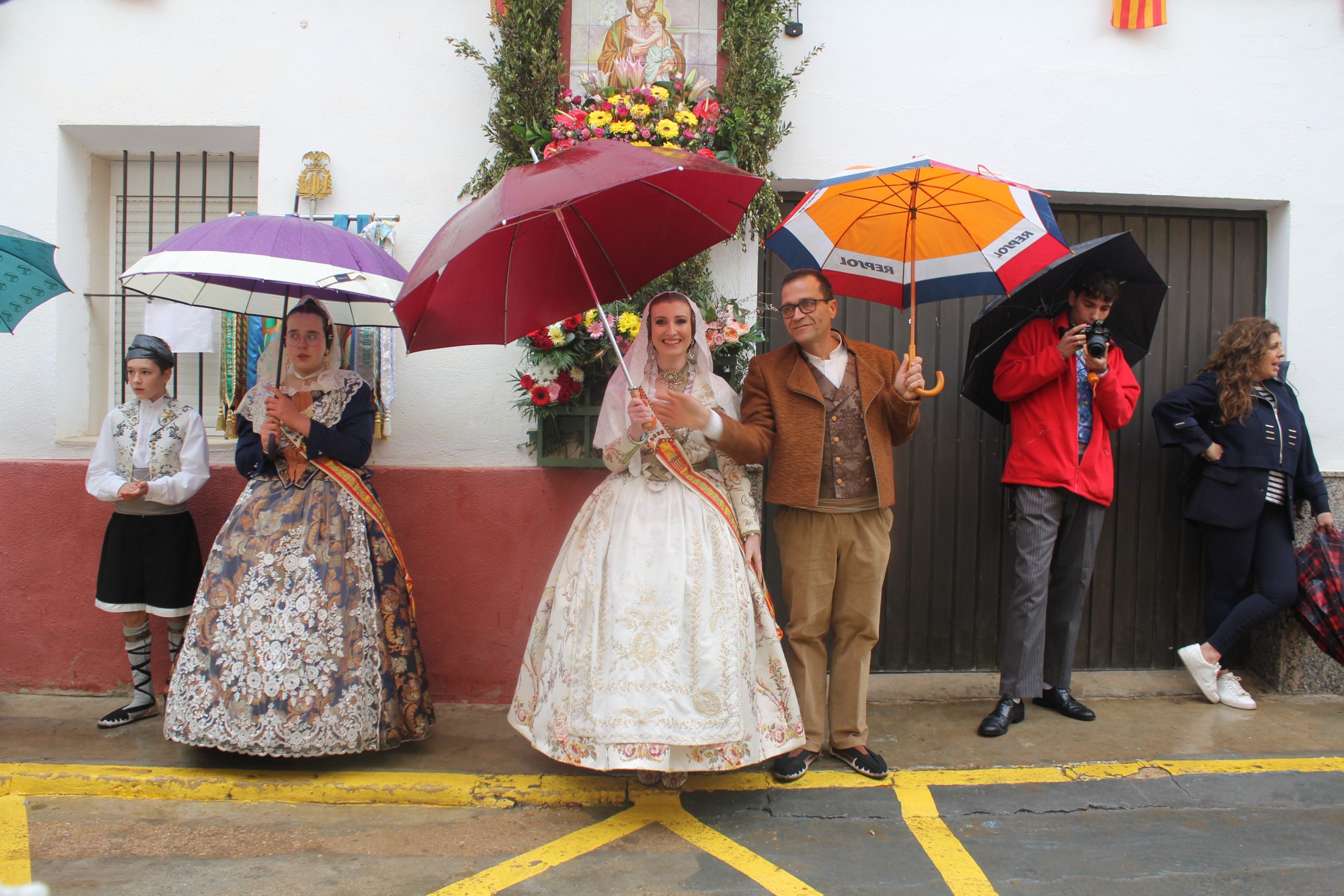 Redacción.- El último día de fallas -como los anteriores- también estuvo protagonizado por las precipitaciones que se dejaron notar en la localidad. Las falleras mayores de las distintas comisiones acudieron a la misa paraguas en ristre. Cuando terminó la eucaristía, la comitiva se dirigió, como es tradición, a la calle Daoíz y Velarde, donde realizaron la ofrenda a la imagen de San José, situada en la conocida calle de «Los Carboneros».