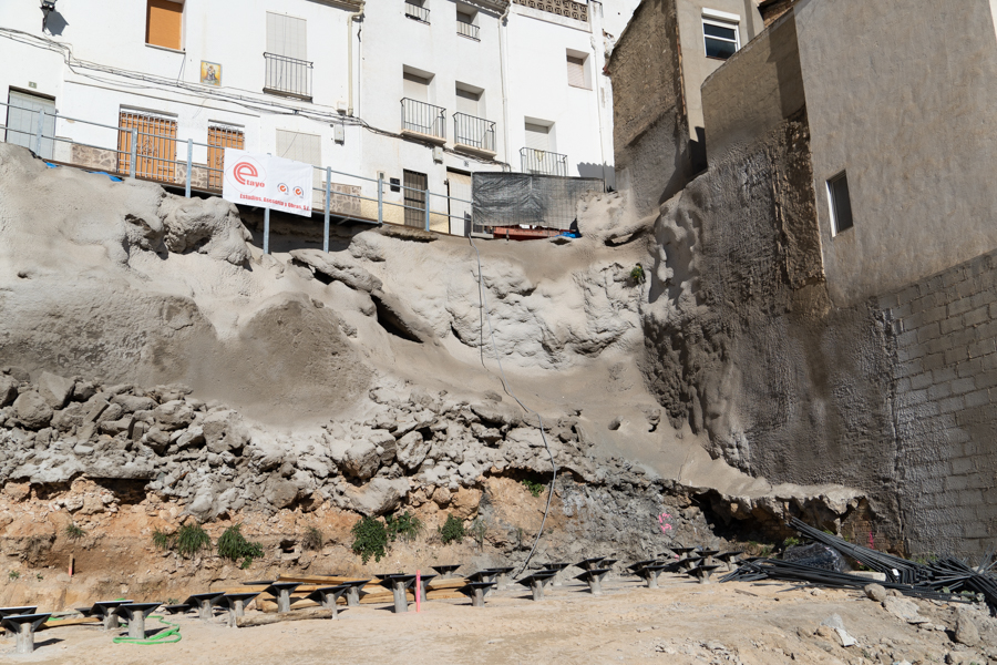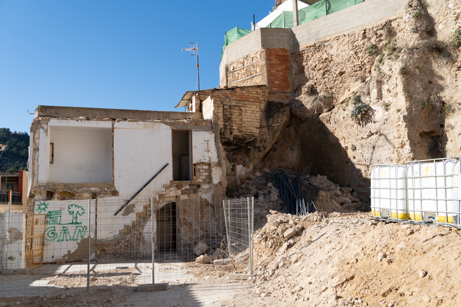 Las obras de la calle Moratín, en el barrio del Castillo de Buñol, son trabajos especializados en ingeniería civil encaminados a construir un muro de sostenimiento y reconstruir la parte de la calzada afectada por el temporal, al tiempo que se restablece el acceso principal a las viviendas y el servicio de agua potable y alcantarillado.