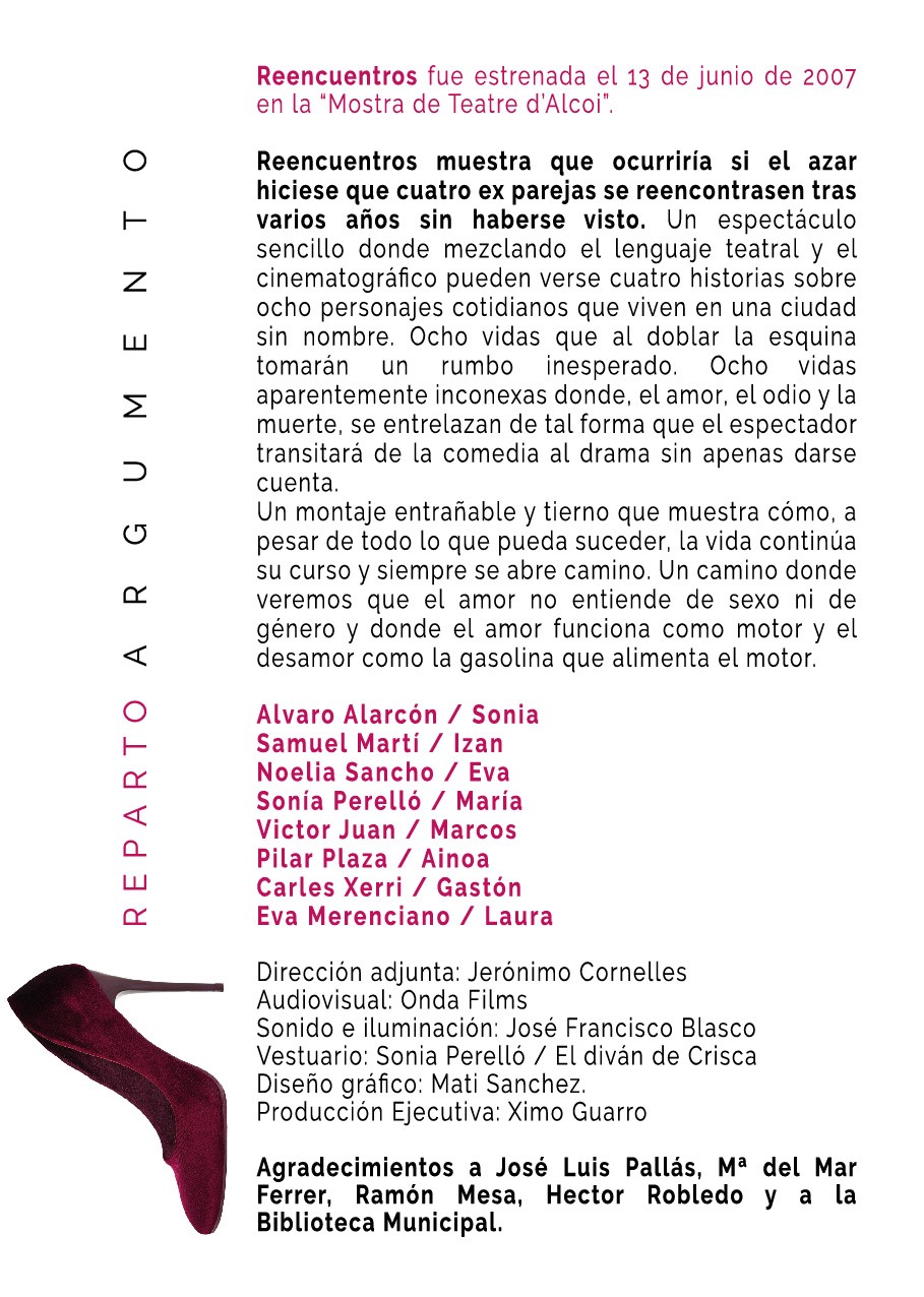 La obra que se pondrá en escena es «Reencuentros» de Jerónimo Cornelles. Los componentes de la EMTB pondrán toda la carne en el asador para demostrar todo el trabajo que hay detrás de este montaje. Todos ellos estarán dirigidos por Rafa Alarcón.