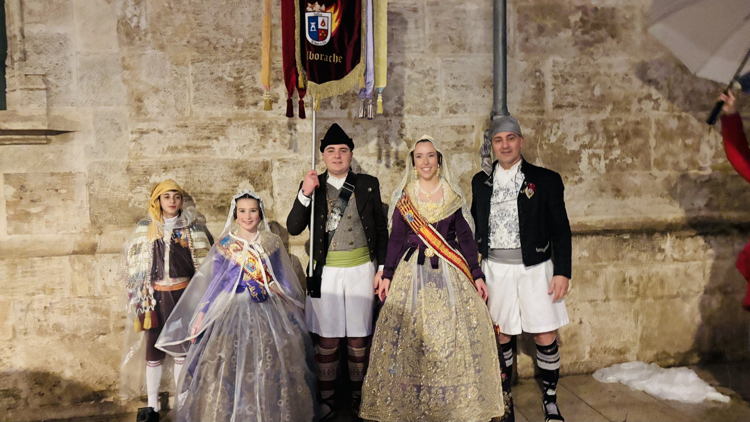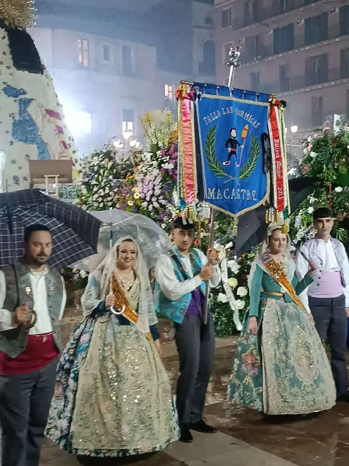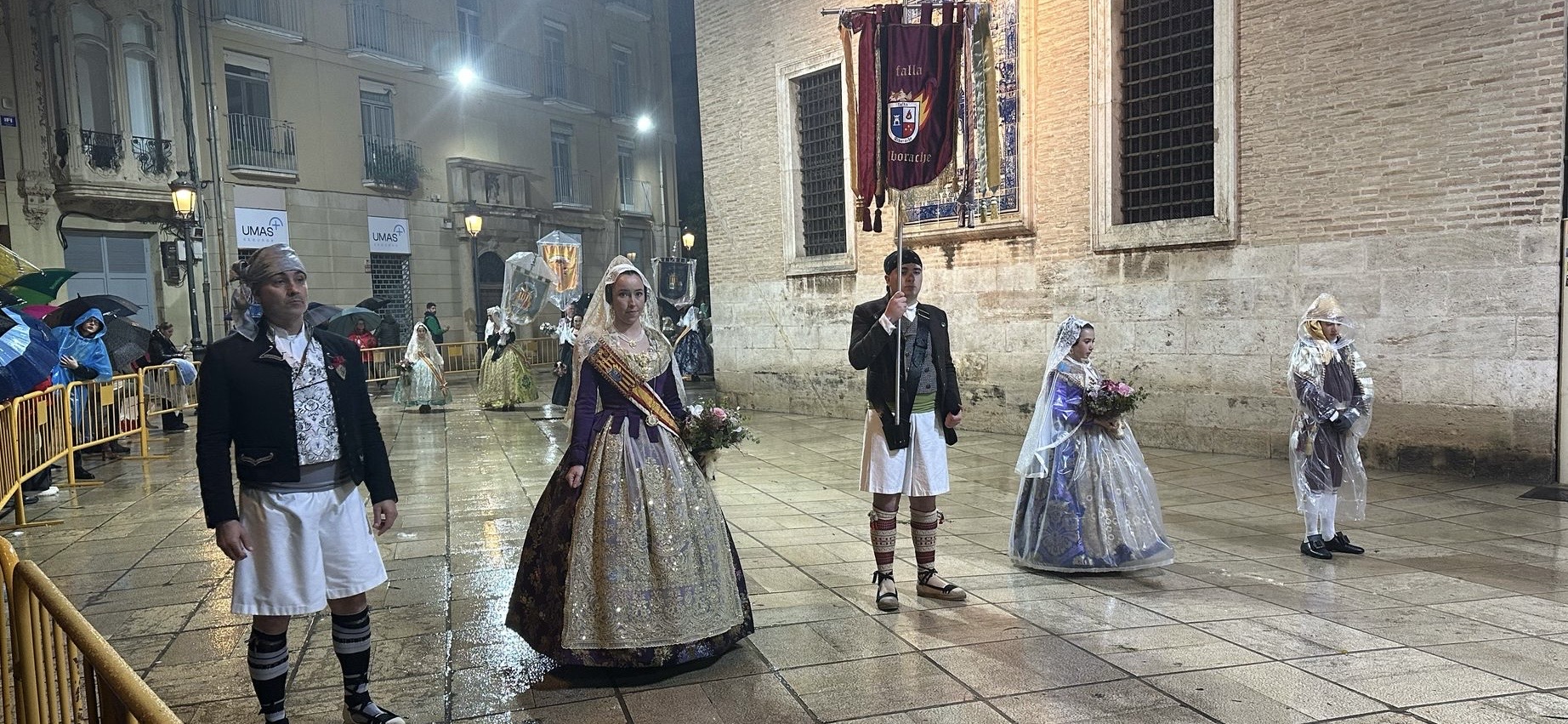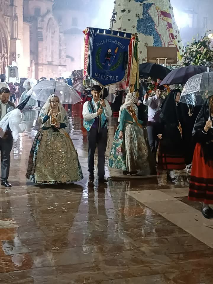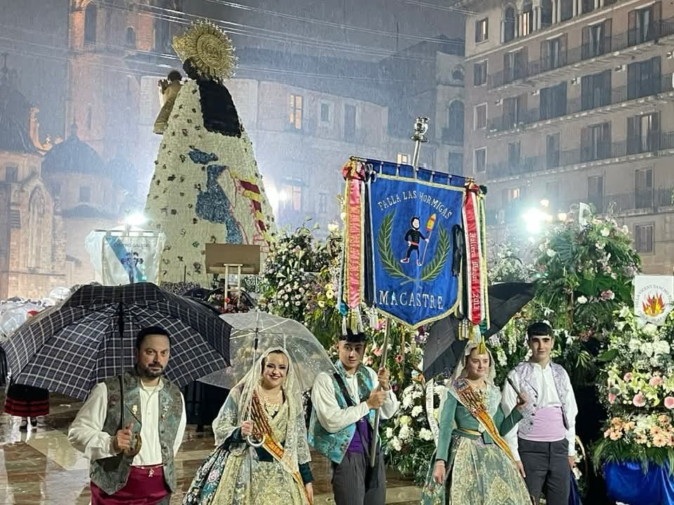 Uno de los momentos más conmovedores de la jornada fue cuando la Falla de Alborache fue anunciada y, acompañados por la lluvia, entraron en la plaza frente a la Virgen, un instante que muchos definieron como “mágico” y lleno de emoción. Los falleros de Macastre, igualmente, no dejaron que las inclemencias del tiempo apagaran su espíritu festivo y compartieron esa emoción con sus compañeros de Alborache, mostrando la solidaridad que caracteriza a las comisiones falleras.