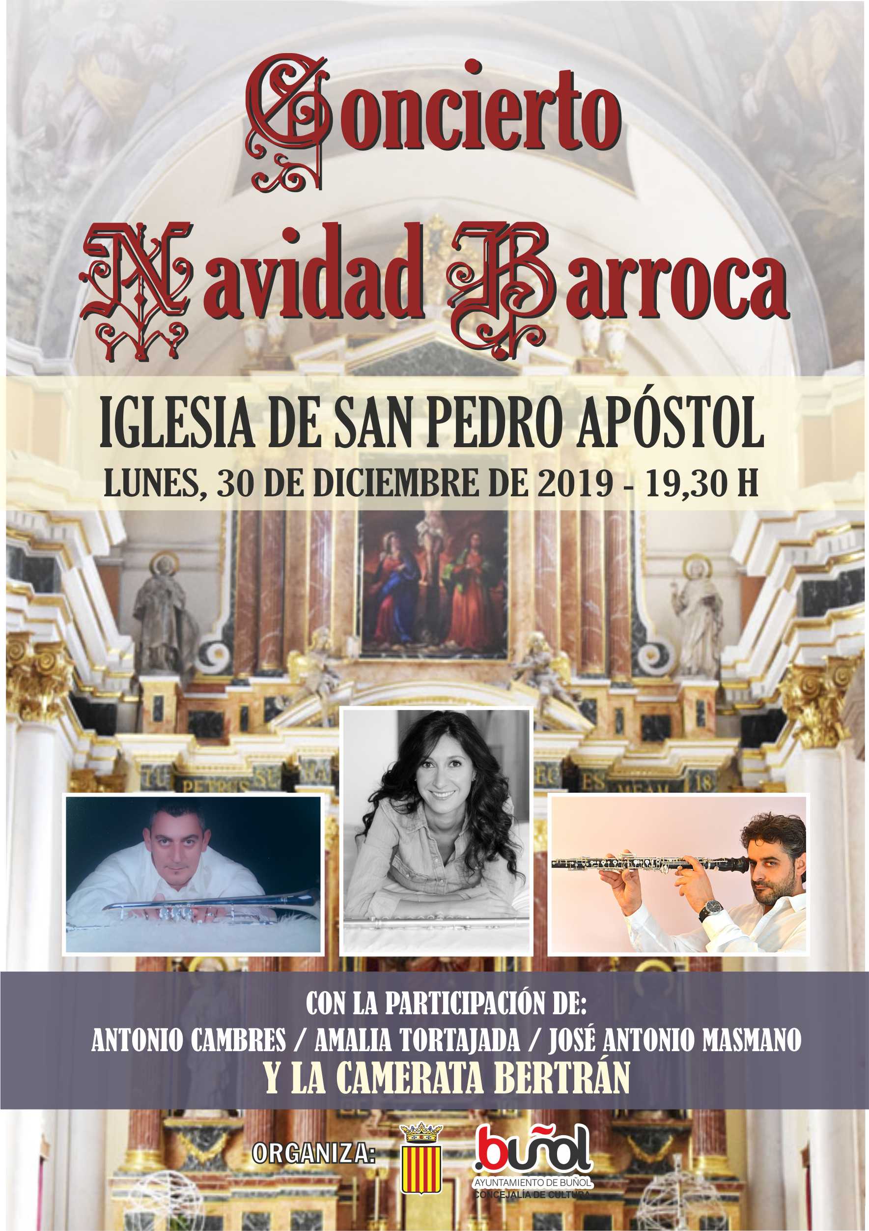 Redacción.- La Iglesia San Pedro Apóstol de Buñol acogerá el próximo 30 de diciembre, a las 19:30h, el concierto bajo el título: «Navidad Barroca». En esta cita organizada por la Concejalía de Cultura del Ayuntamiento de Buñol, actuarán tres músicos de reconocido prestigio en la localidad: el trompetista, Antonio Cambres, la flautista, Amalia Tortajada y el oboísta, José Antonio Masmano. Los acompañará la Camerata Bertrán.