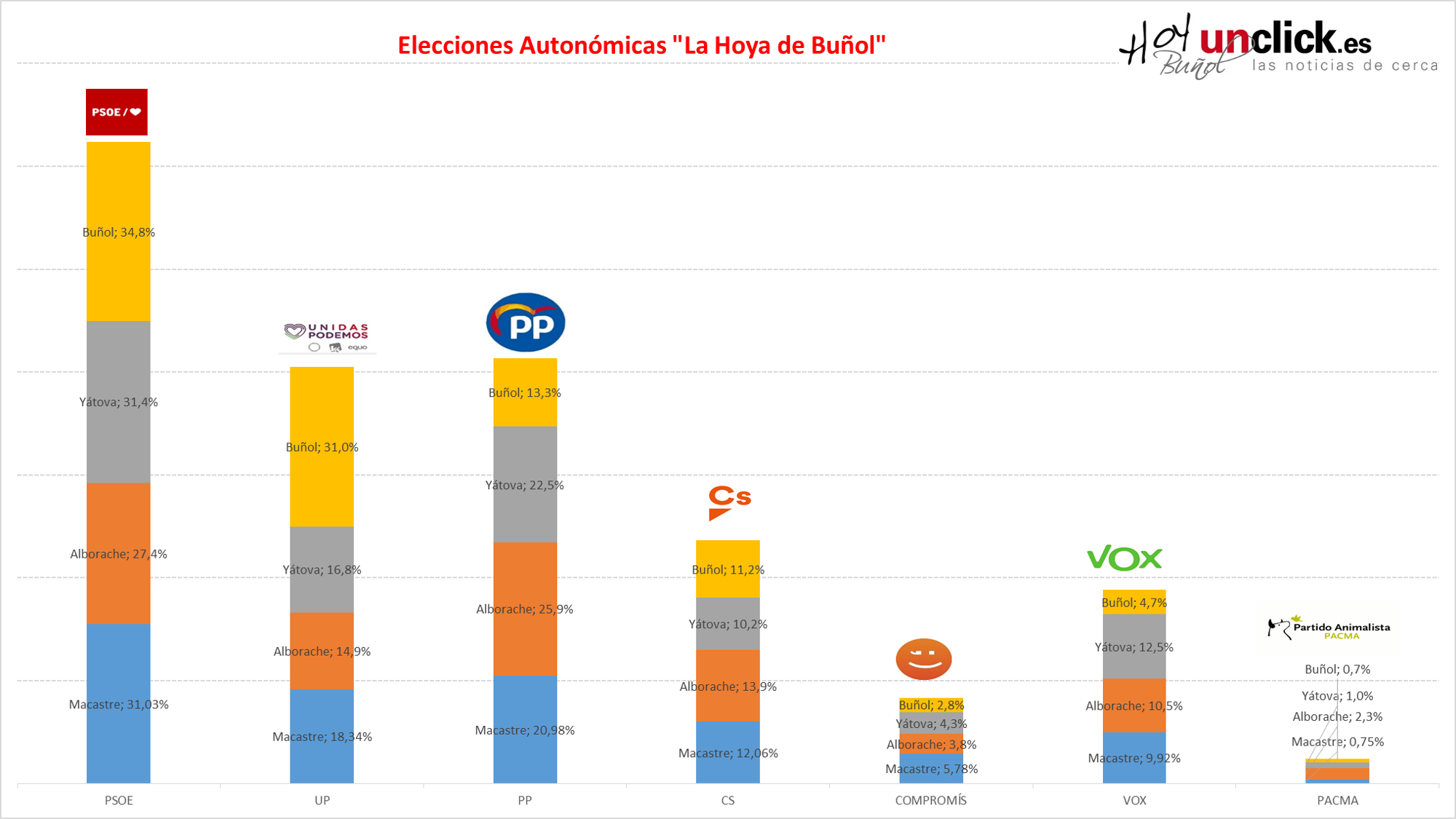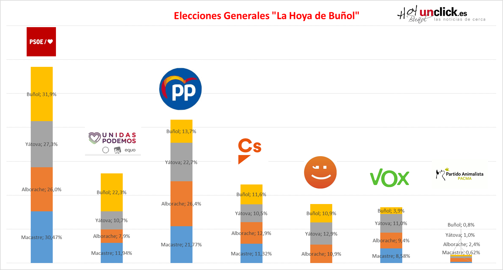 La fuerza mayoritaria fue el PSOE, seguido por Unidos Podemos. La suma de ambas formaciones concentró casi el 70% de los votos en el municipio. Además la participación en Buñol rozó el 80%, concretamente un 79,94% salió a votar en un domingo soleado.