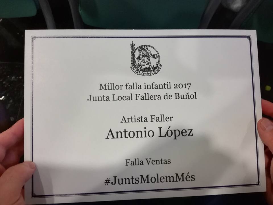 La Falla Ventas de Buñol y su artista fallero, Antonio López, fuerom homenajeados por la Junta Central Fallera de Buñol el pasado sábado en «La Gala dels 1», que tuvo lugar en el Centro Social de la Pobla de Vallbona.