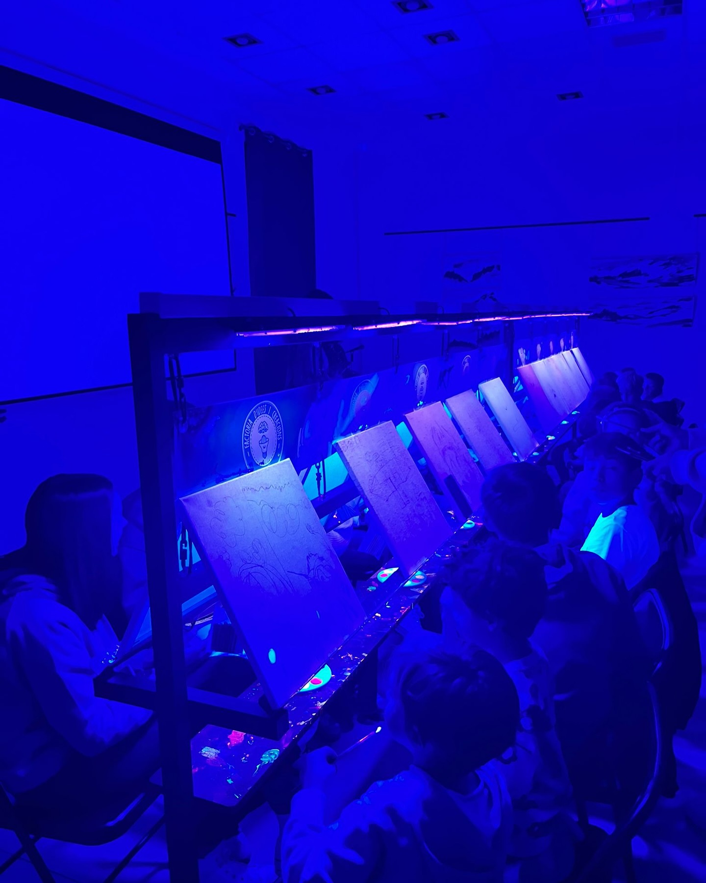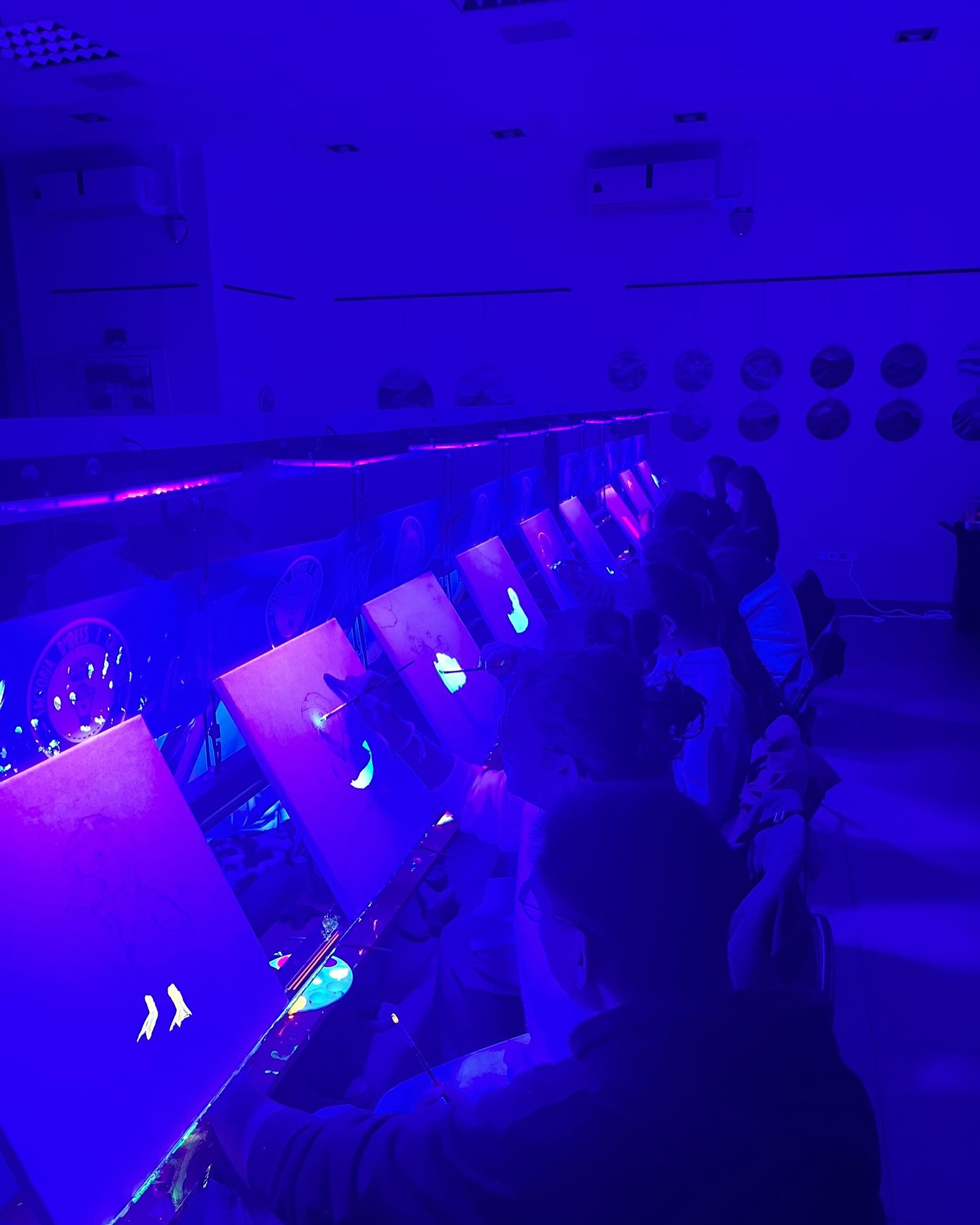 Durante el taller, las y los participantes exploraron técnicas pictóricas bajo luz ultravioleta, creando obras que brillaban literalmente en la oscuridad. Más allá de la experiencia artística, la cita se convirtió en un espacio de encuentro, experimentación y diversión.