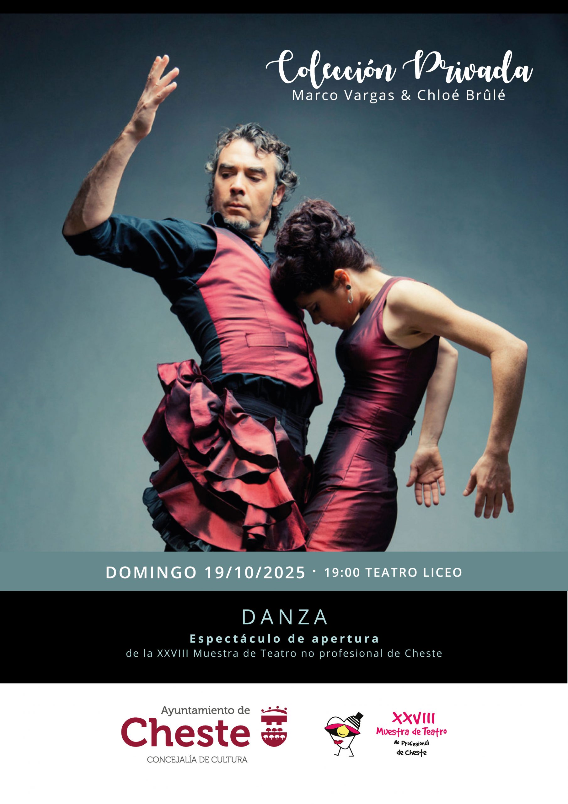 El próximo 19 de octubre, domingo, se inaugurará la 28ª edición de la Muestra de teatro no profesional de Cheste con el espectáculo “Colección Privada” de la compañía Marco Vargas & Chloé Brûlé, una propuesta que fusiona el flamenco con la danza contemporánea de la mano de este dúo ganador de reconocidos premios del panorama nacional e internacional. A través de las coreografías, el vestuario y el ritmo, los artistas invitarán al público a acompañarles en un recorrido por las obras de su repertorio en el que compartirán una mirada común sobre el lenguaje de la danza y el flamenco.
