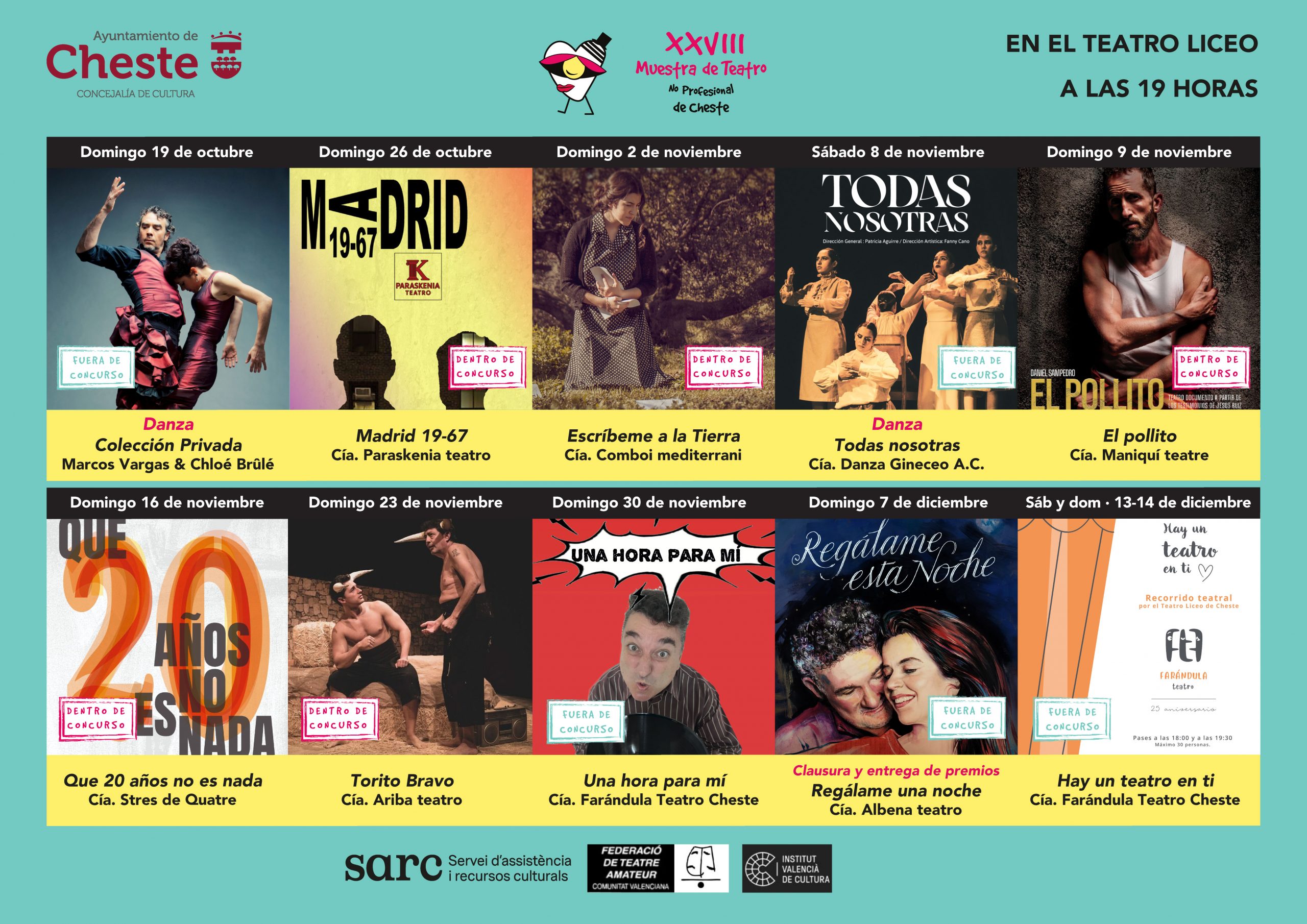 Dentro de concurso, 5 compañías amateurs de diferentes puntos de la geografía española se darán cita en Cheste para participar en la muestra: Paraskenia teatro, con Madrid 19-67; Comboi Mediterrani, con Escríbeme a la tierra; Maniquí teatre, con El Pollito; Stres de Quatre, con Que 20 años no es nada, y Ariba Teatro, con Torito Bravo. La muestra se clausurará el domingo 7 de diciembre con Regálame esta noche, de Albena Teatro, una comedia romántica que narra el reencuentro de dos viejos amantes.