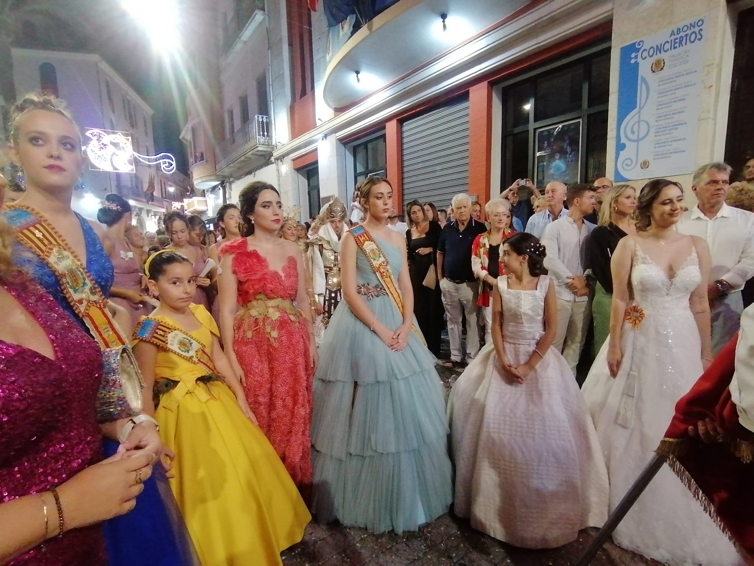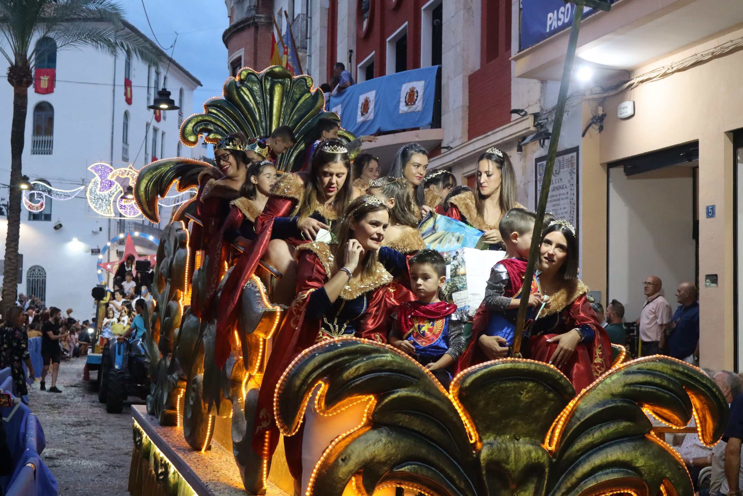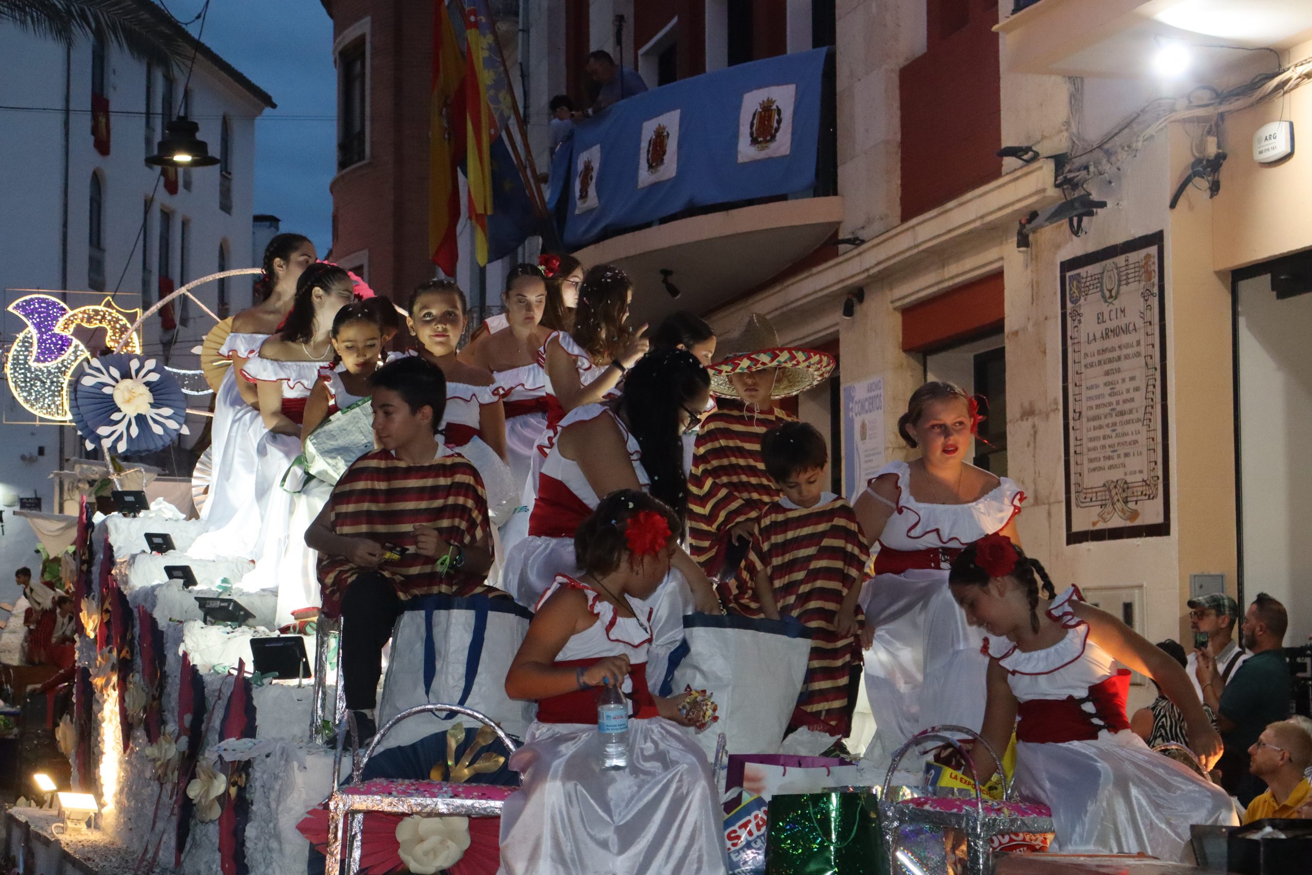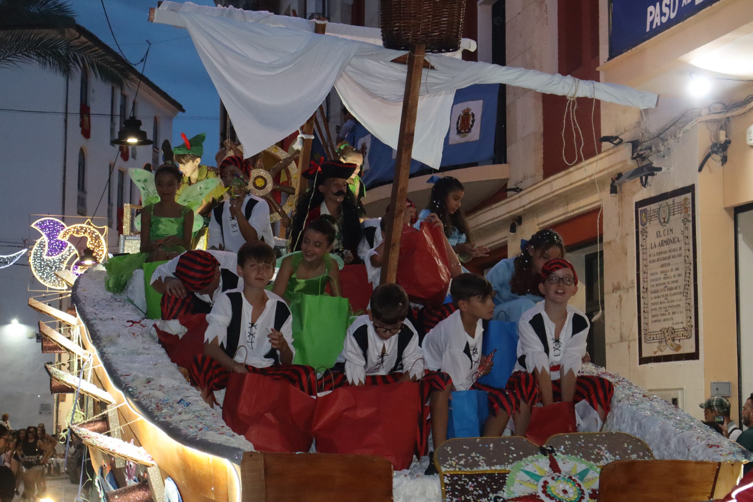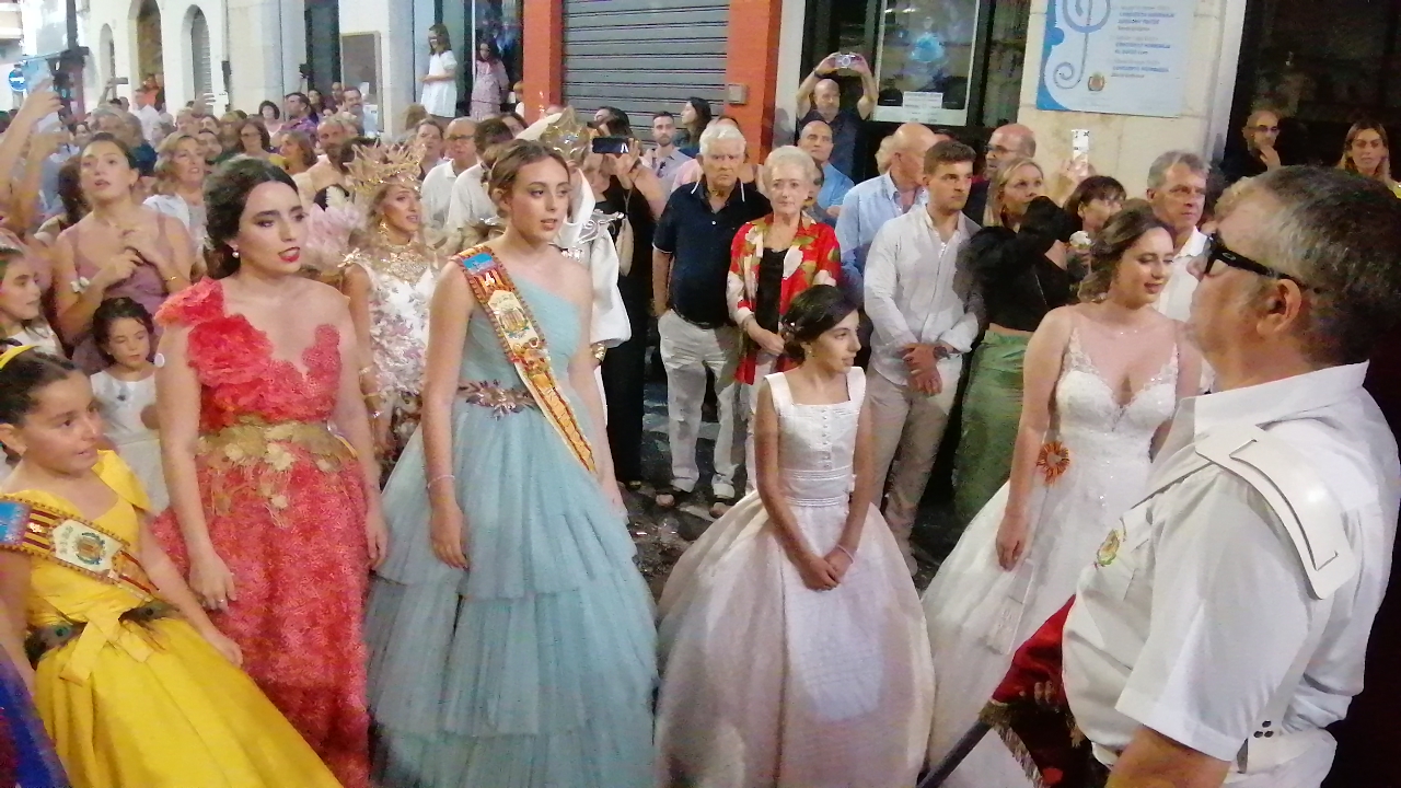 Después de las «filás» vinieron las carrozas: Madres y padres acompañaban a los más pequeños, que repartían caramelos a uno y otro lado. Entre medias, las comparsas de baile, que ensayan durante todo el verano para ofrecer un gran espectáculo el día de su sociedad. Concluyeron el desfile las Misses y Representante del año anterior, todas ellas en carroza. Y andando y con sus respectivas cortes de honor estaban las Misses, Andrea Cano Benedé y Carmen Blasco Cerdán, además de la Representante, Arlén Sánchez Sánchez. La comitiva la cerraba la Banda Sinfónica, encabezada por su presidenta Rosario Pardo y por su director, Saül Gómez.