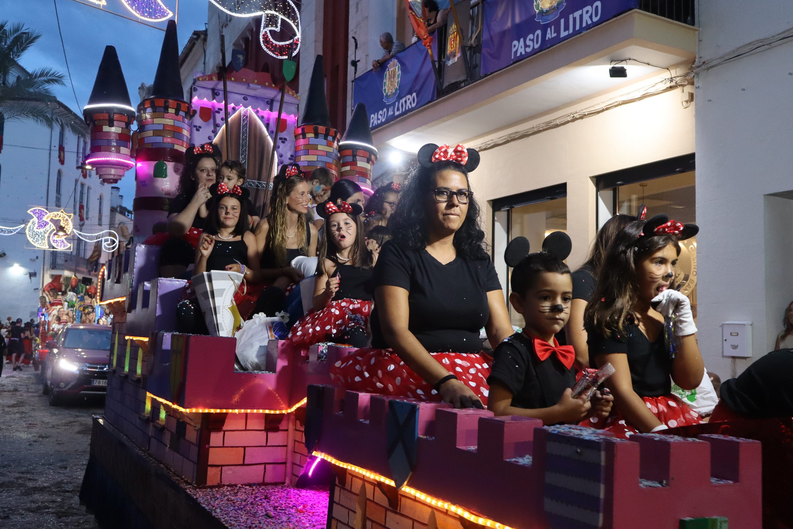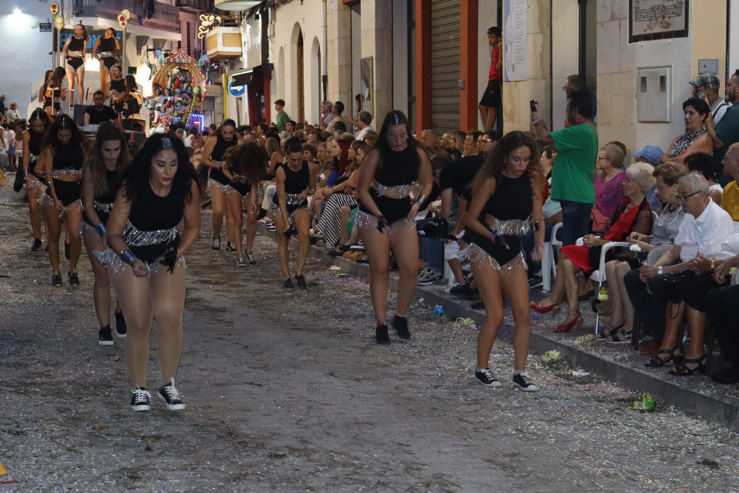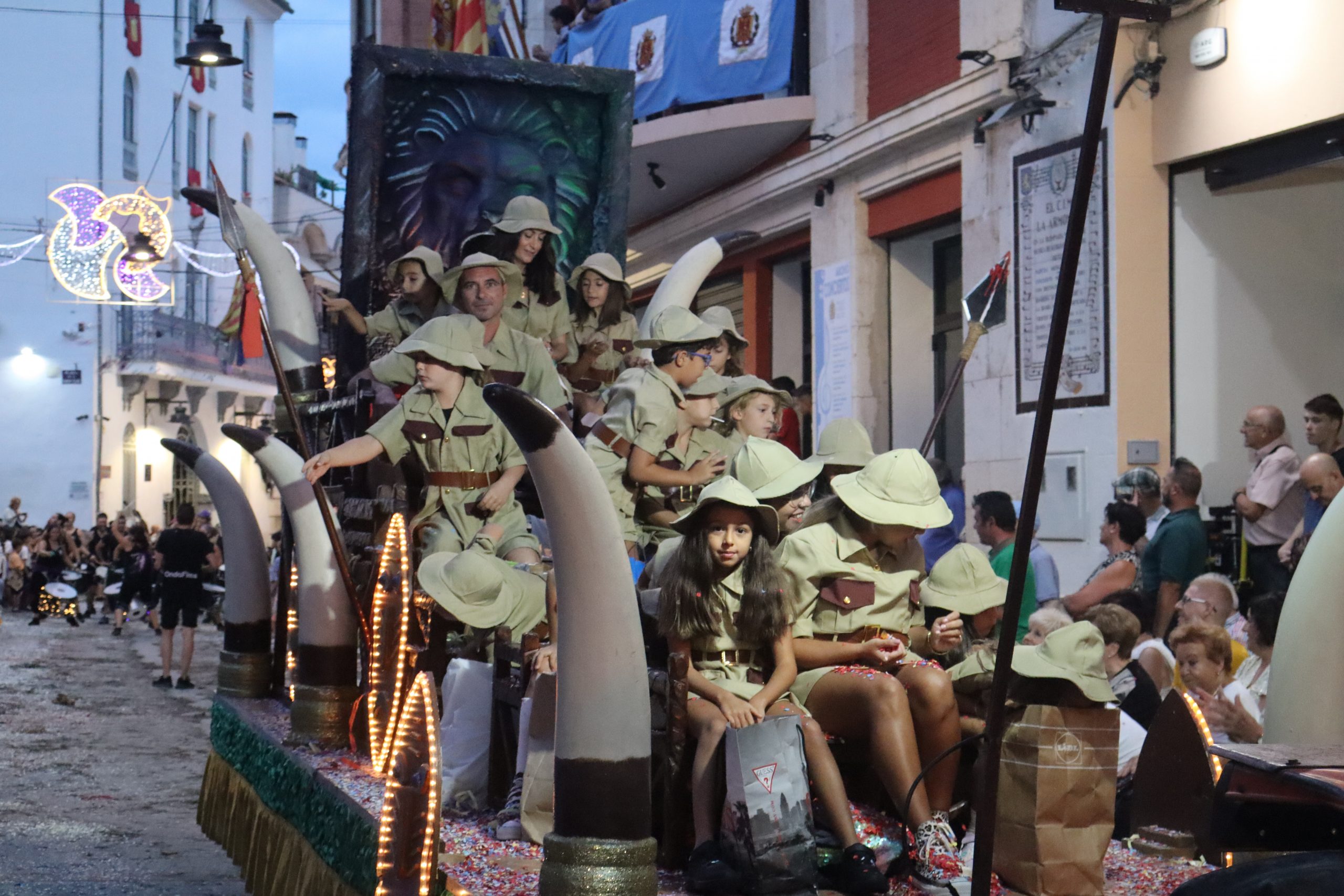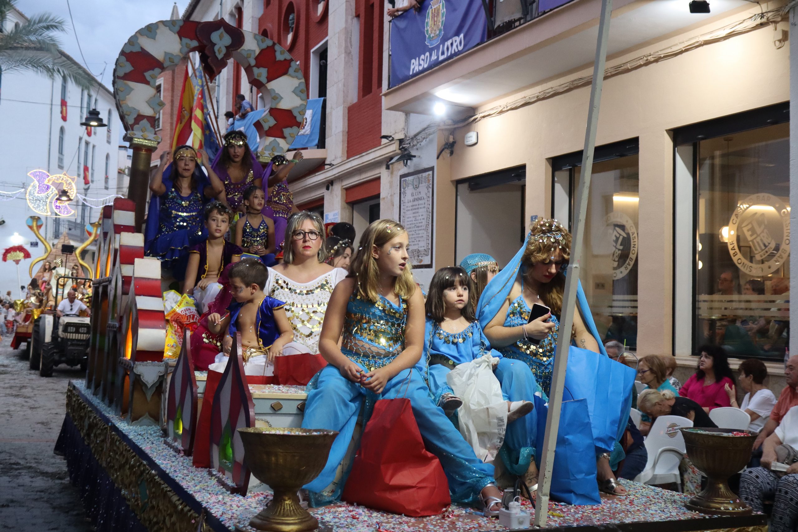 Después de las «filás» vinieron las carrozas: Madres y padres acompañaban a los más pequeños, que repartían caramelos a uno y otro lado. Entre medias, las comparsas de baile, que ensayan durante todo el verano para ofrecer un gran espectáculo el día de su sociedad. Concluyeron el desfile las Misses y Representante del año anterior, todas ellas en carroza. Y andando y con sus respectivas cortes de honor estaban las Misses, Andrea Cano Benedé y Carmen Blasco Cerdán, además de la Representante, Arlén Sánchez Sánchez. La comitiva la cerraba la Banda Sinfónica, encabezada por su presidenta Rosario Pardo y por su director, Saül Gómez.