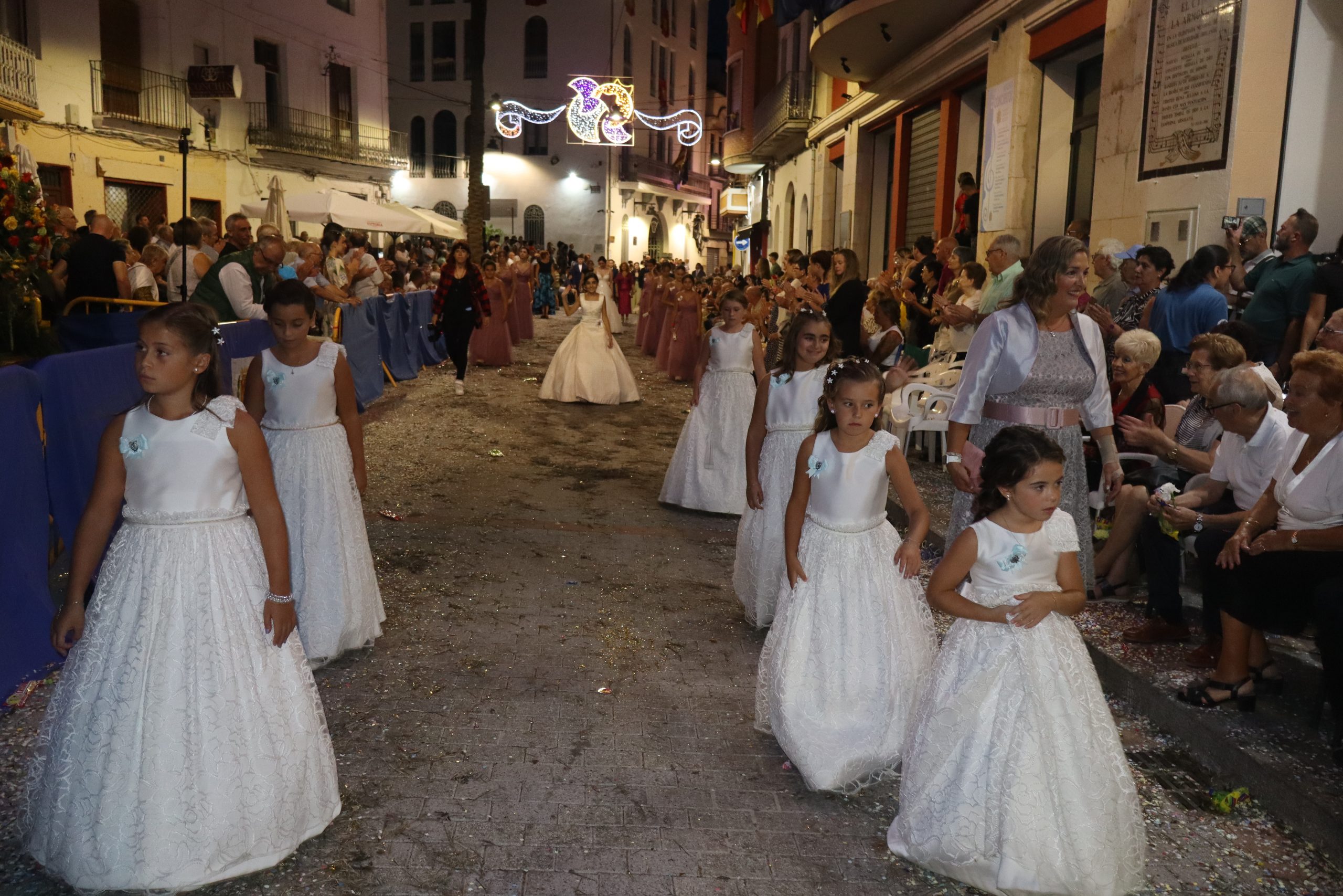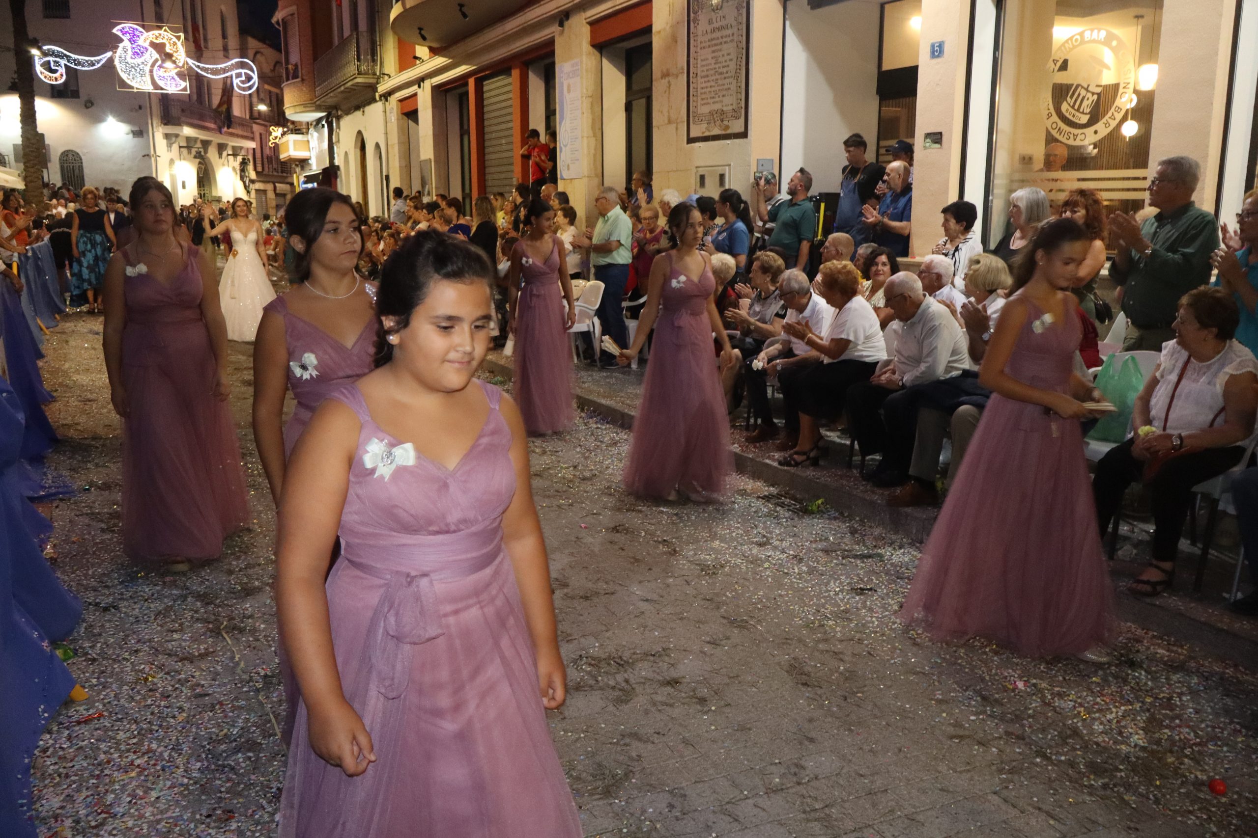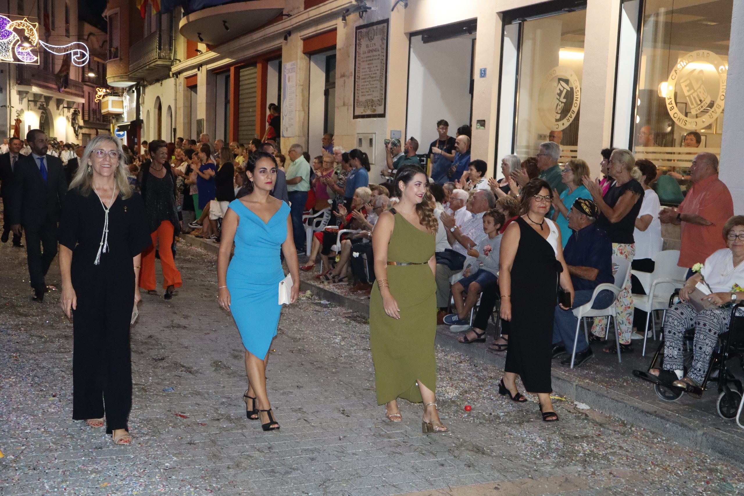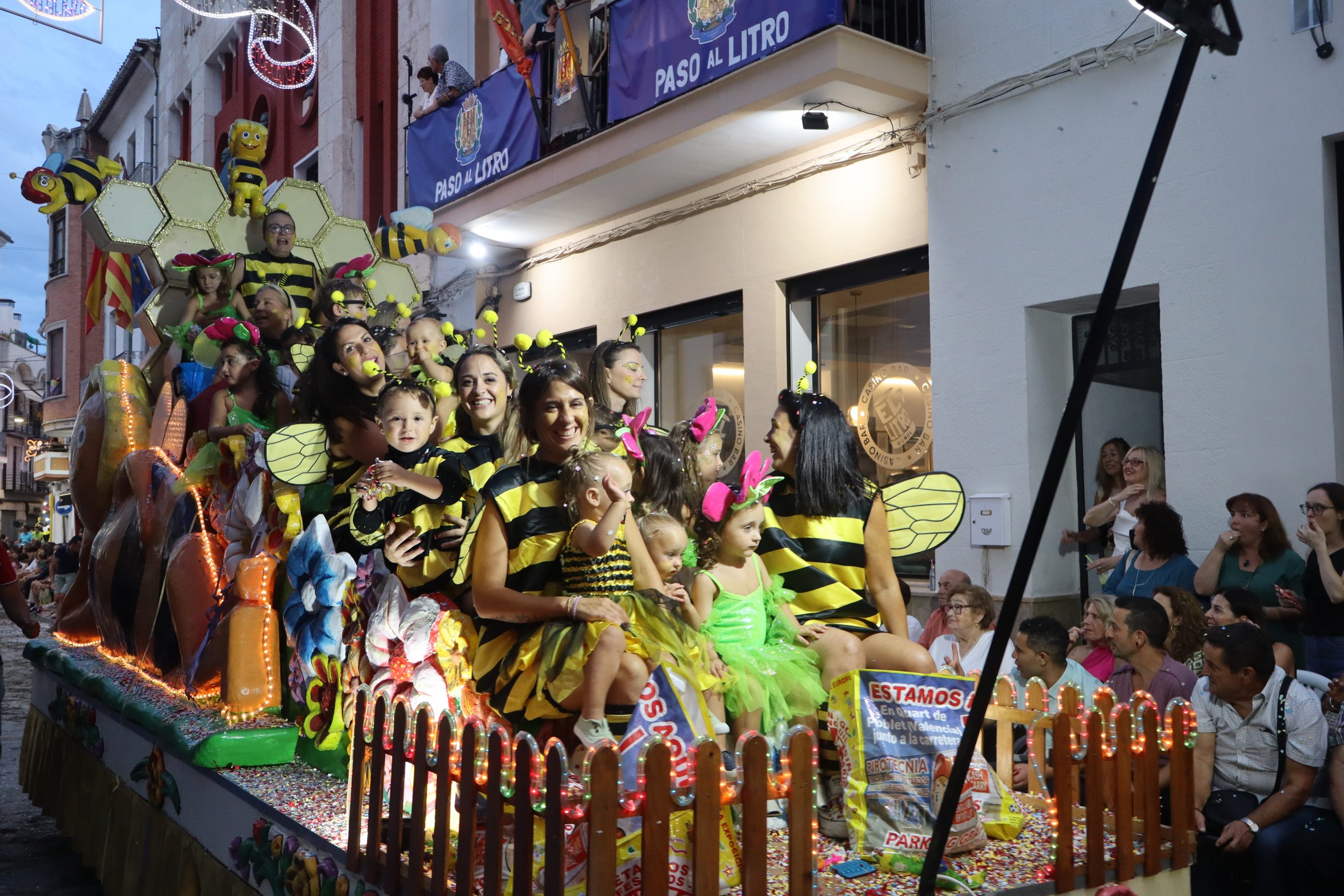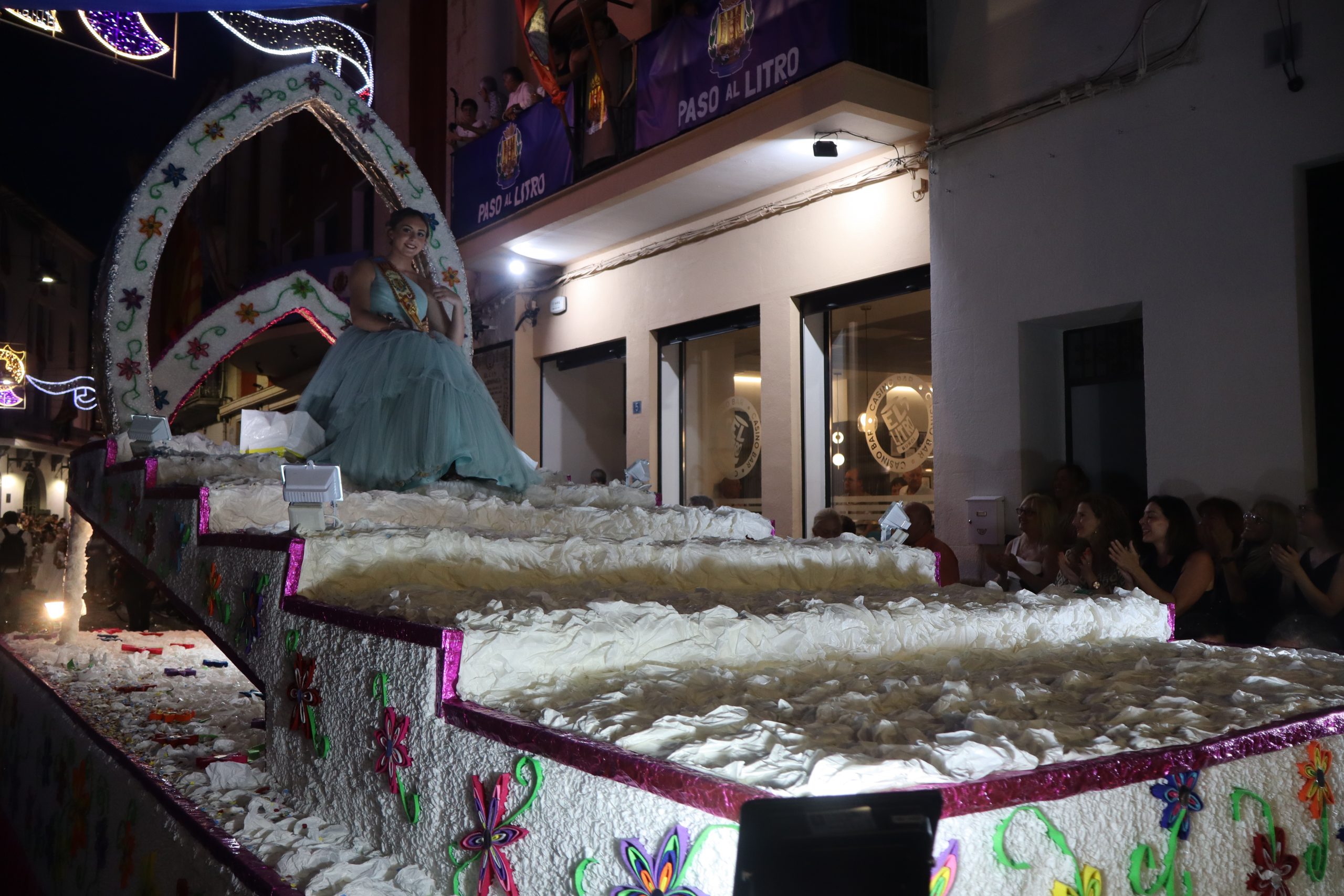 Después de las «filás» vinieron las carrozas: Madres y padres acompañaban a los más pequeños, que repartían caramelos a uno y otro lado. Entre medias, las comparsas de baile, que ensayan durante todo el verano para ofrecer un gran espectáculo el día de su sociedad. Concluyeron el desfile las Misses y Representante del año anterior, todas ellas en carroza. Y andando y con sus respectivas cortes de honor estaban las Misses, Andrea Cano Benedé y Carmen Blasco Cerdán, además de la Representante, Arlén Sánchez Sánchez. La comitiva la cerraba la Banda Sinfónica, encabezada por su presidenta Rosario Pardo y por su director, Saül Gómez.