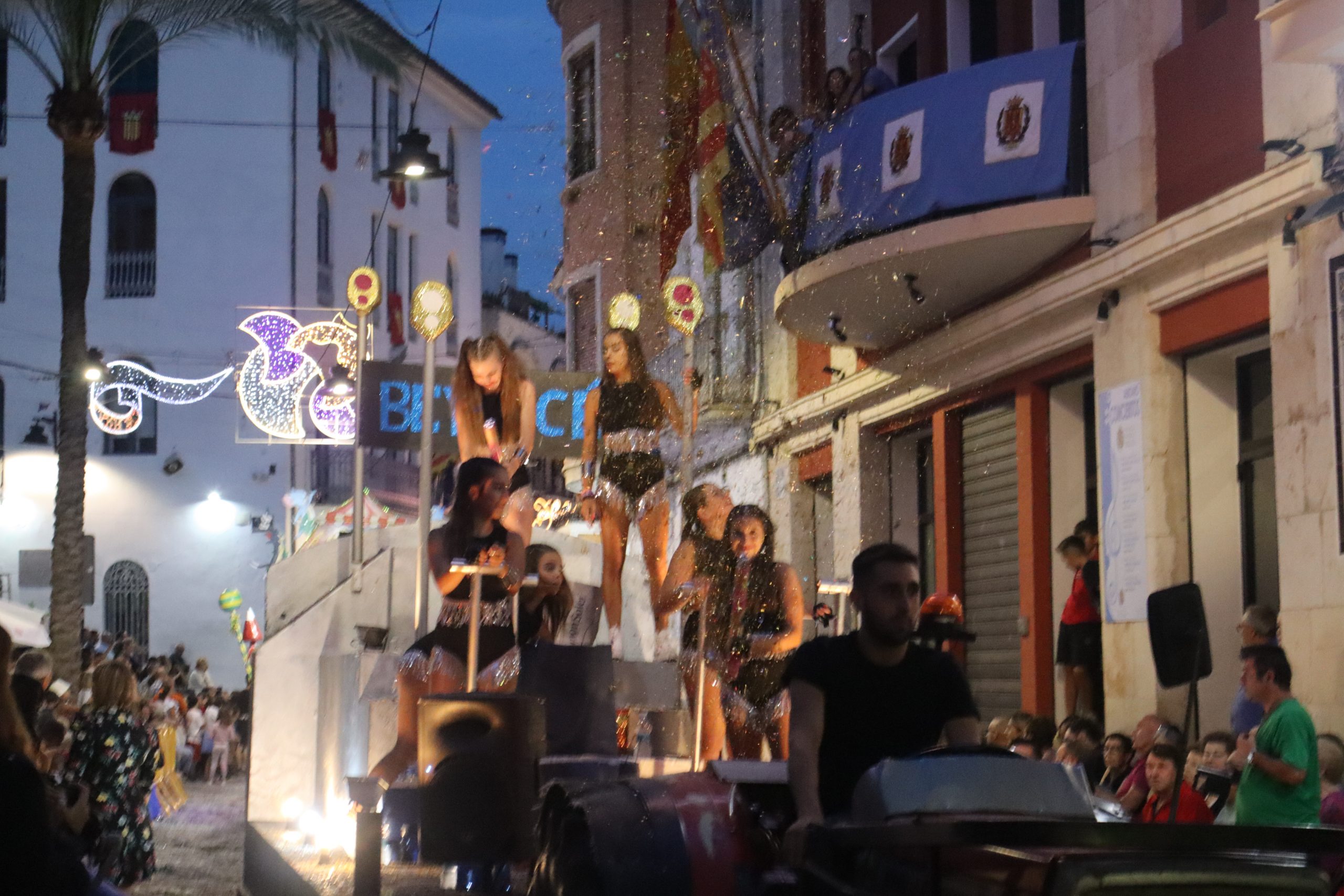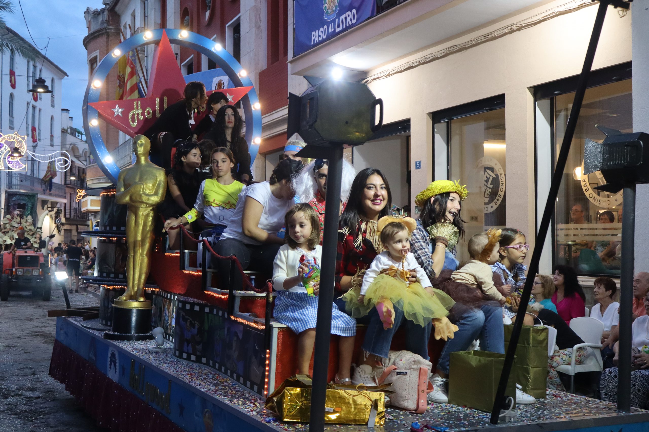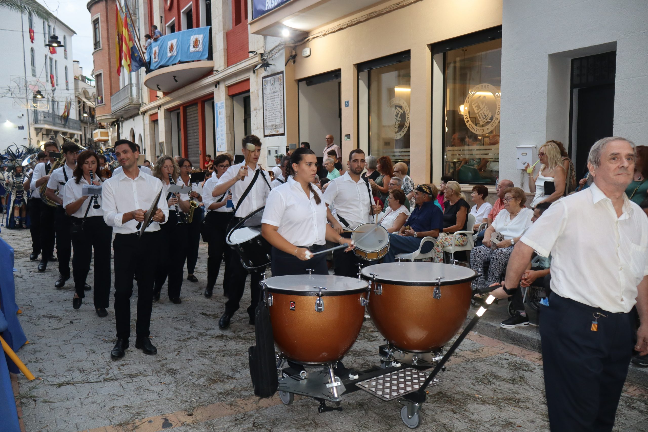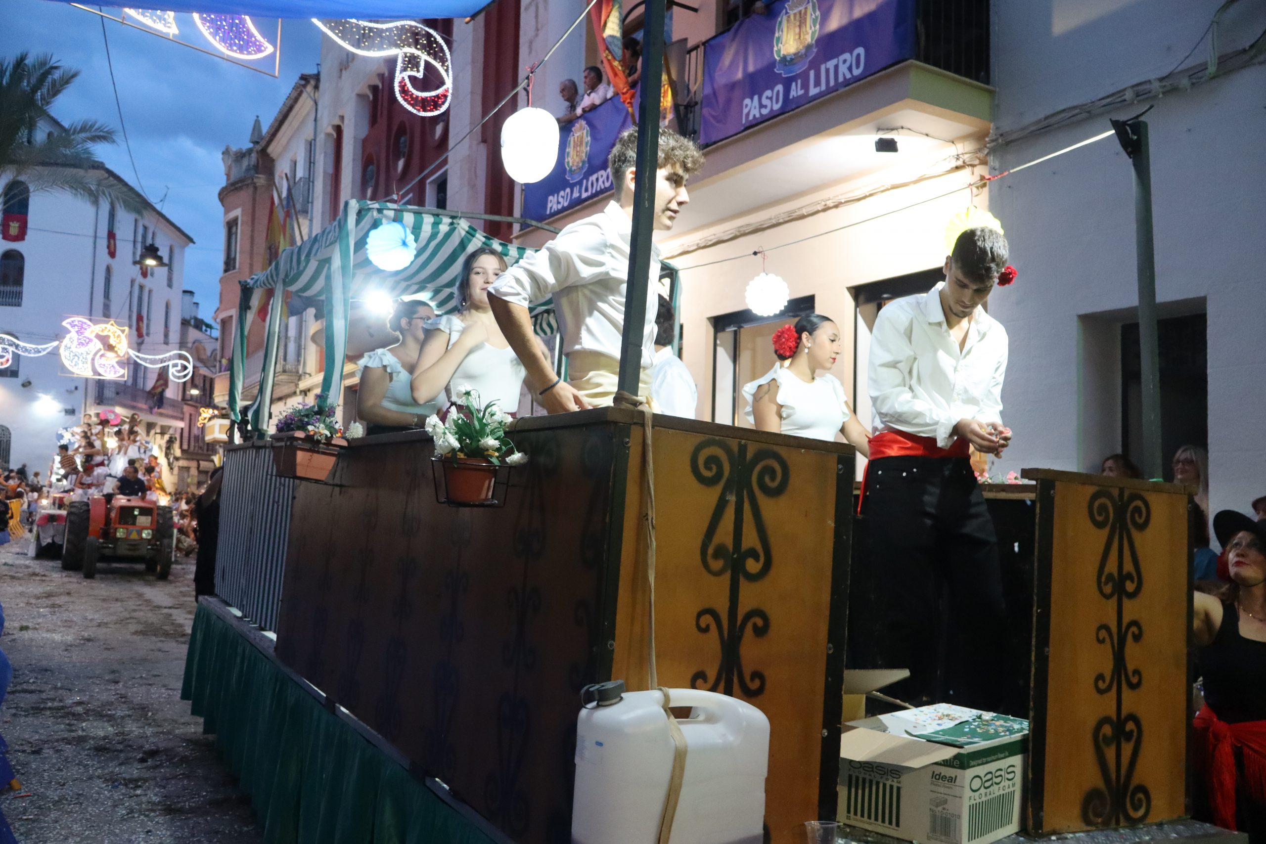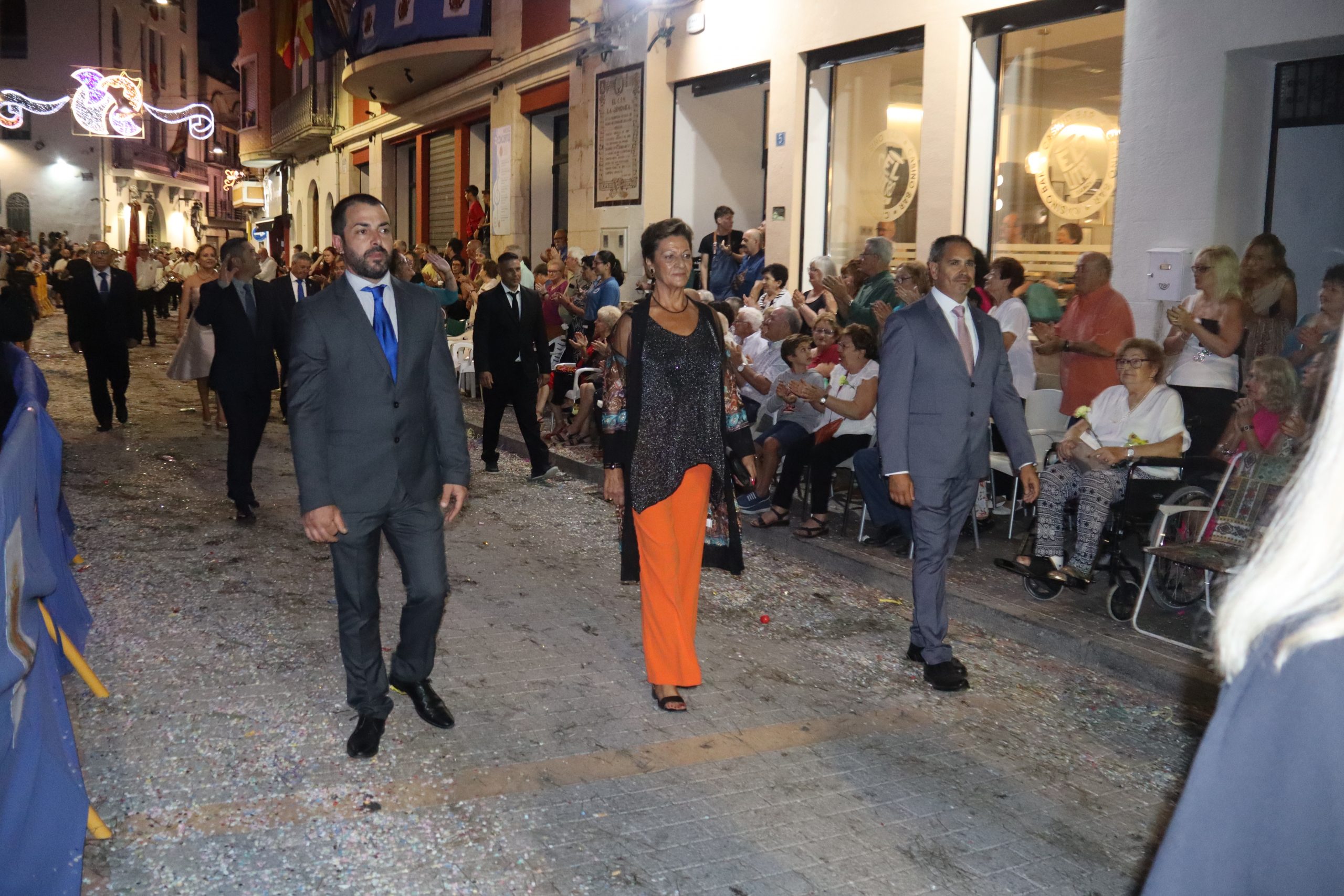 Después de las «filás» vinieron las carrozas: Madres y padres acompañaban a los más pequeños, que repartían caramelos a uno y otro lado. Entre medias, las comparsas de baile, que ensayan durante todo el verano para ofrecer un gran espectáculo el día de su sociedad. Concluyeron el desfile las Misses y Representante del año anterior, todas ellas en carroza. Y andando y con sus respectivas cortes de honor estaban las Misses, Andrea Cano Benedé y Carmen Blasco Cerdán, además de la Representante, Arlén Sánchez Sánchez. La comitiva la cerraba la Banda Sinfónica, encabezada por su presidenta Rosario Pardo y por su director, Saül Gómez.