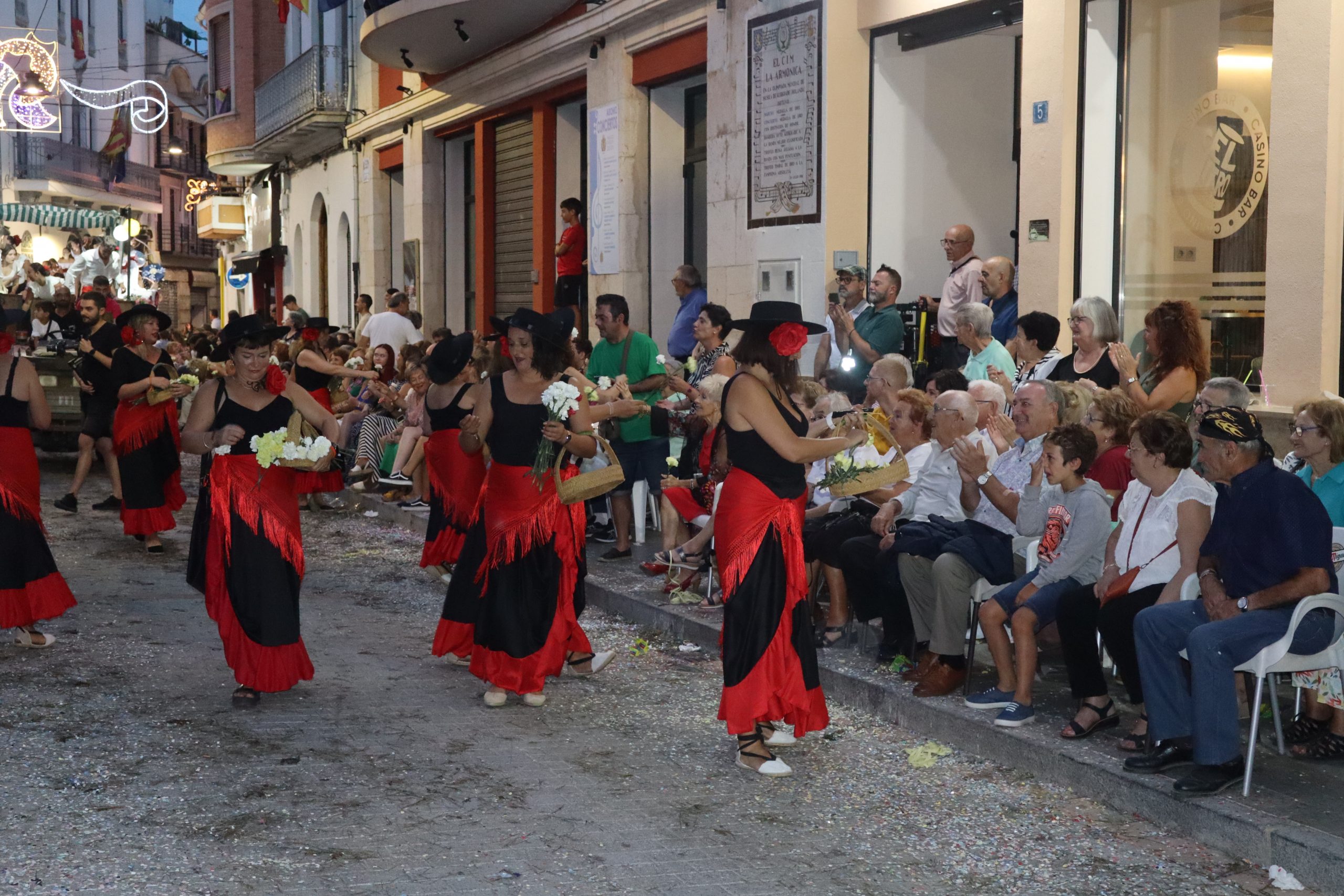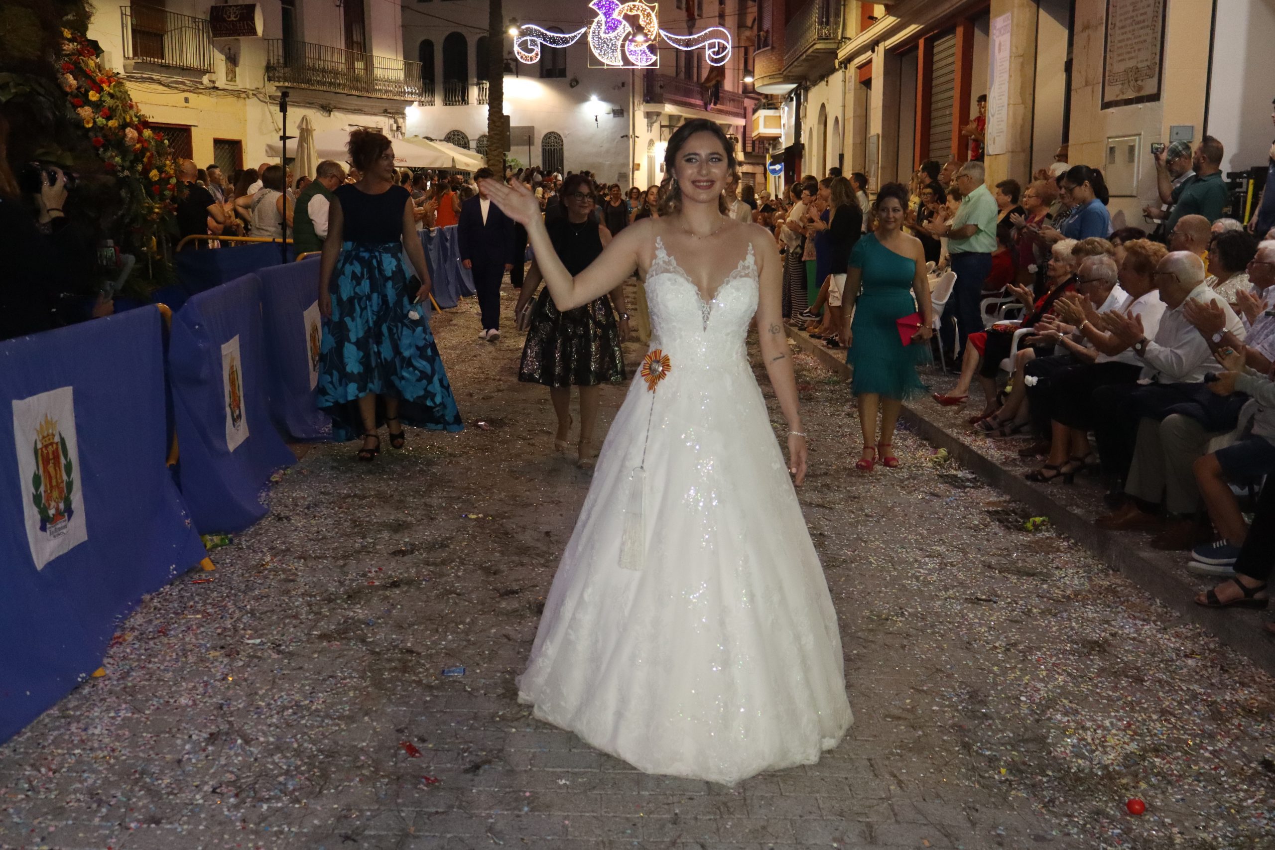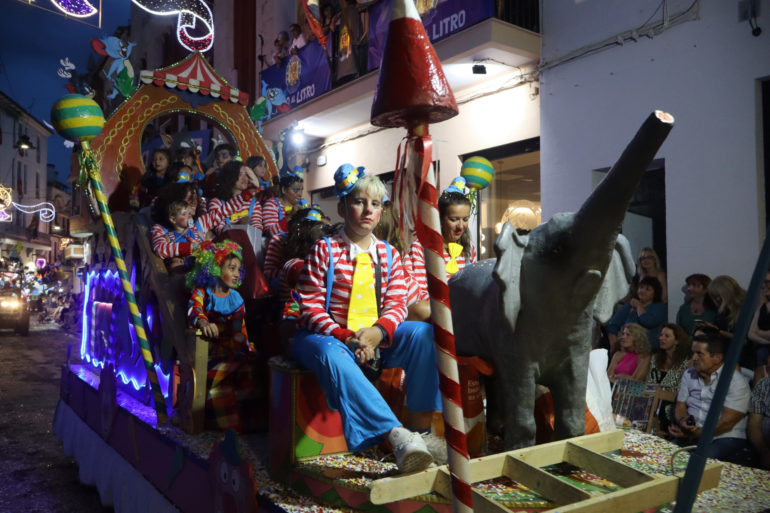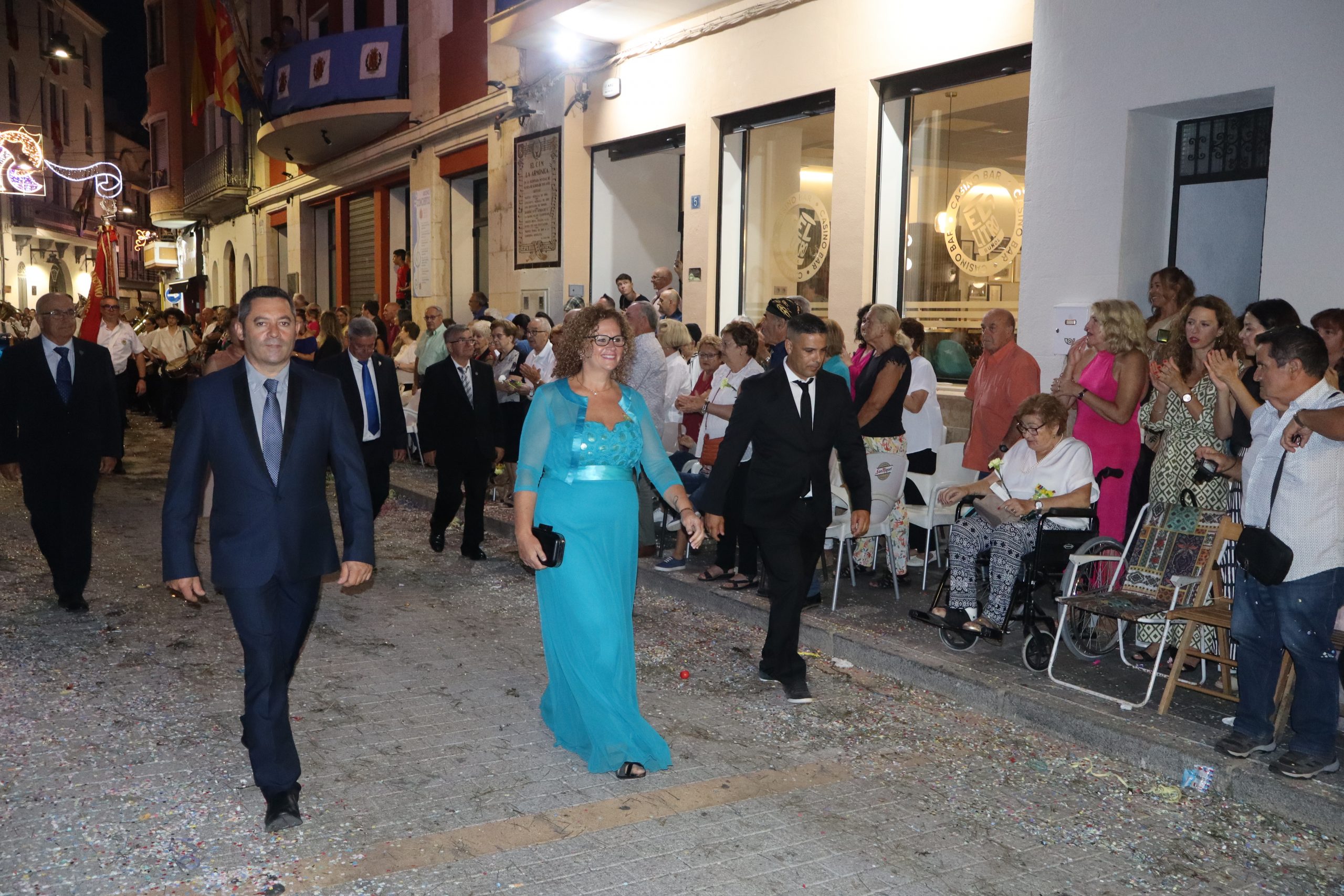 Después de las «filás» vinieron las carrozas: Madres y padres acompañaban a los más pequeños, que repartían caramelos a uno y otro lado. Entre medias, las comparsas de baile, que ensayan durante todo el verano para ofrecer un gran espectáculo el día de su sociedad. Concluyeron el desfile las Misses y Representante del año anterior, todas ellas en carroza. Y andando y con sus respectivas cortes de honor estaban las Misses, Andrea Cano Benedé y Carmen Blasco Cerdán, además de la Representante, Arlén Sánchez Sánchez. La comitiva la cerraba la Banda Sinfónica, encabezada por su presidenta Rosario Pardo y por su director, Saül Gómez.