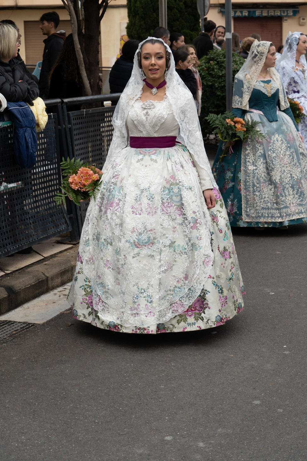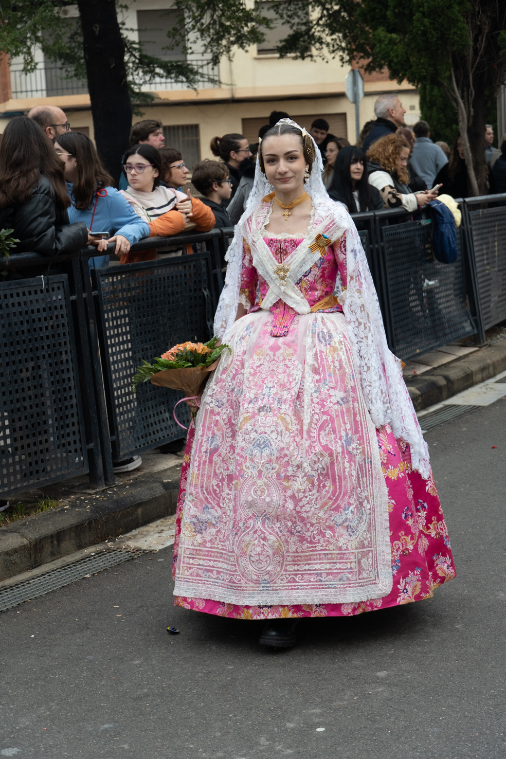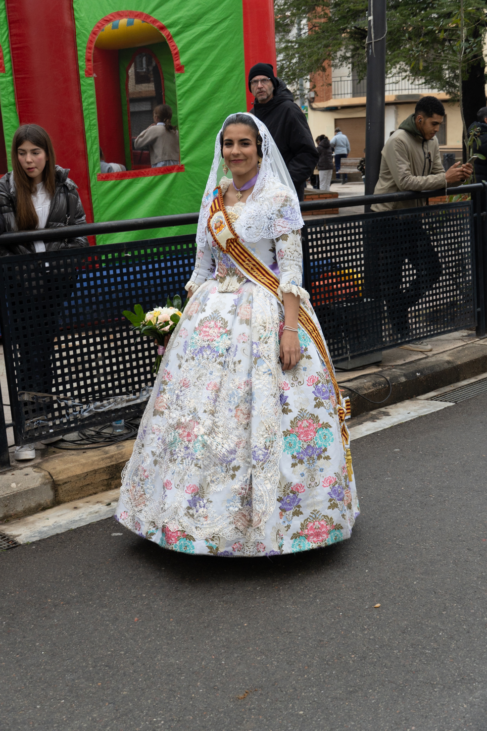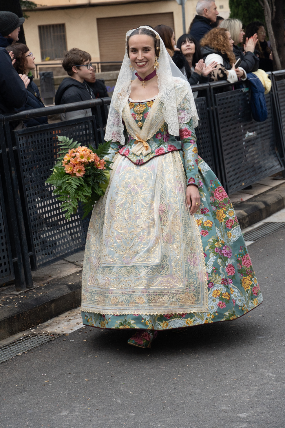 La comitiva partió desde la Plaza Rivero y recorrió un itinerario abarrotado de público, especialmente en el emblemático Puente de la Venta y la Calle Condes de Buñol. Entre la emoción y el fervor fallero, Dafne Font depositó su ramo y se inmortalizó en una foto junto a su comisión de El Prado. Lo mismo hicieron Raquel Cámara y Carmen Valls con la falla de Las Ventas, acompañadas por su familia fallera.