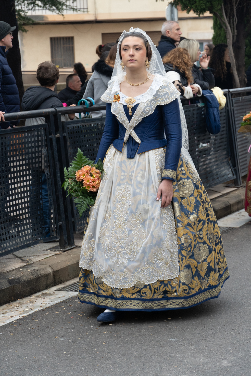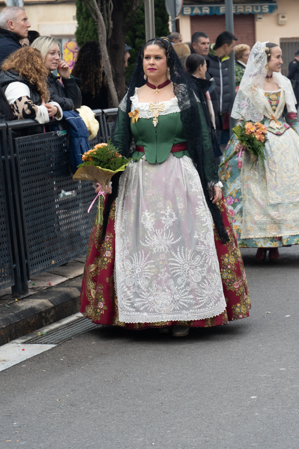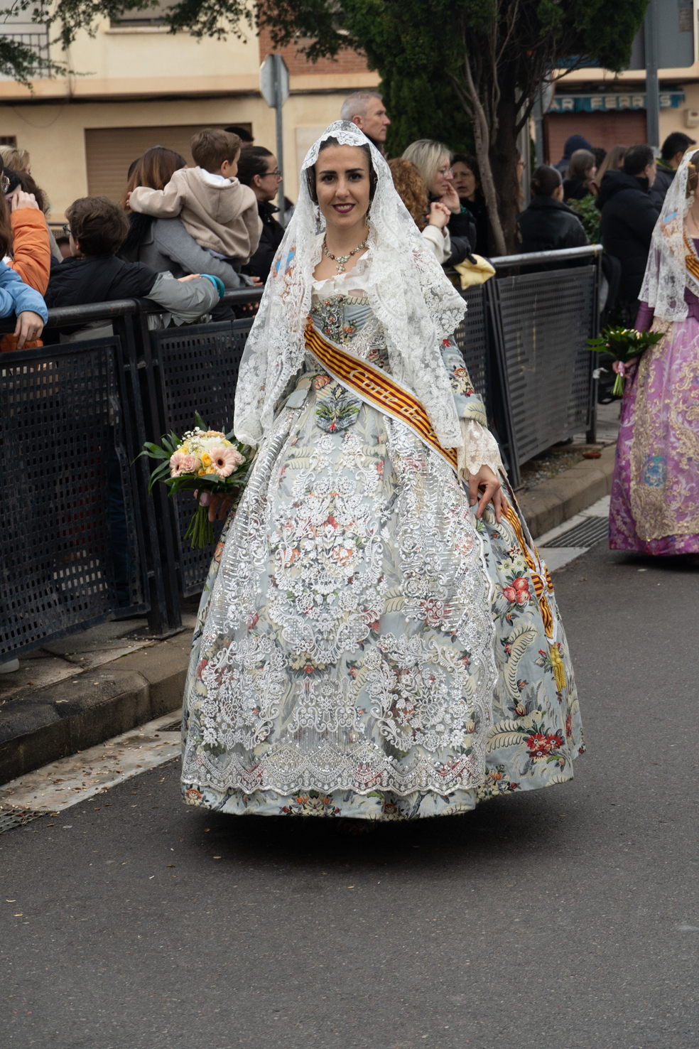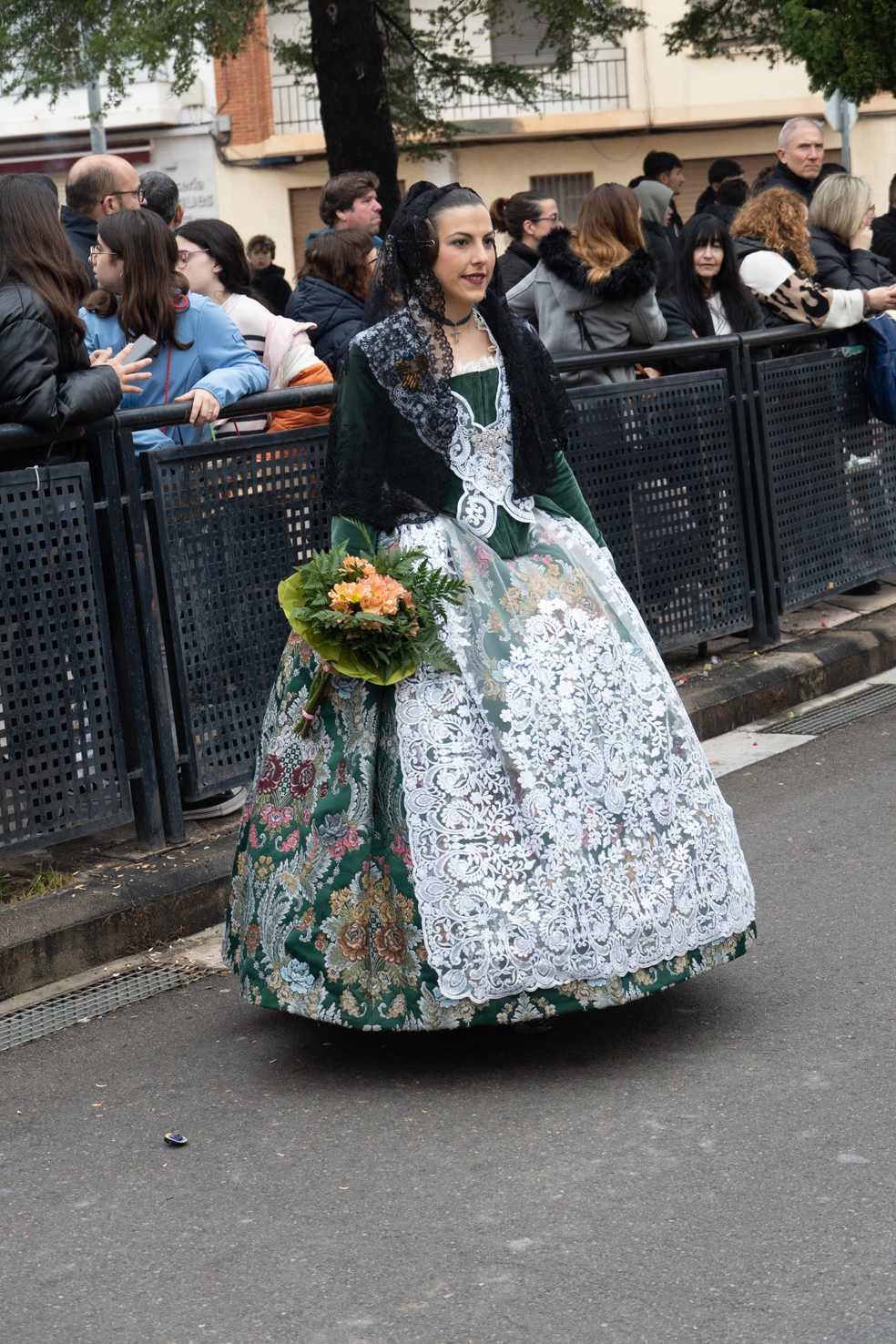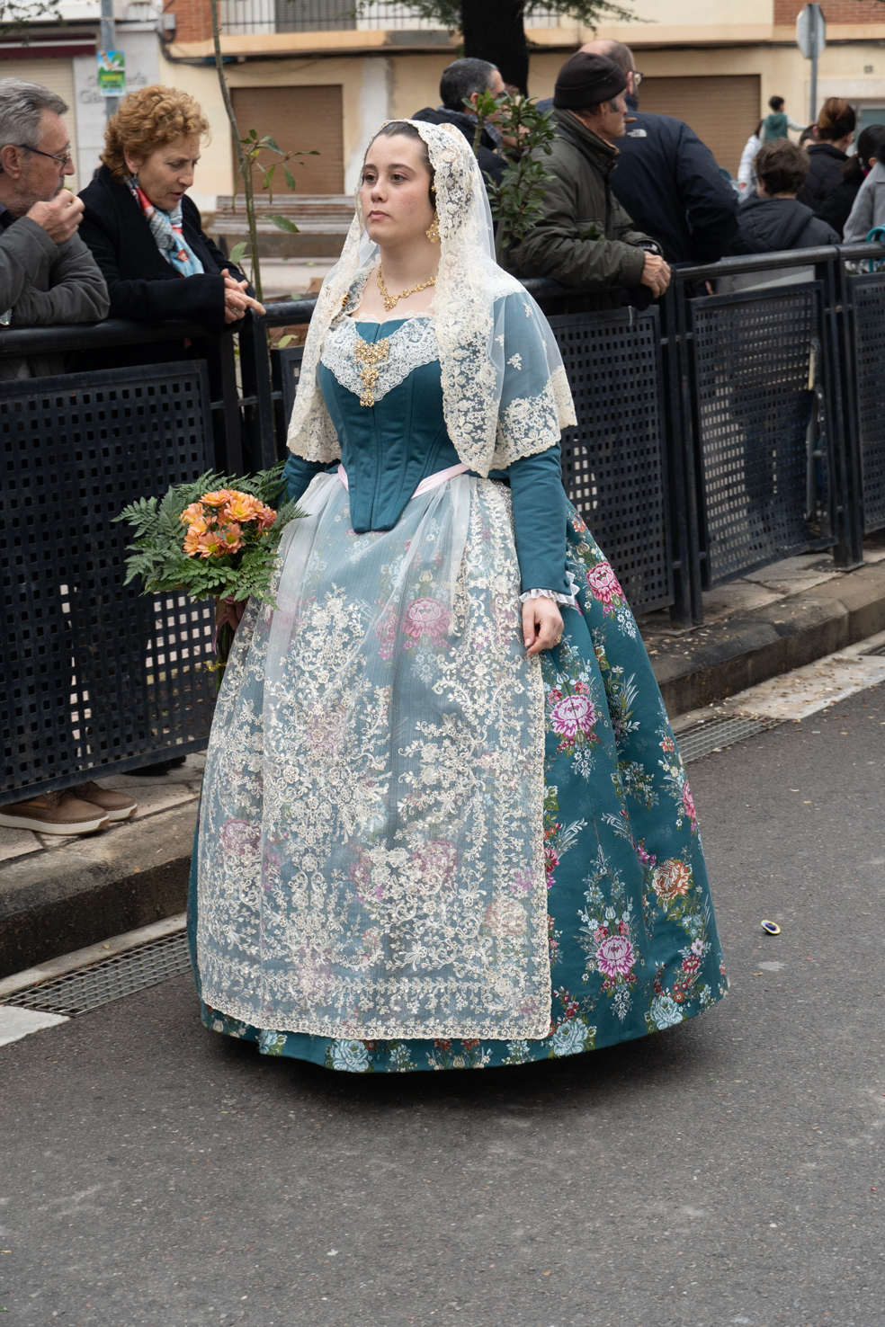 La comitiva partió desde la Plaza Rivero y recorrió un itinerario abarrotado de público, especialmente en el emblemático Puente de la Venta y la Calle Condes de Buñol. Entre la emoción y el fervor fallero, Dafne Font depositó su ramo y se inmortalizó en una foto junto a su comisión de El Prado. Lo mismo hicieron Raquel Cámara y Carmen Valls con la falla de Las Ventas, acompañadas por su familia fallera.