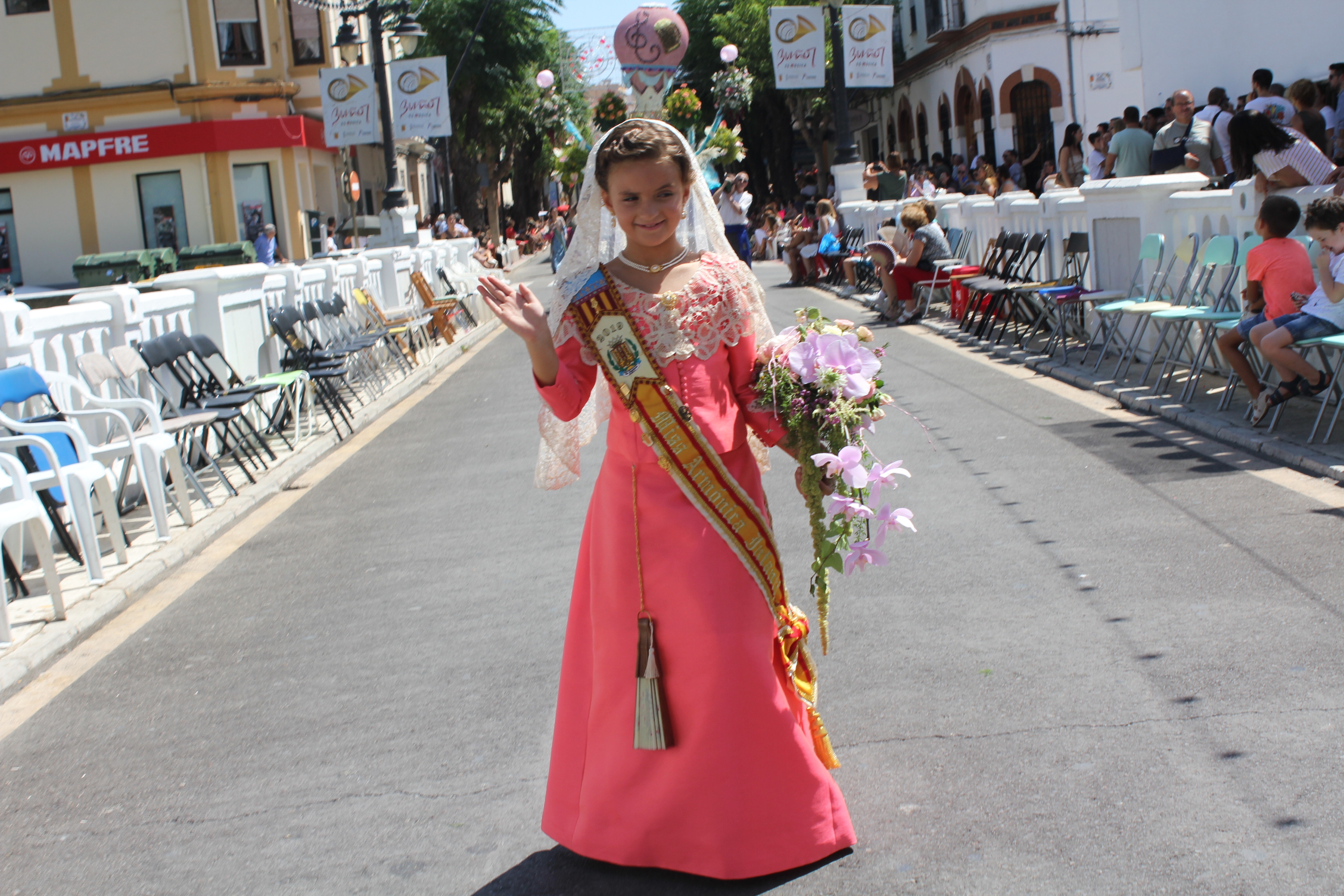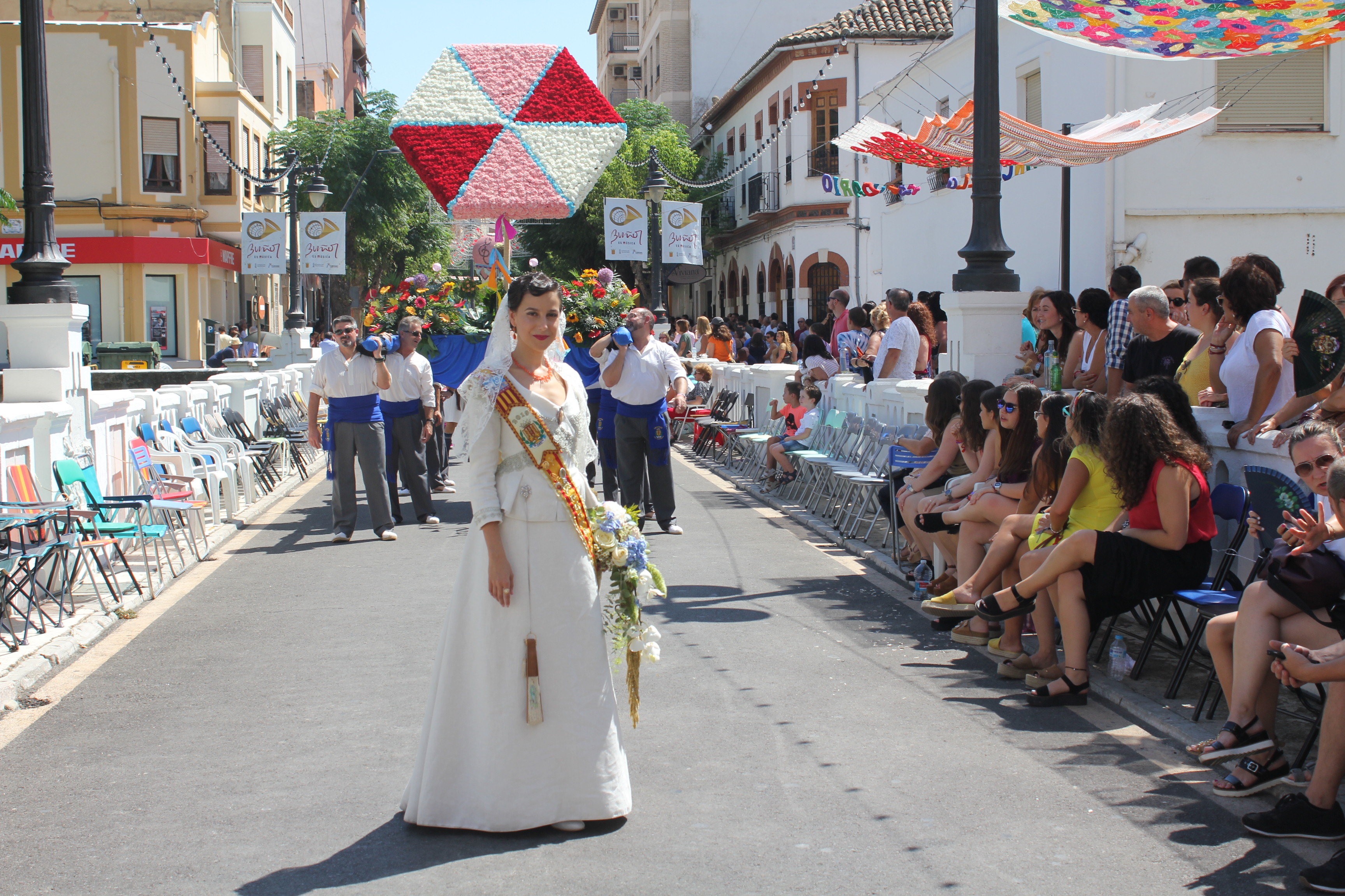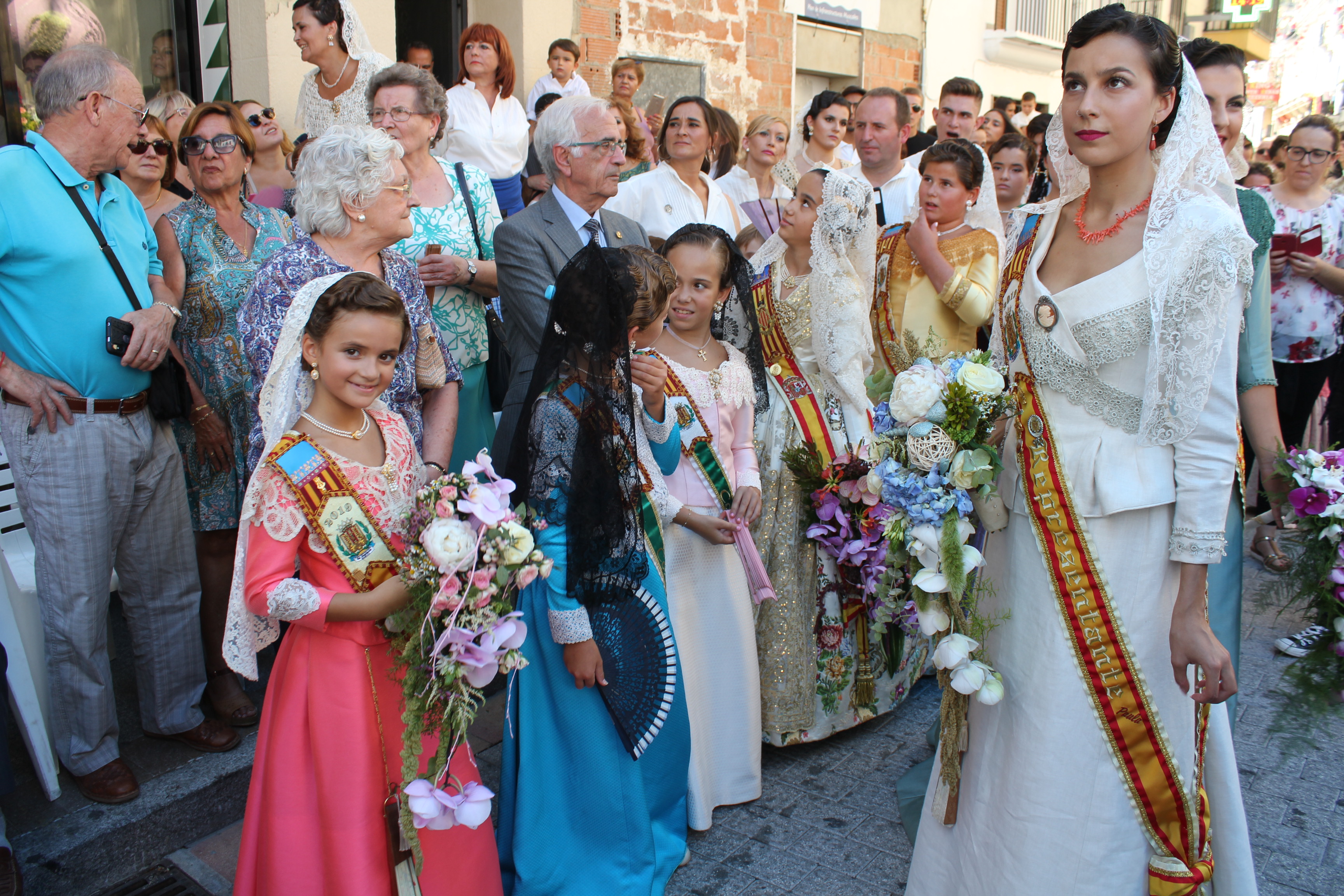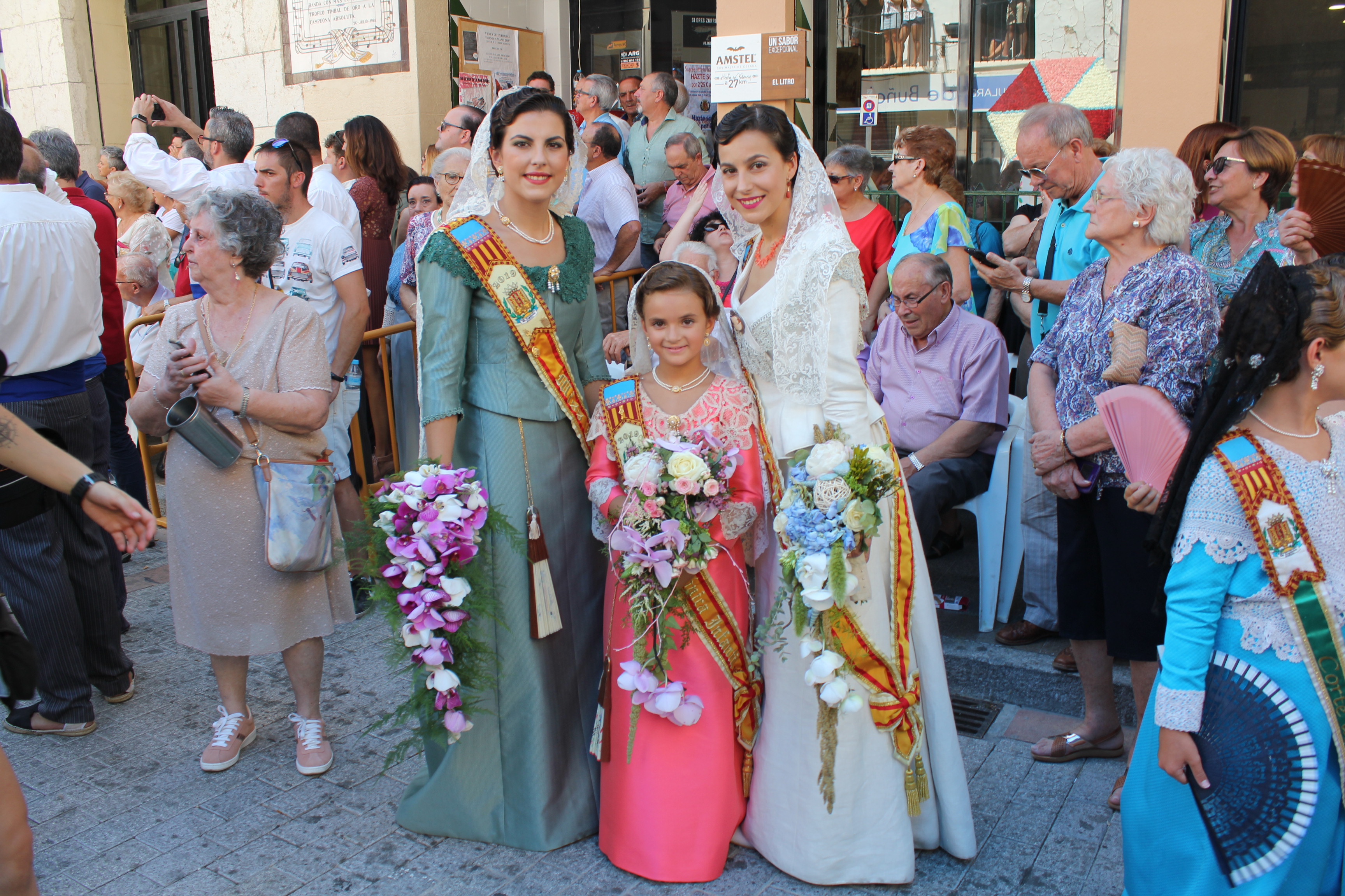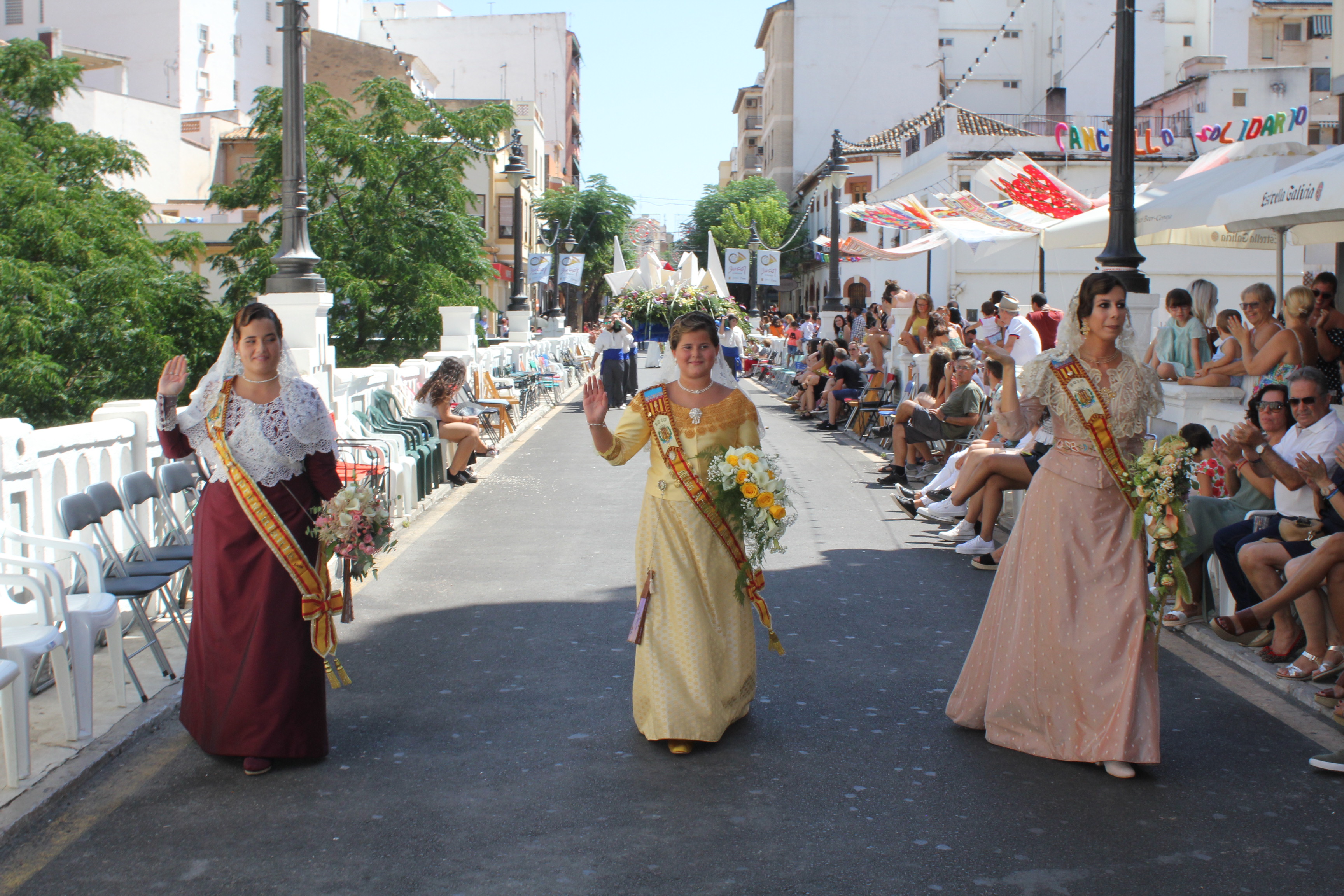 Las últimas andas iban acompañando a las protagonistas del día a las Misses y Representante, Esther Furriol Ochea, Gema Clemente Agustina y Paula Ramón Martínez. Las tres entraron a la Plaza del Pueblo emocionadas ante el aplauso del público y de los simpatizantes «lietreros» que se agolparon a uno y otro lado de su local social. También los vítores fueron en aumento cada vez que cada cuadrilla de «anderos» daba las tradicionales vueltas a los monumentos florales que salieron en la Ofrenda.
